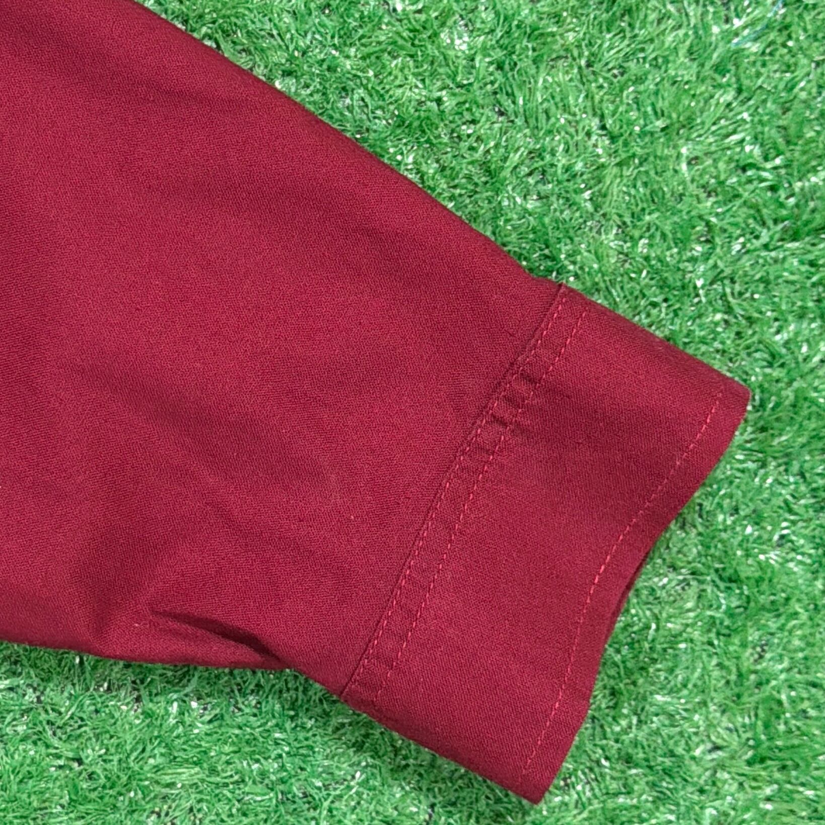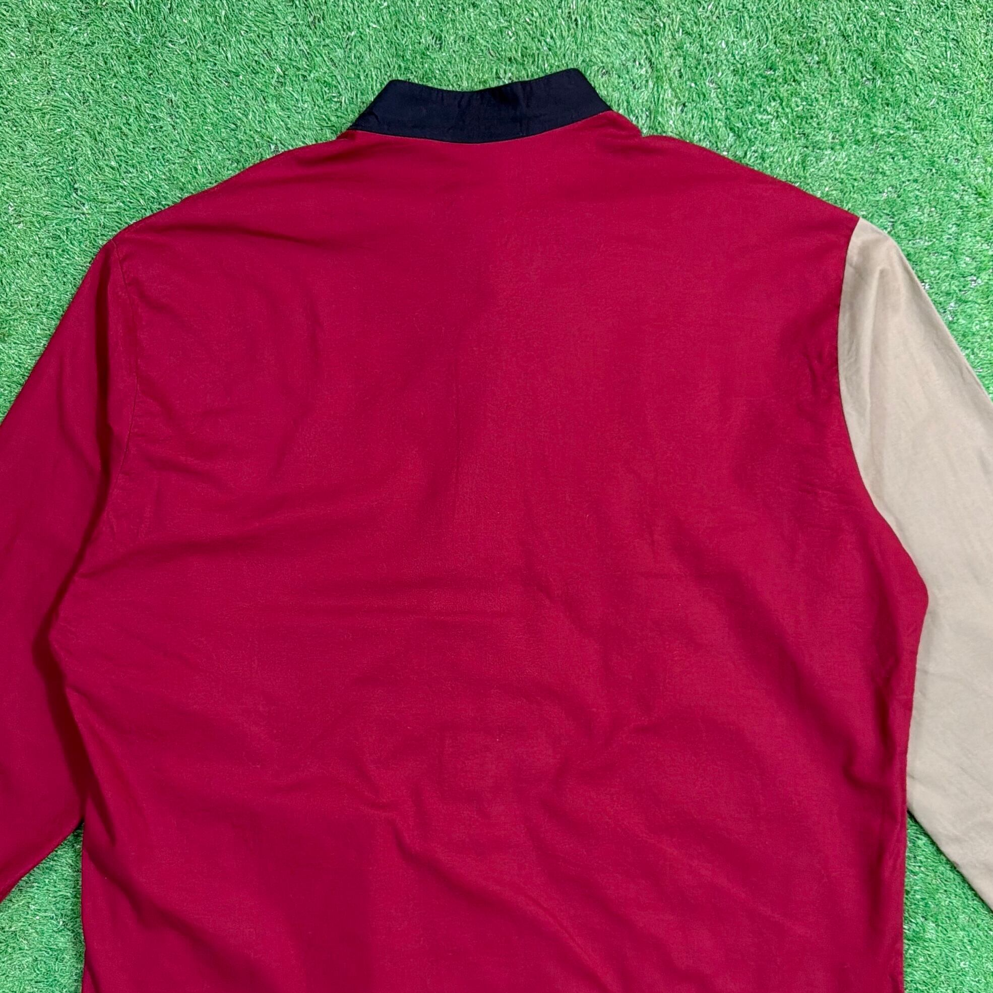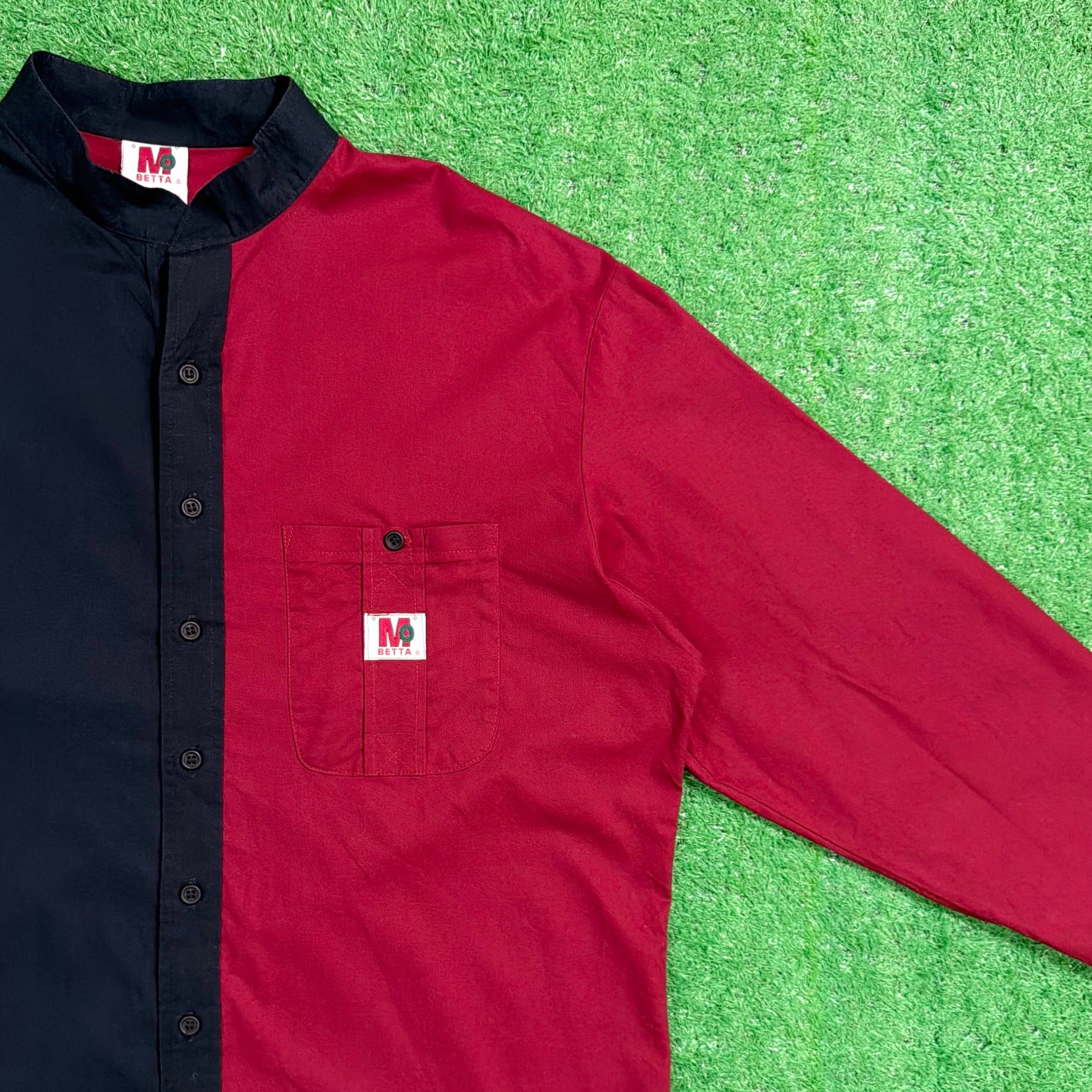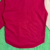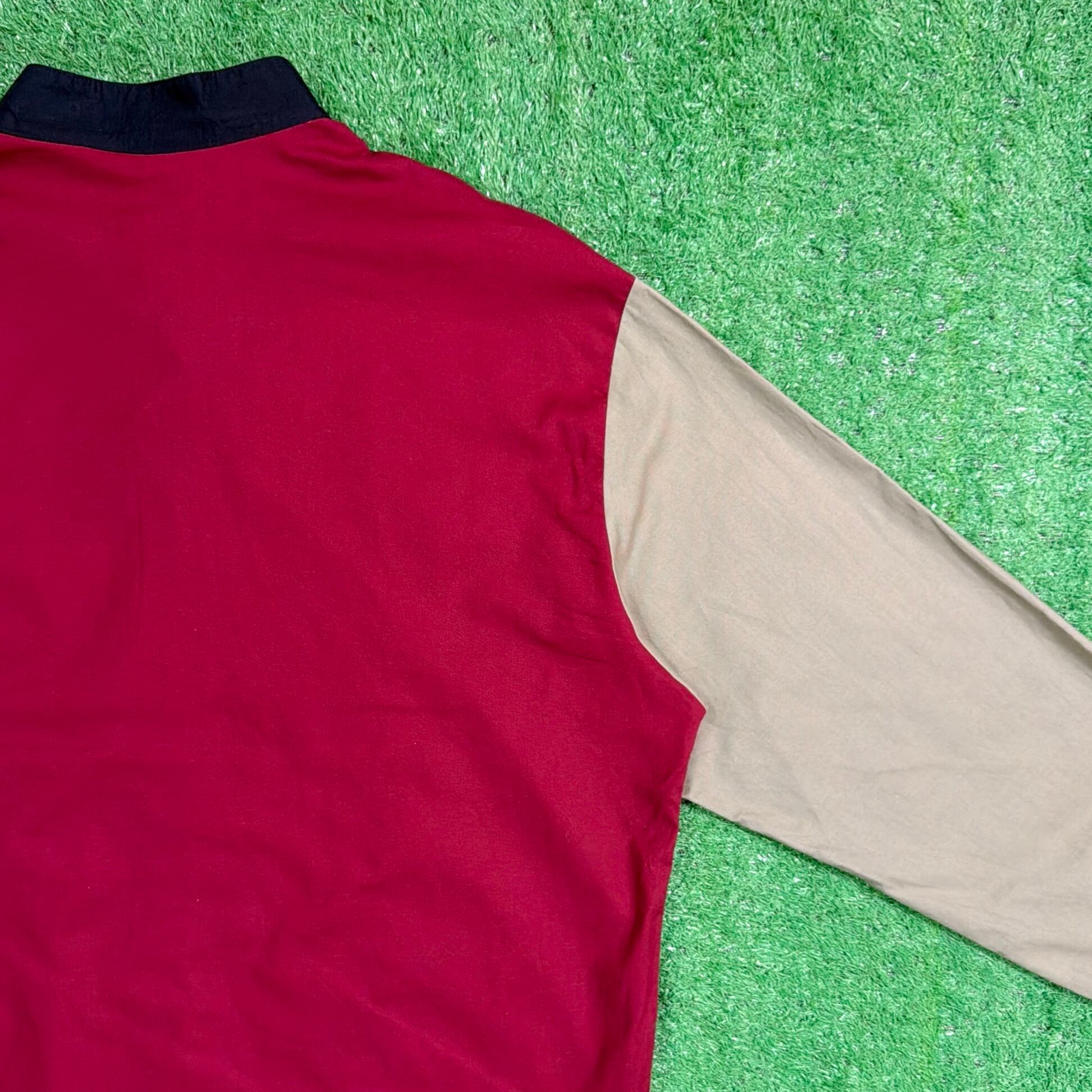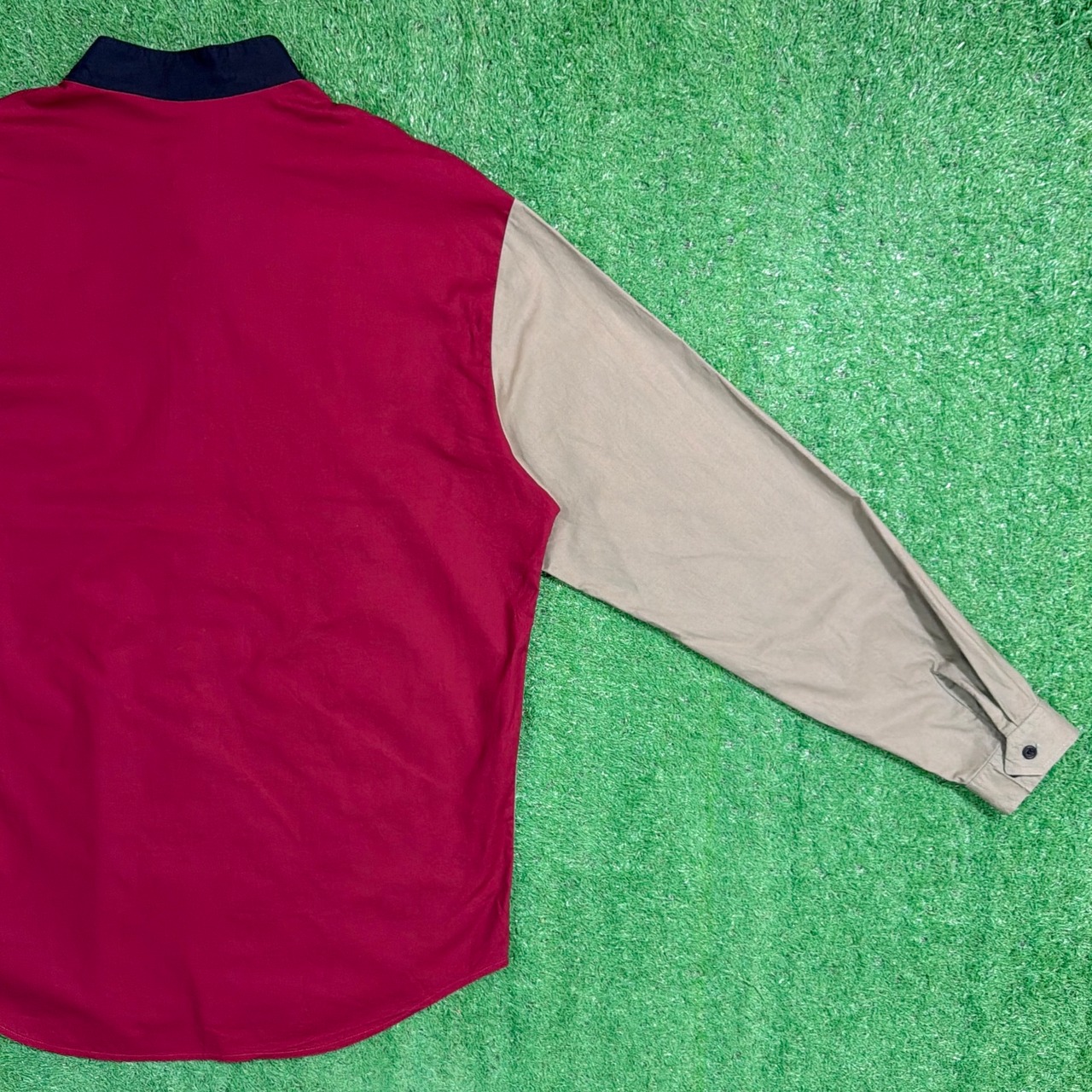 レッド・ベージュ・ネイビーの大胆な切り替えが目を引くデザインで、シンプルなシャツながらしっかり存在感のある一枚。フロントの配色バランスが特徴的で、コーディネートの主役になるアイテムです。