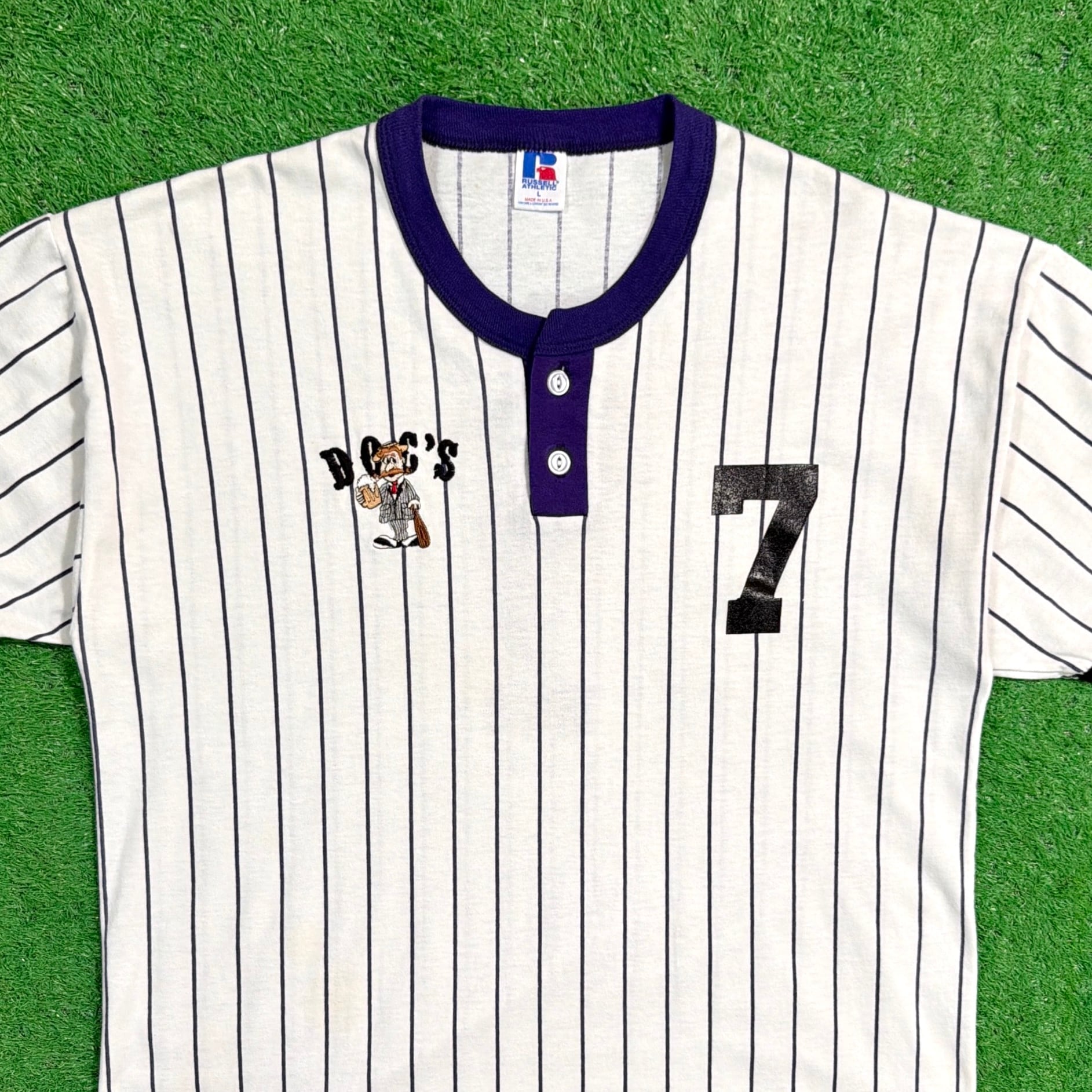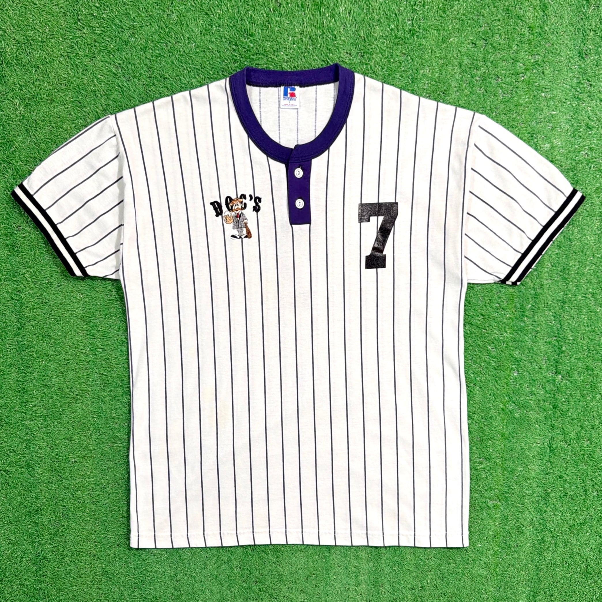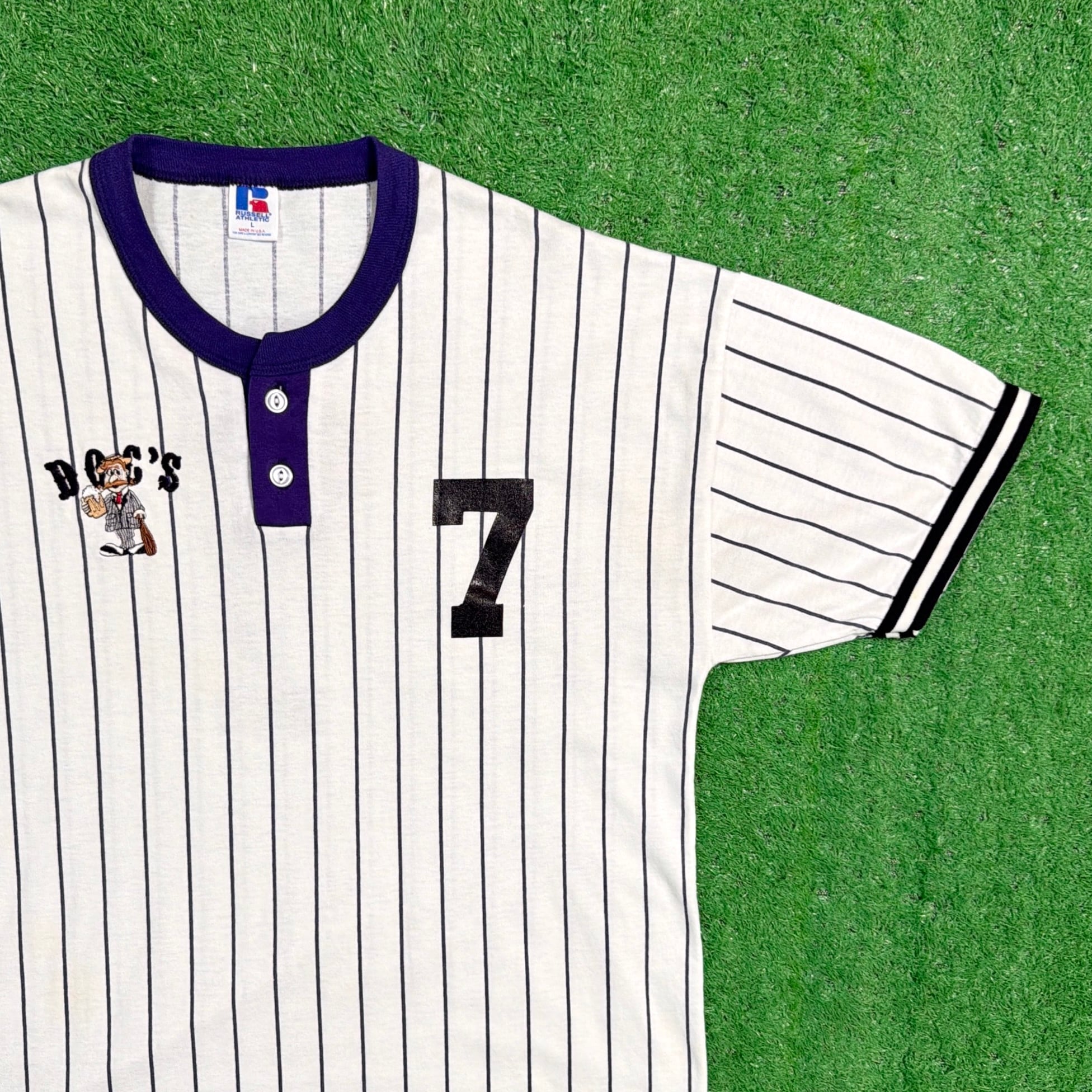 【Men's】 90s 刺繍入り ヘンリーネック ベースボール Tシャツ / アメリカ製 USA製 90年代 ティーシャツ T-Shirt 古着 RUSSEL メンズ ストライプ 1668