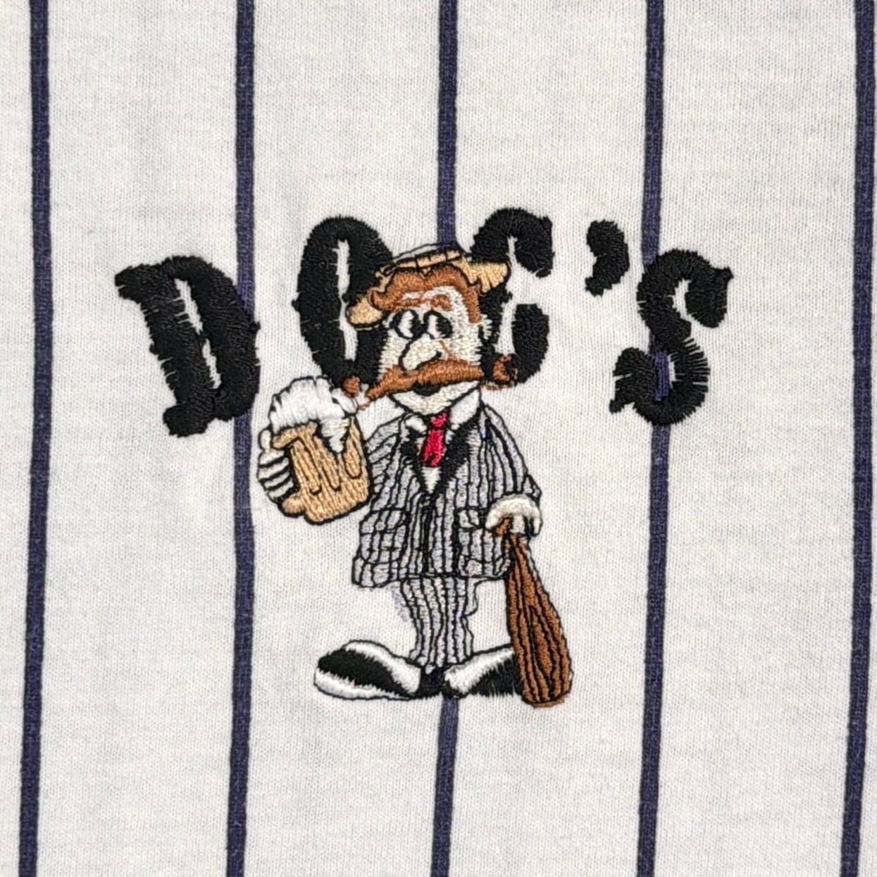 胸元にはキャラクター刺繍とロゴが入り、ローカルチームや企業チームのユニフォームと思われる、古着ならではの一点物感も魅力です。首元はヘンリーネック仕様で、程よくラフな印象に。スポーティーながらもファッションとして取り入れやすいデザインです。