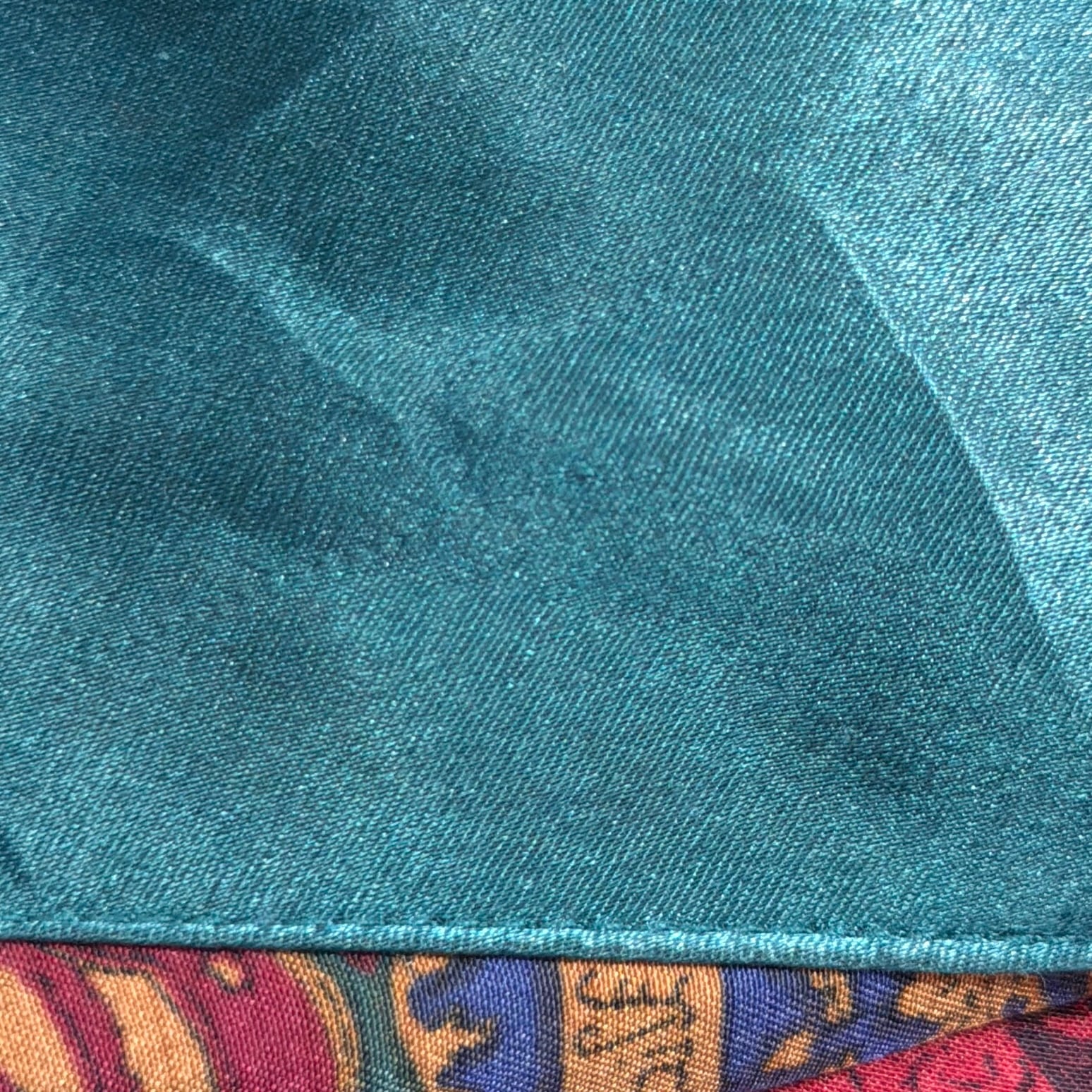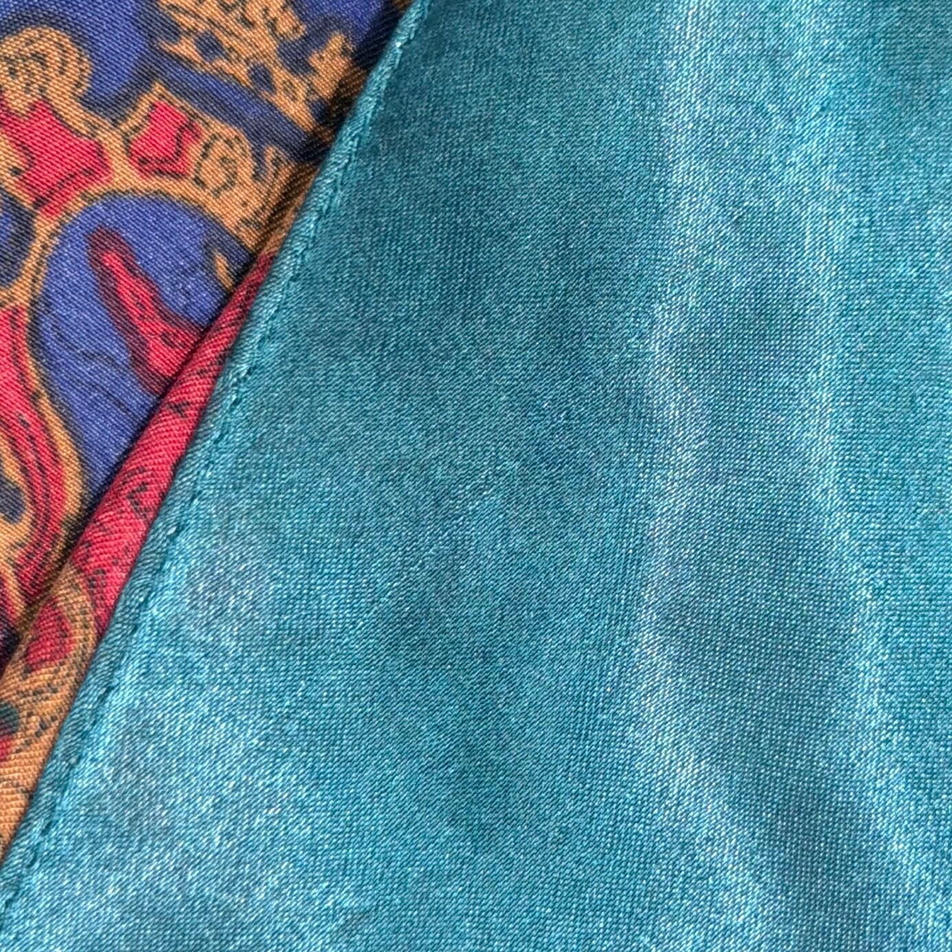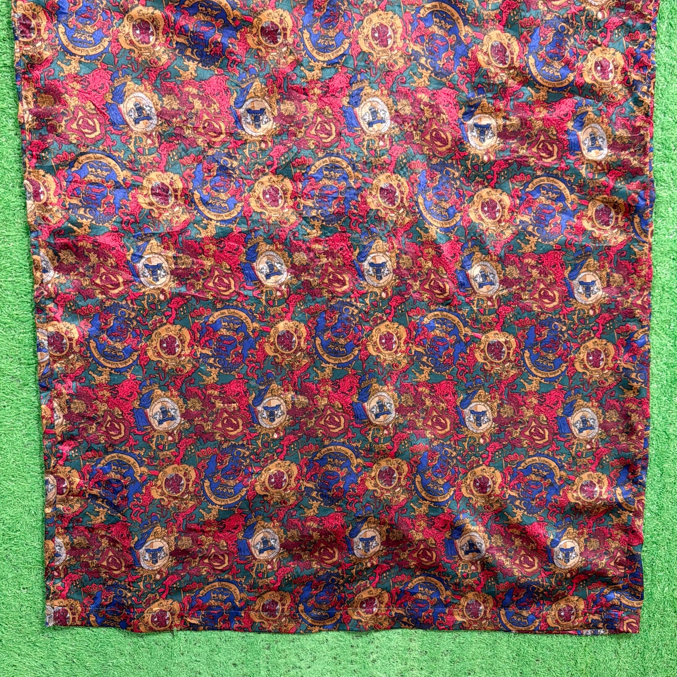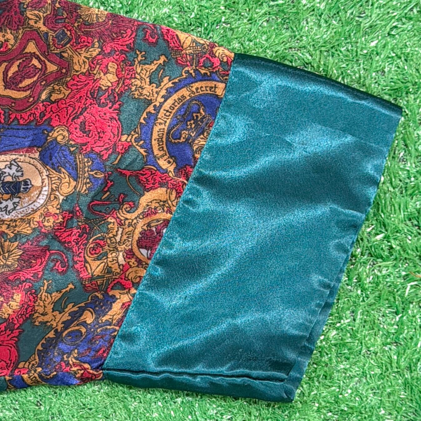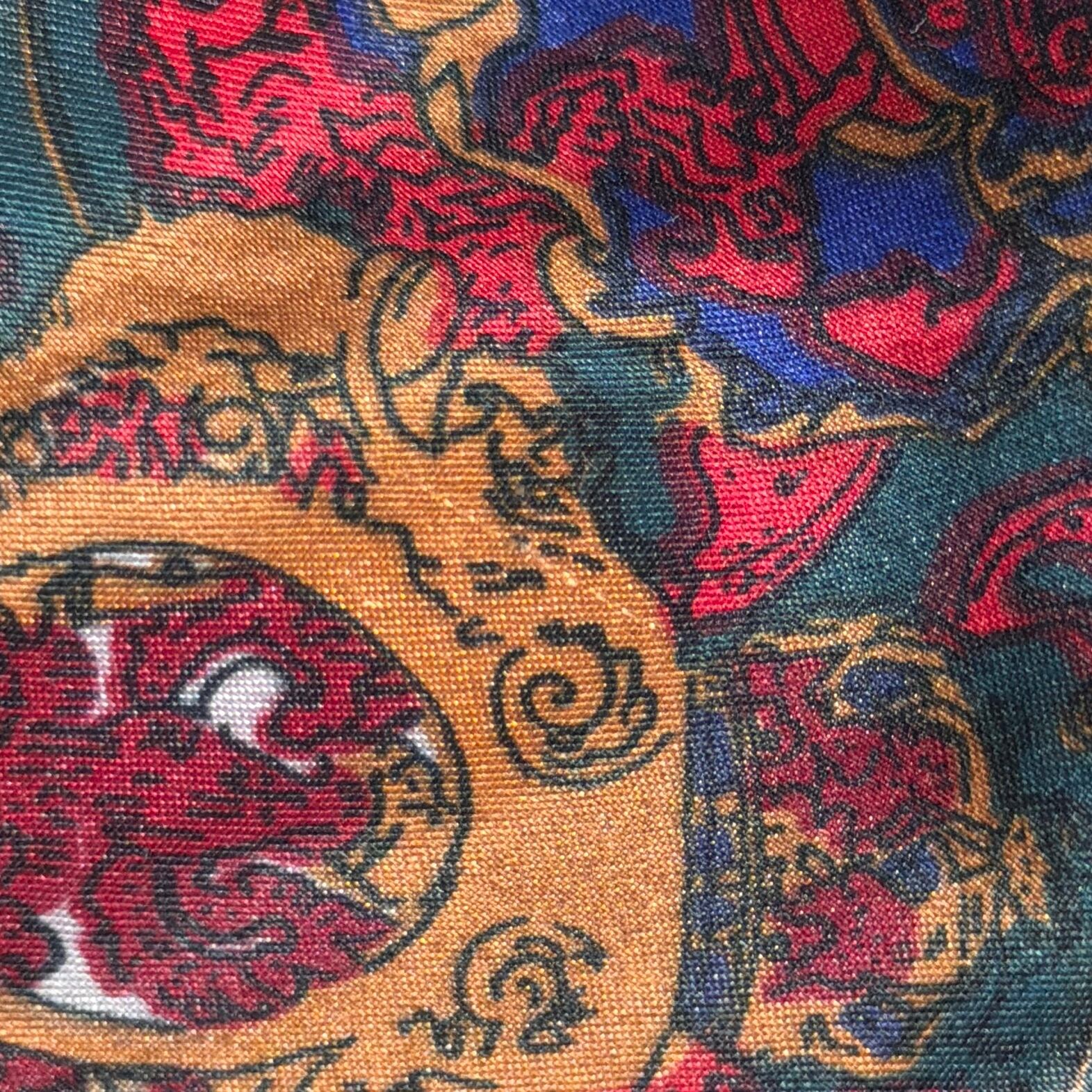 光沢感のあるシャイニーな生地に、バロック柄が全面に入ったインパクトのあるデザイン。レッドを基調にブルーの切り替えが効いていて、1枚でしっかり存在感のあるアイテムです。