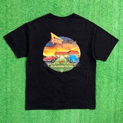 フロントはワンポイント、バックには夕焼けのグラデーションと店舗の風景がプリントされたデザインで、アメリカらしい雰囲気がしっかりと感じられる一枚。ロゴとイラストのバランスも良く、シンプルながら存在感のある仕上がりです。