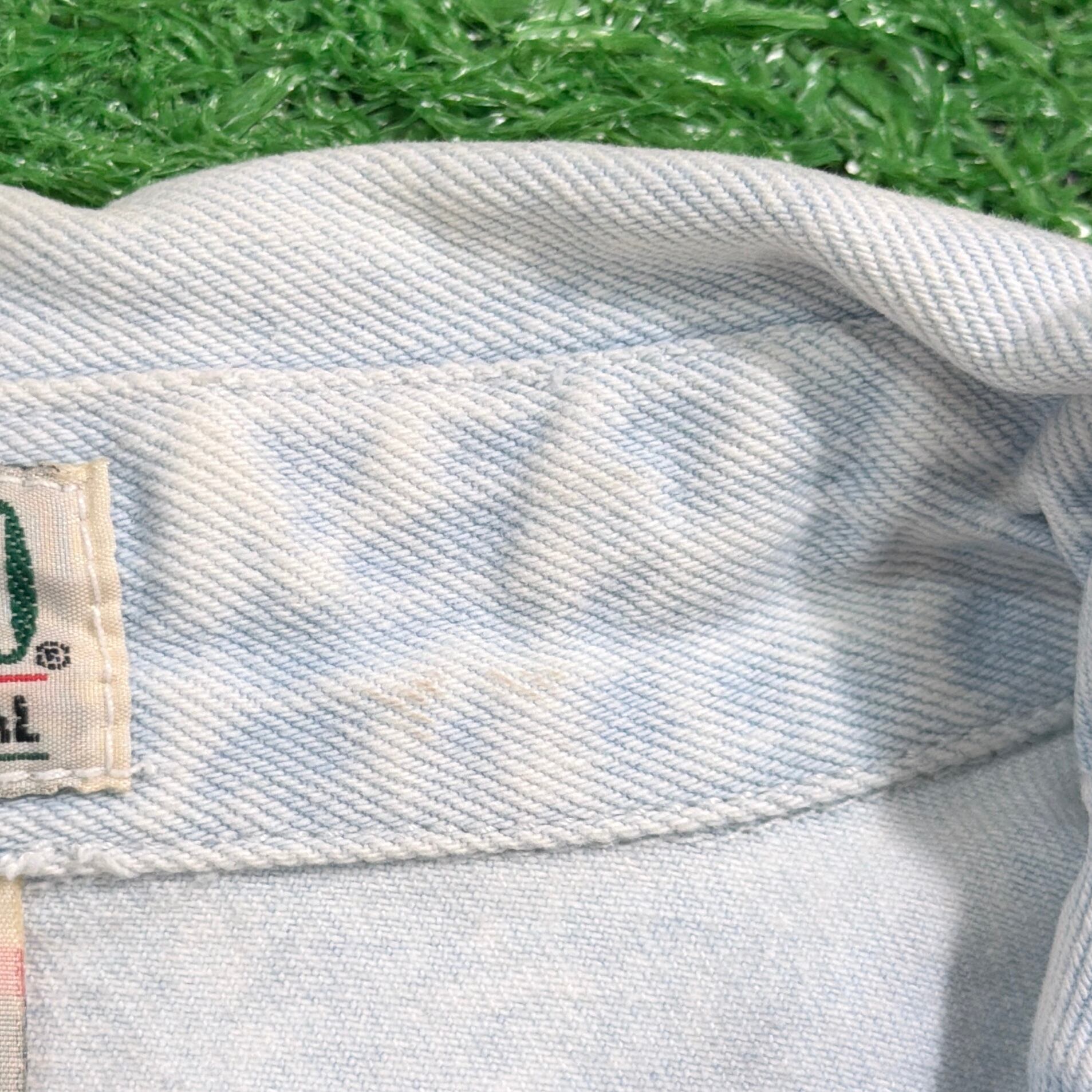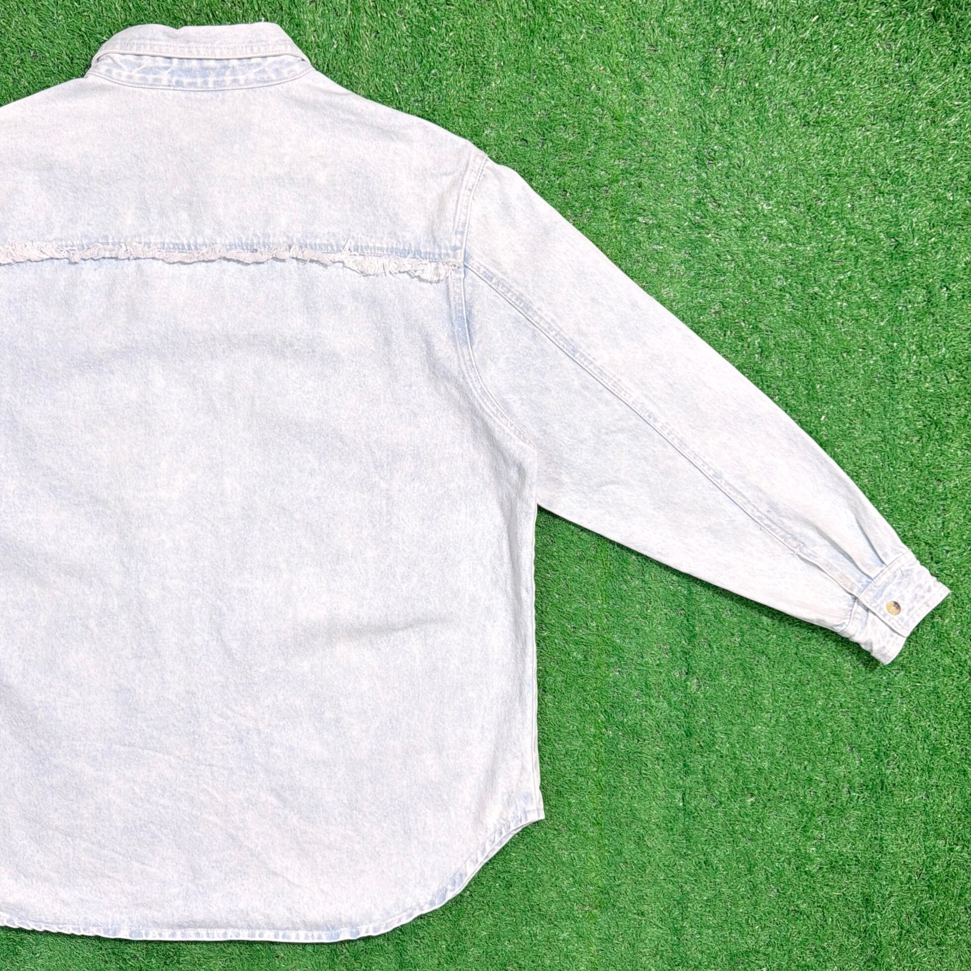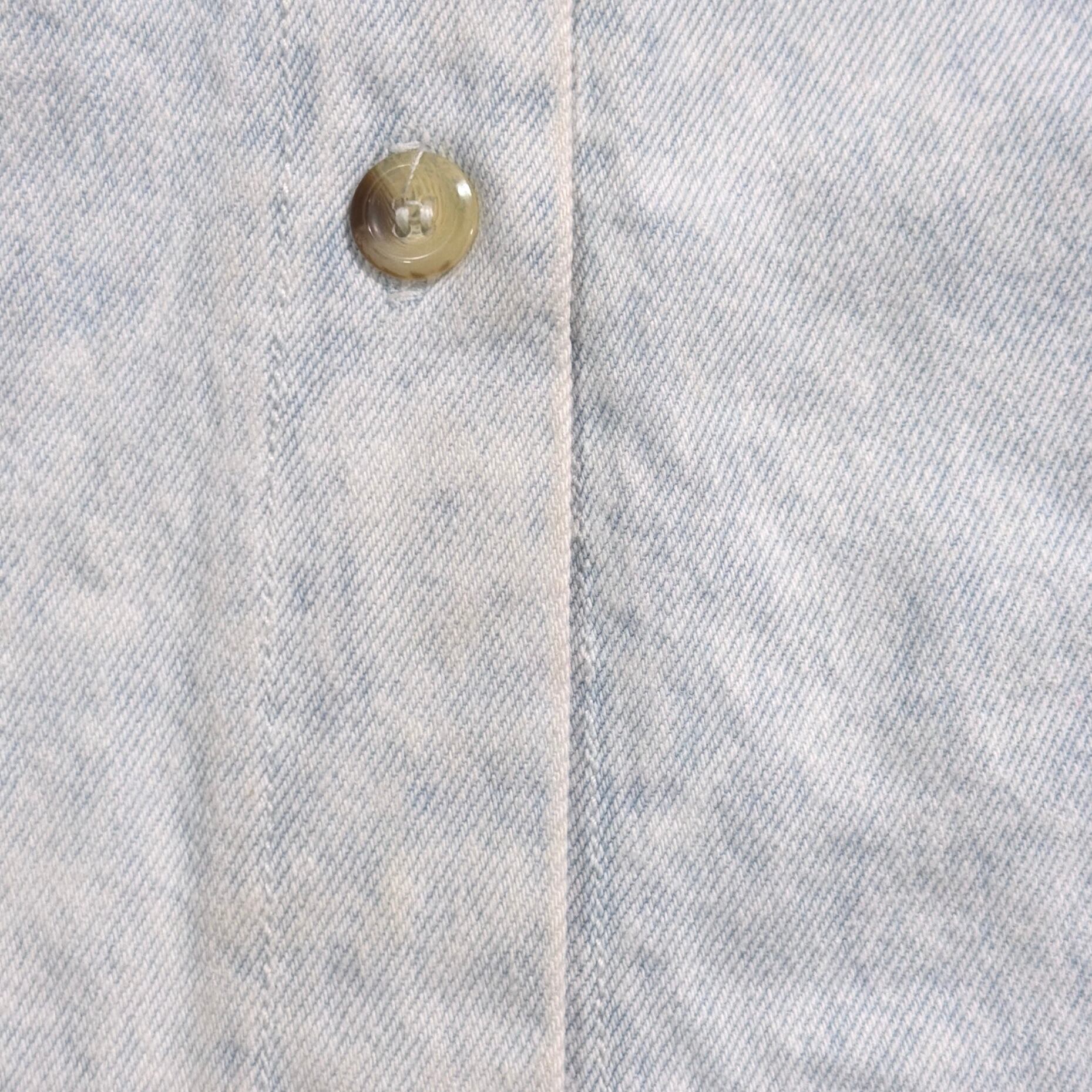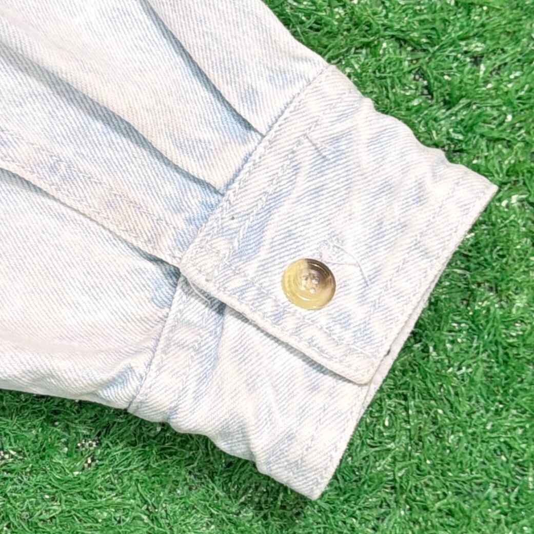 ライトブルーのデニムに、装飾が施された、しっかり個性のある一枚。細かいディテールまでこだわりを感じるデザインです。全体的にややライトなデニム生地で、シャツ感覚でさらっと着やすく、春秋はもちろん、羽織りとしても使える万能アイテム。シンプルなデニムシャツとは一味違う、80sらしいデザイン性が魅力です。
