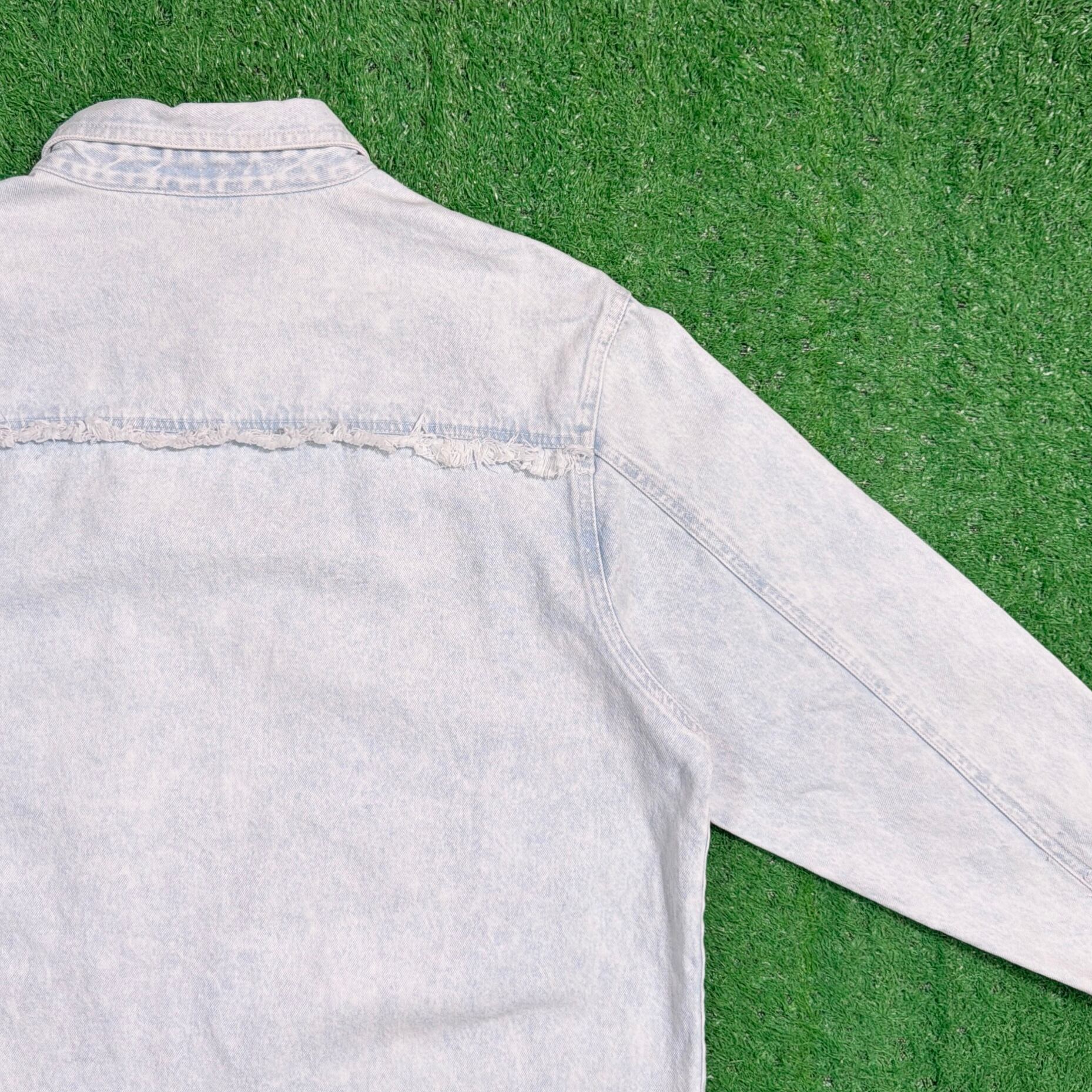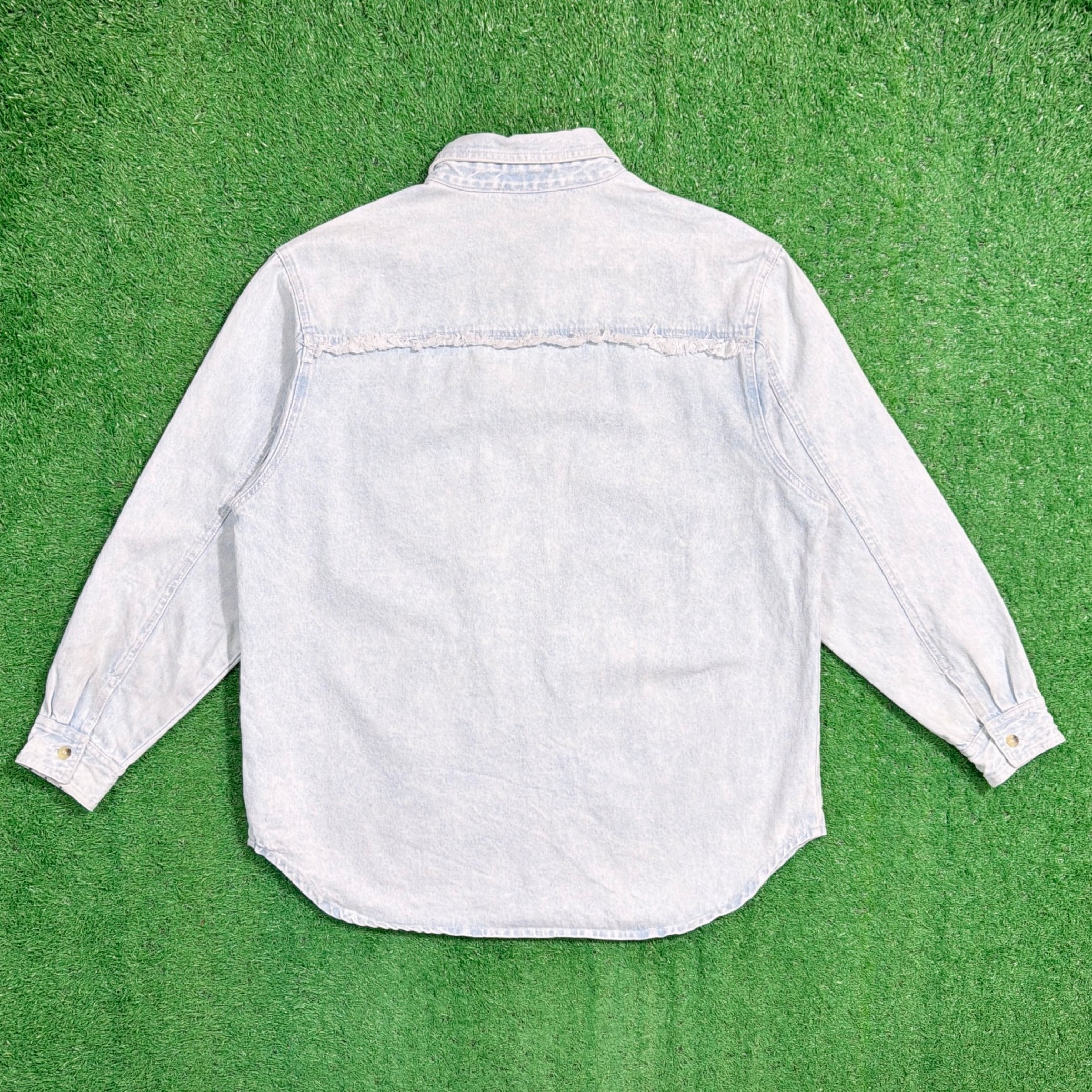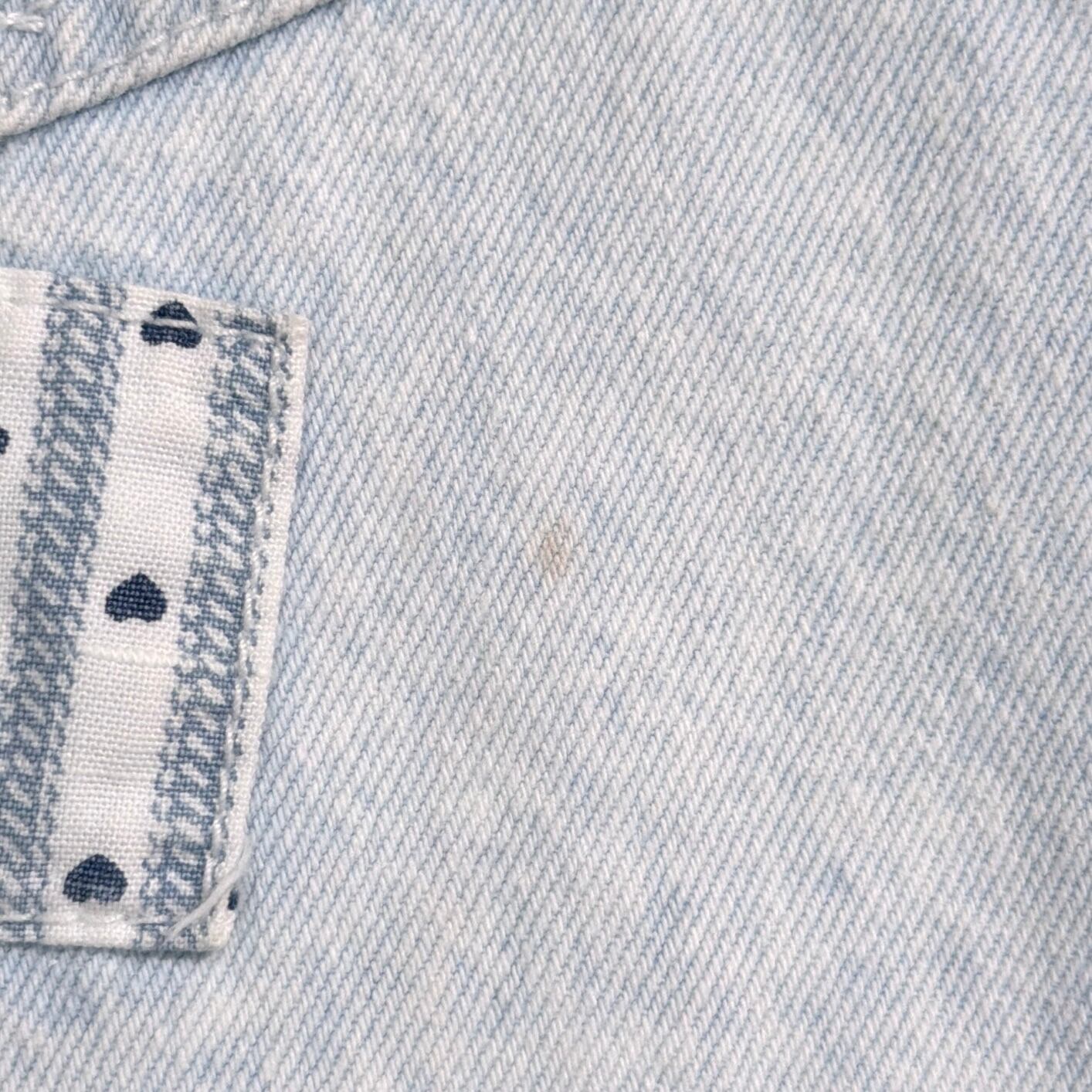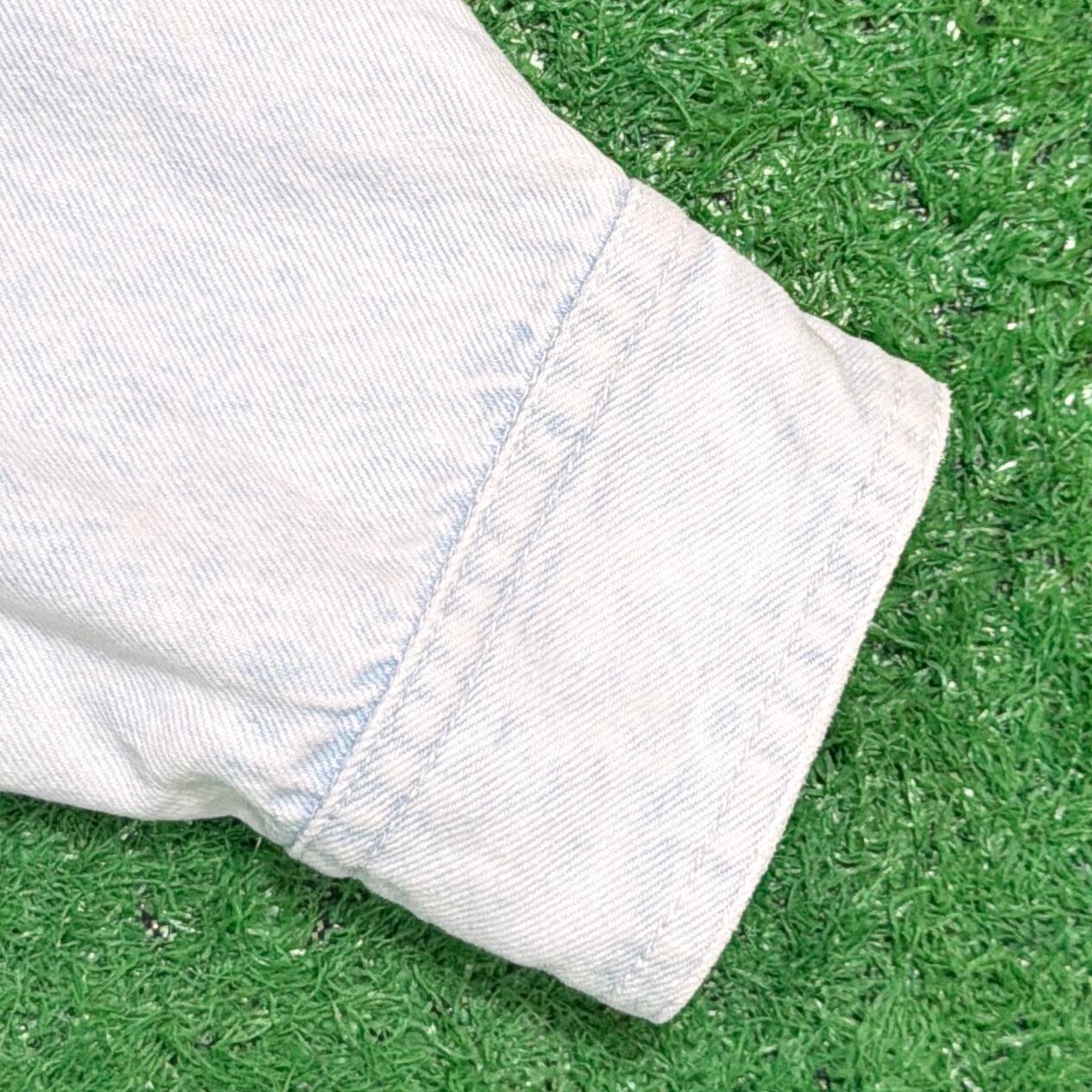 ライトブルーのデニムに、装飾が施された、しっかり個性のある一枚。細かいディテールまでこだわりを感じるデザインです。全体的にややライトなデニム生地で、シャツ感覚でさらっと着やすく、春秋はもちろん、羽織りとしても使える万能アイテム。シンプルなデニムシャツとは一味違う、80sらしいデザイン性が魅力です。
