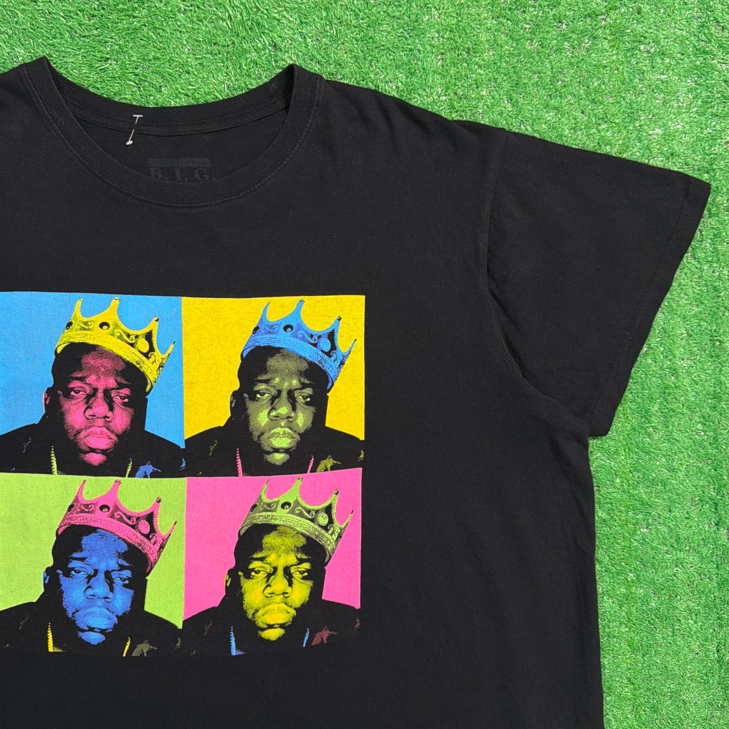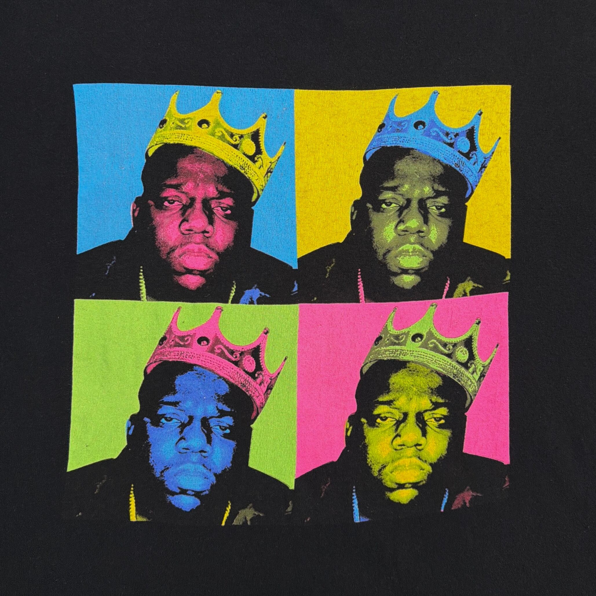 フロントにはクラウンを被ったビギーのフォトをポップなカラーで配置したデザインで、ストリート感とアート性を兼ね備えた一枚。ブラックボディに映えるカラープリントが存在感抜群です。ゆったりとした2XLサイズです。