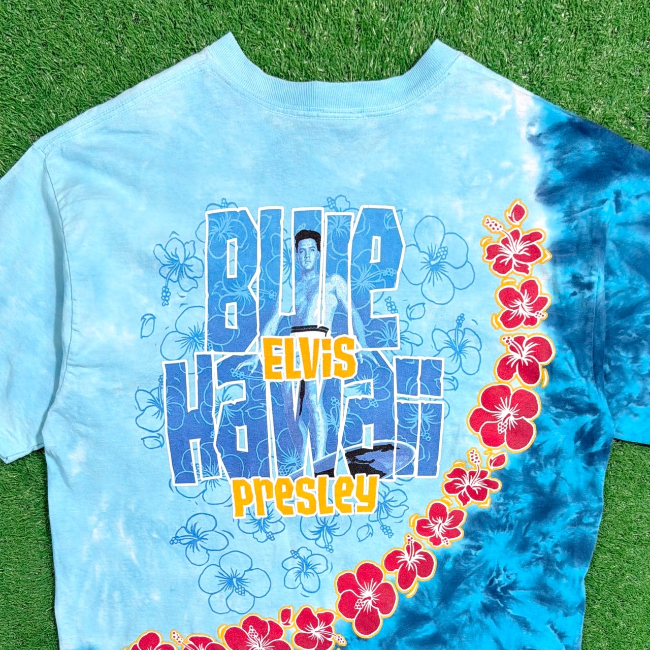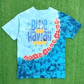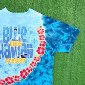 鮮やかなブルーのタイダイボディに、ハワイアンスタイルのエルヴィスとレイ(花飾り)がデザインされた一枚。バックには「Blue Hawaii」の文字が入り、リゾート感のある雰囲気も魅力です。LIQUID BLUEらしいインパクトのあるグラフィックがしっかりと存在感を放ちます。
