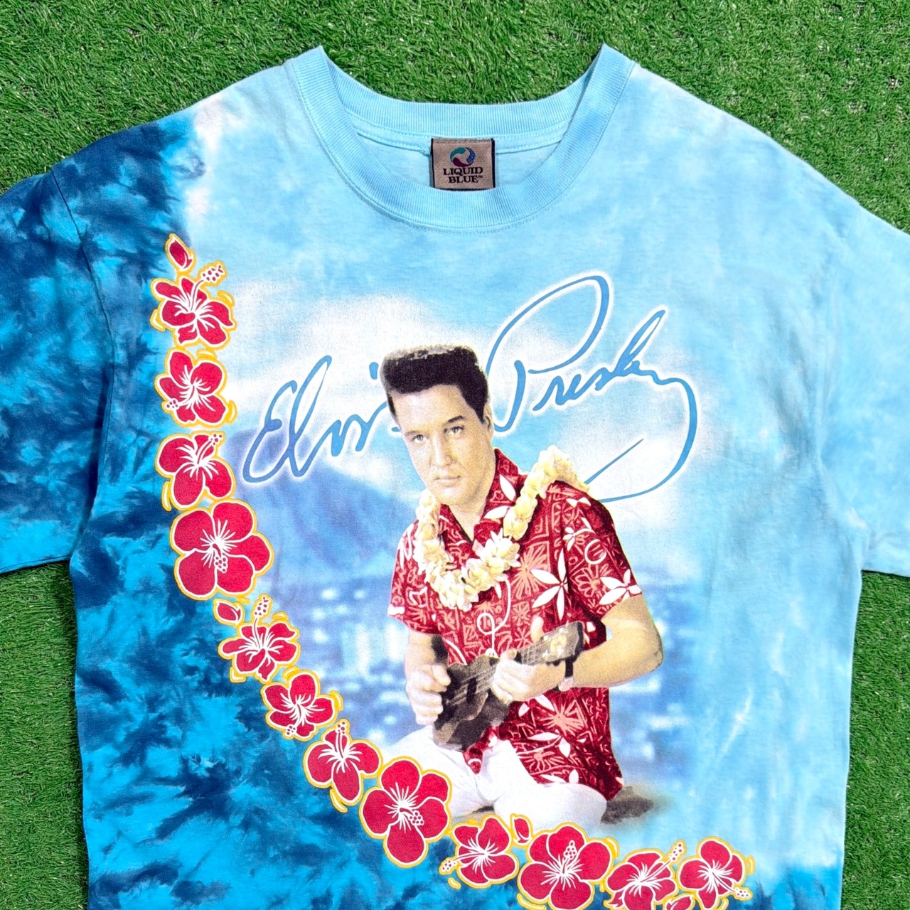 Elvis Presleyはアメリカを代表するロックンロールアーティストで、「キング・オブ・ロックンロール」として知られる存在です。LIQUID BLUEはアメリカのTシャツブランドで、タイダイやアーティスト系のグラフィックで知られるブランドです。