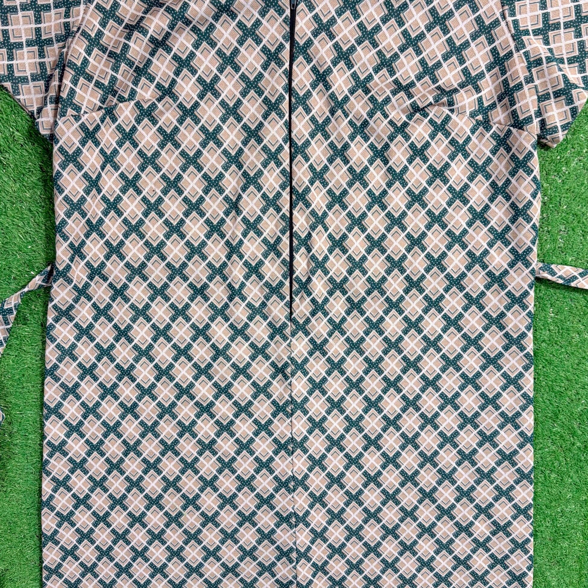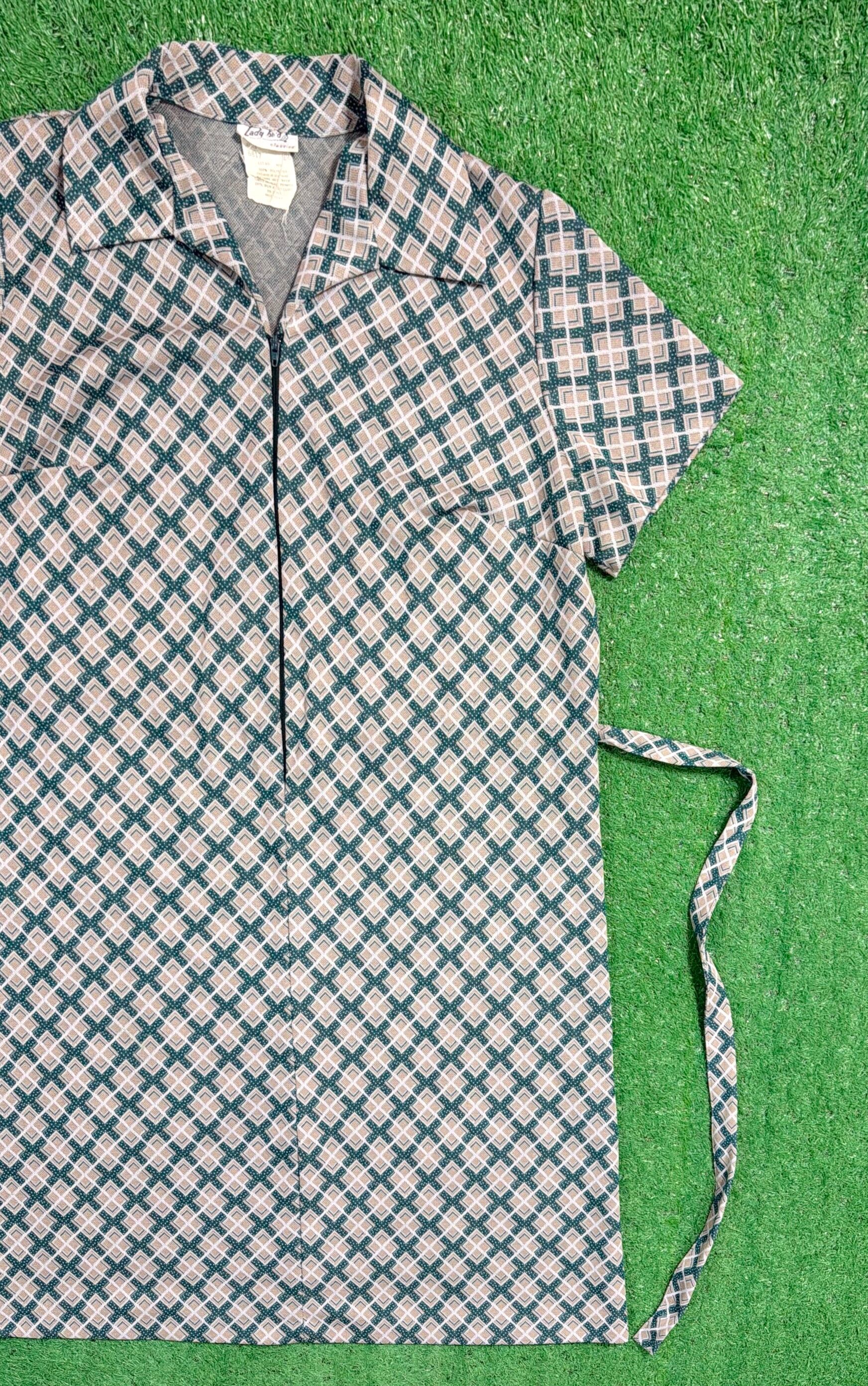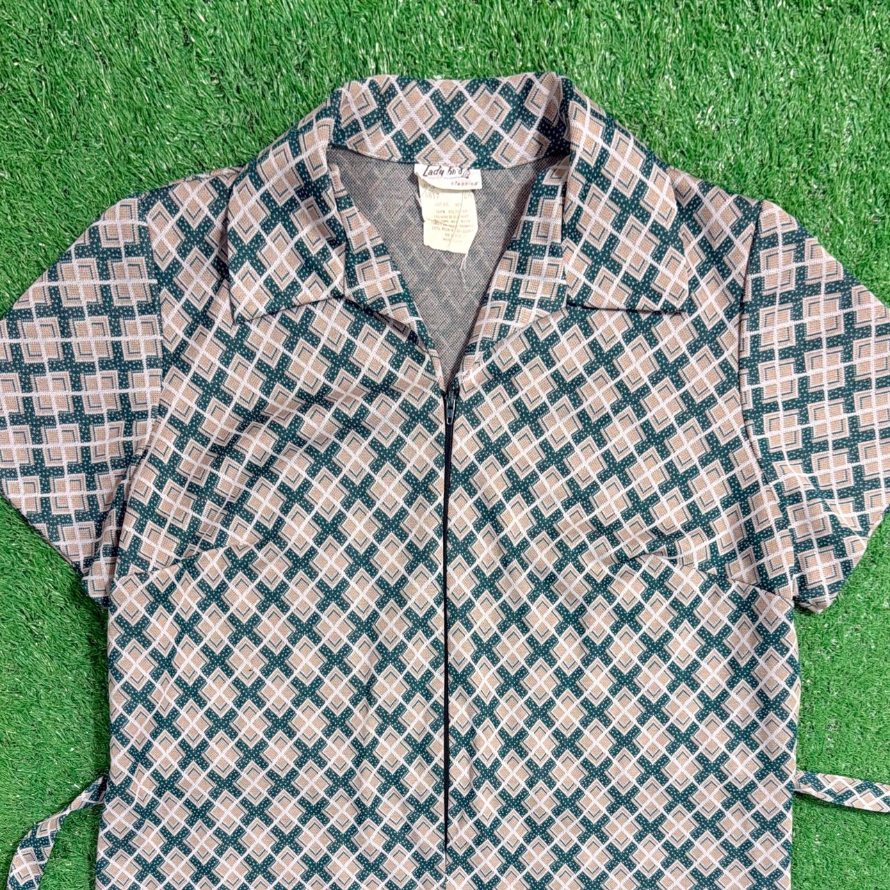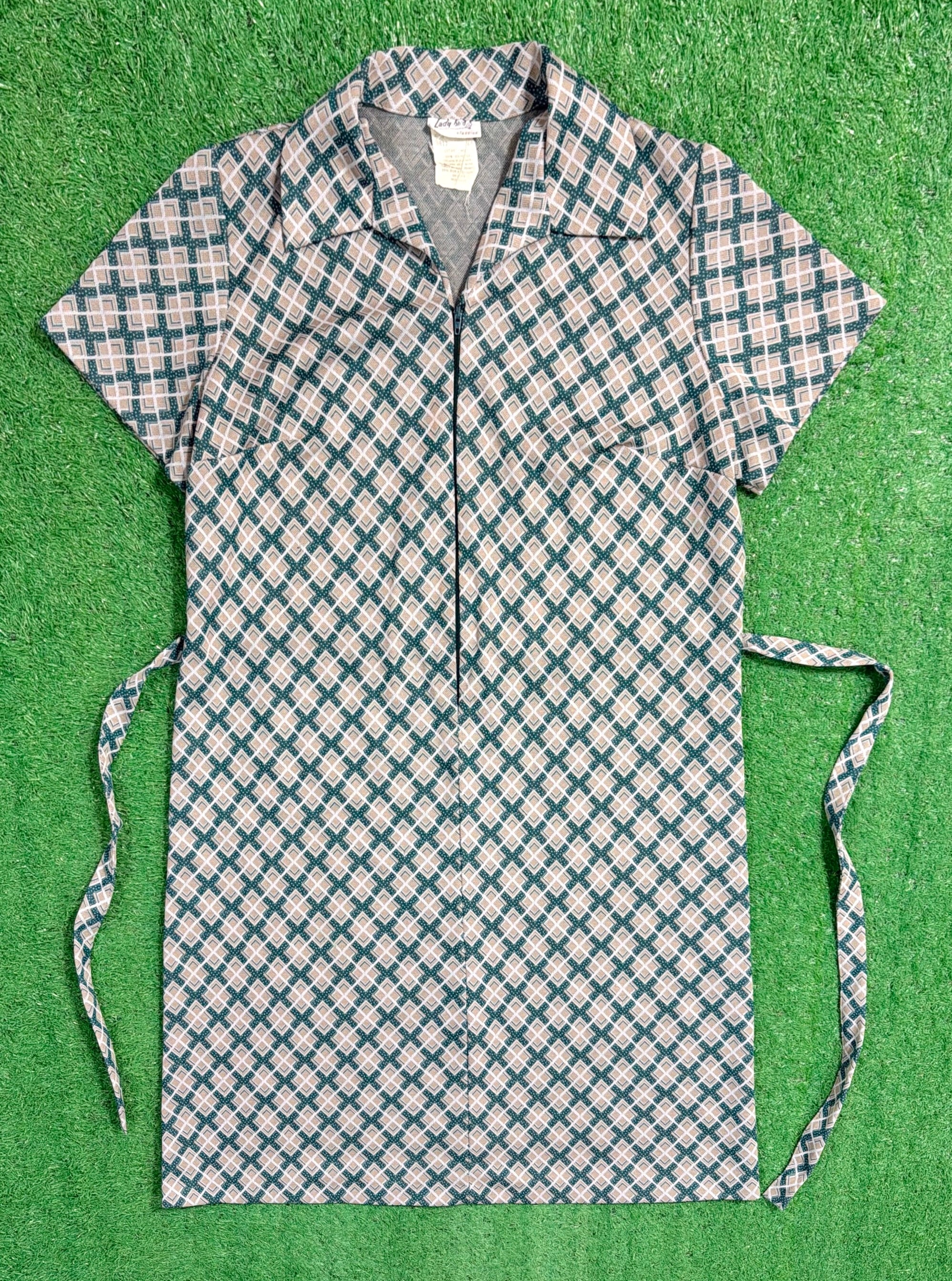 小紋のような細かい総柄デザインが特徴的で、落ち着いたカラーリングながらしっかりと存在感のある一枚。開襟デザインとウエストの切り替えがバランスよく、70年代らしいクラシックな雰囲気を感じられます。