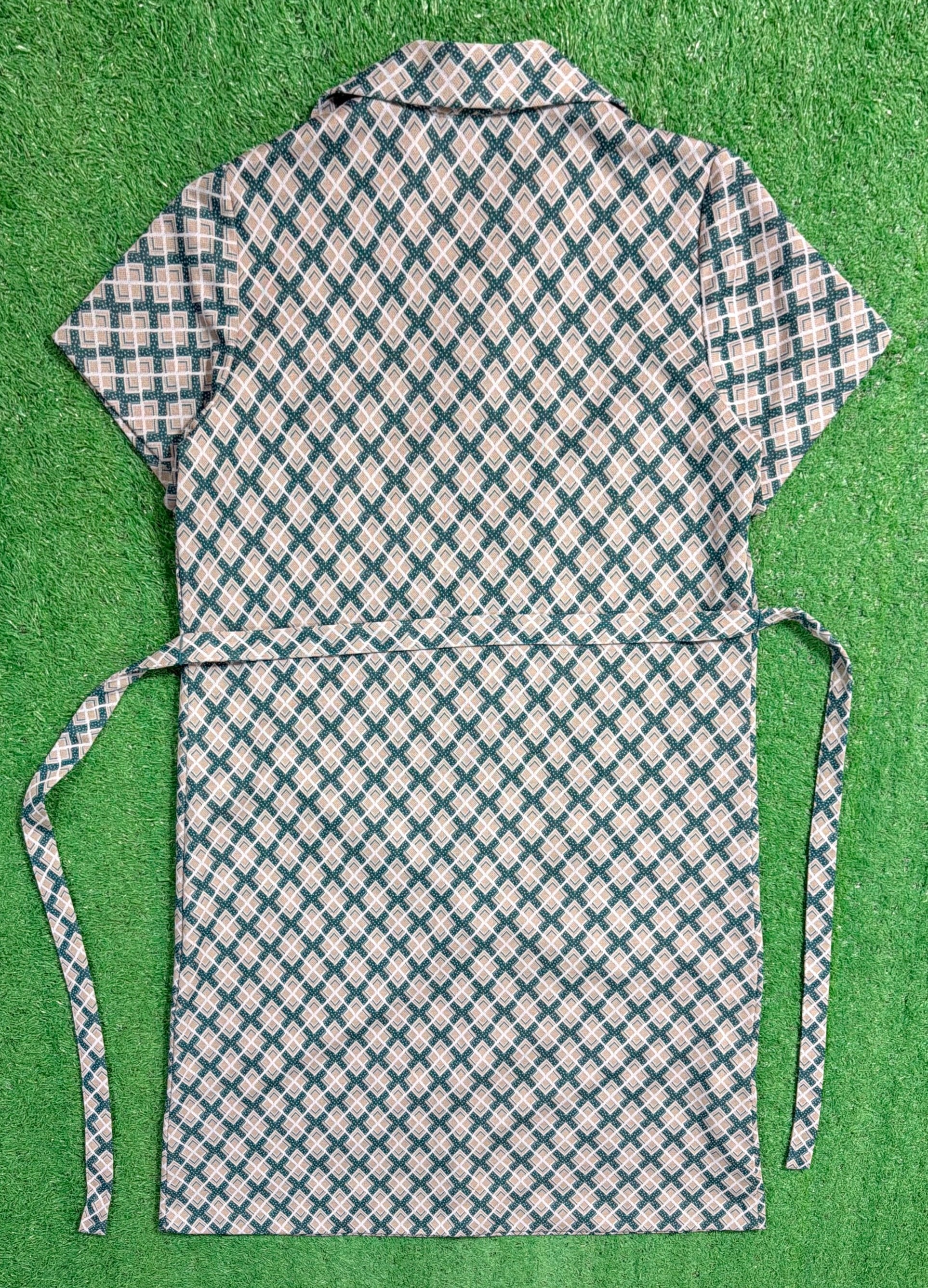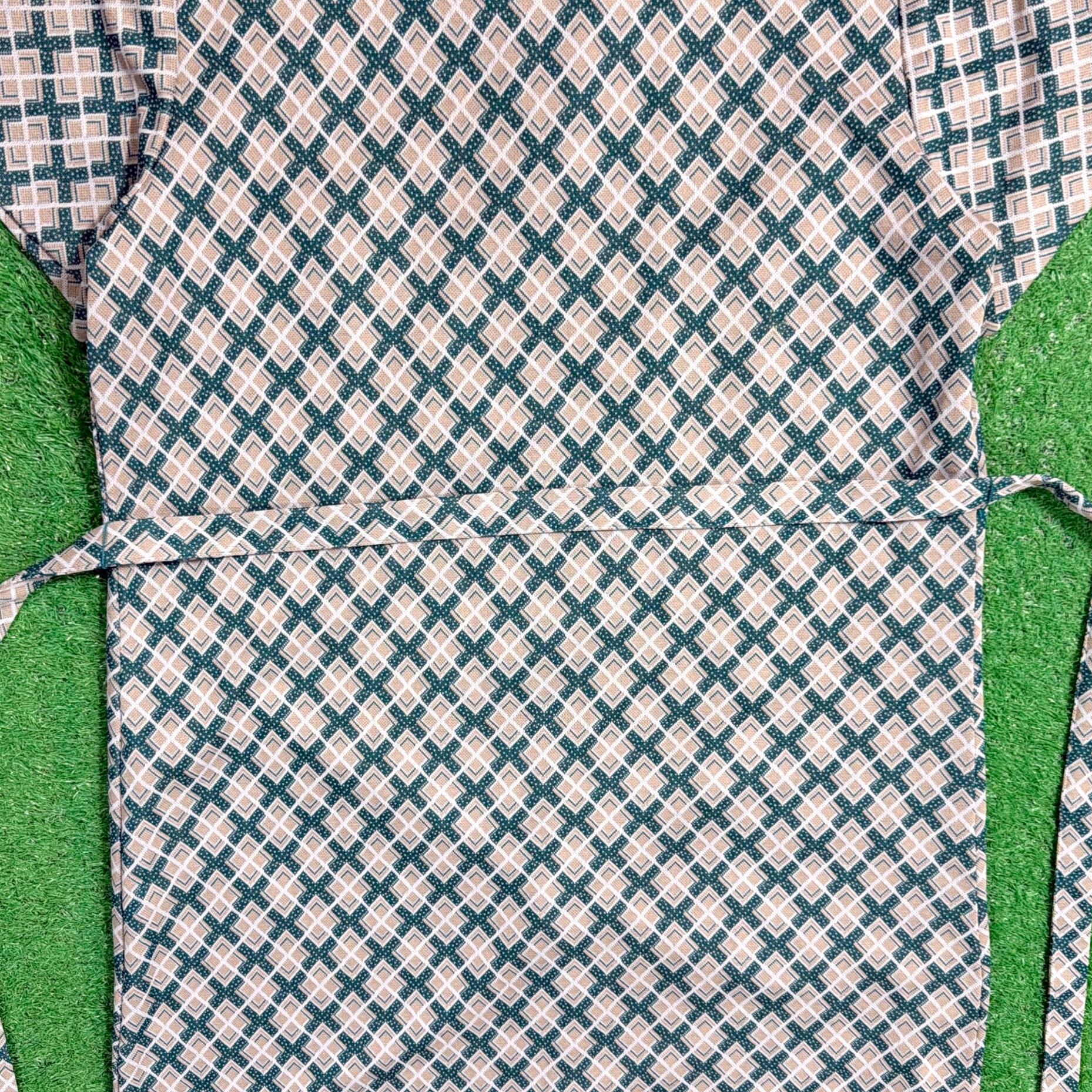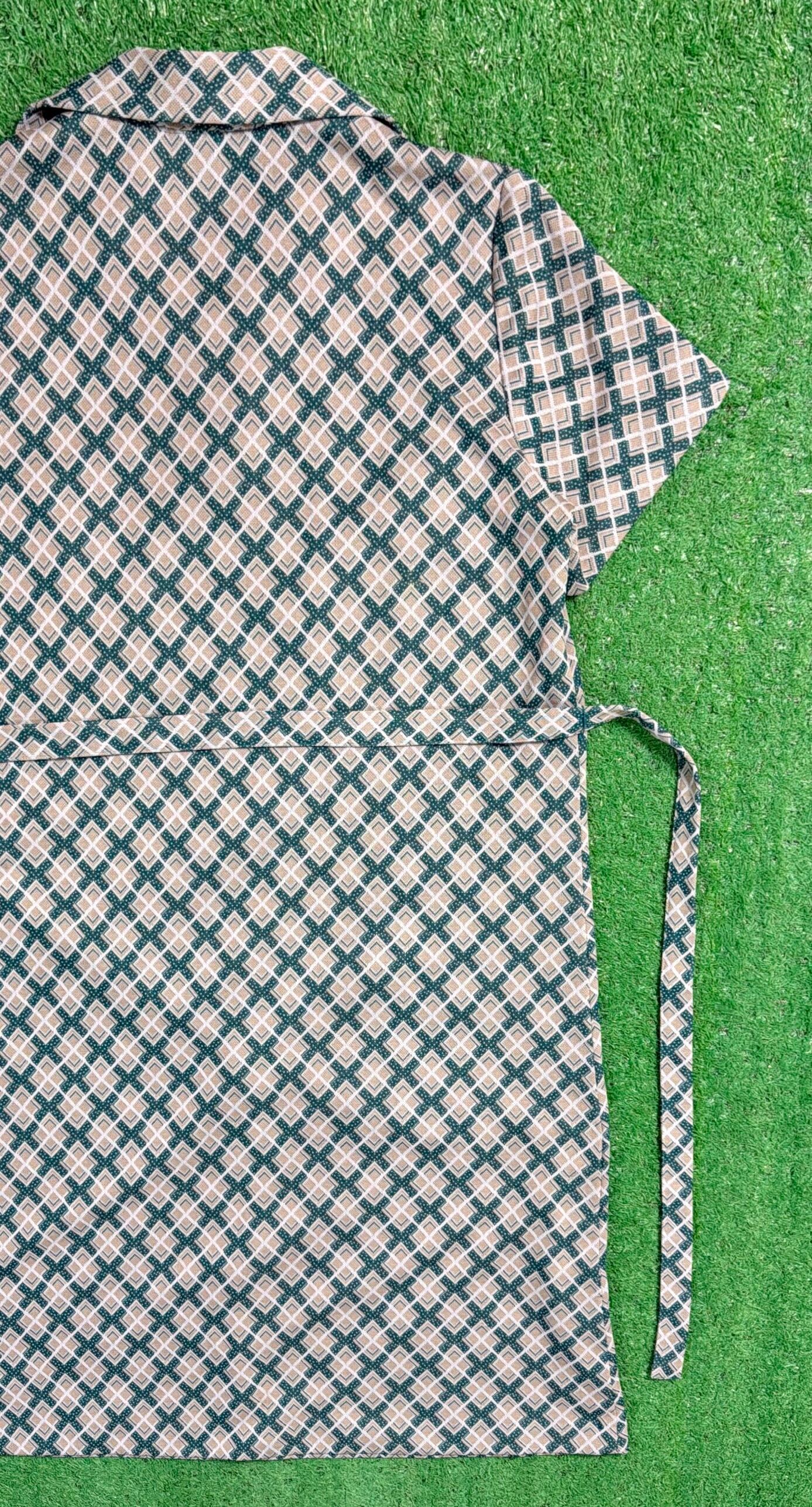 小紋のような細かい総柄デザインが特徴的で、落ち着いたカラーリングながらしっかりと存在感のある一枚。開襟デザインとウエストの切り替えがバランスよく、70年代らしいクラシックな雰囲気を感じられます。