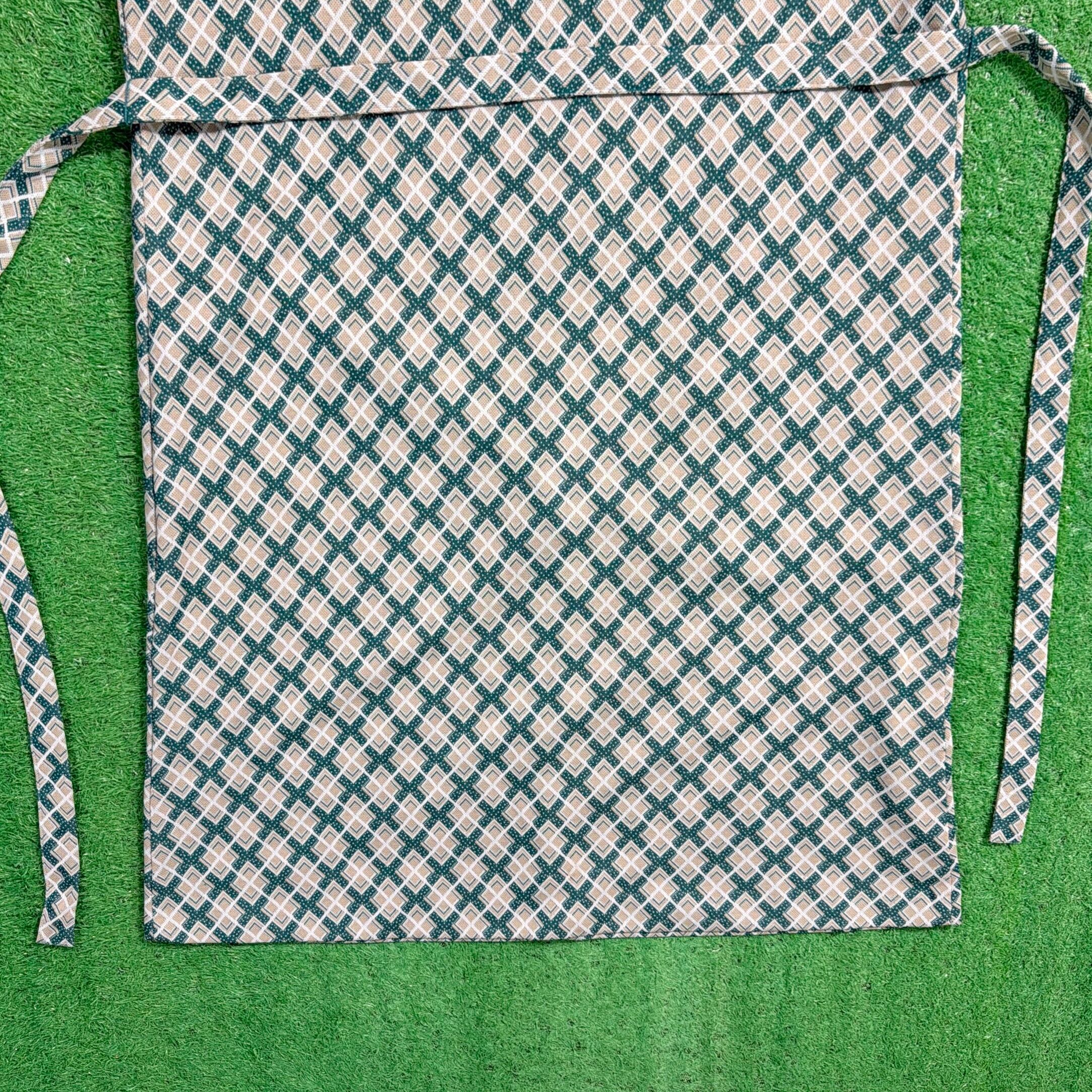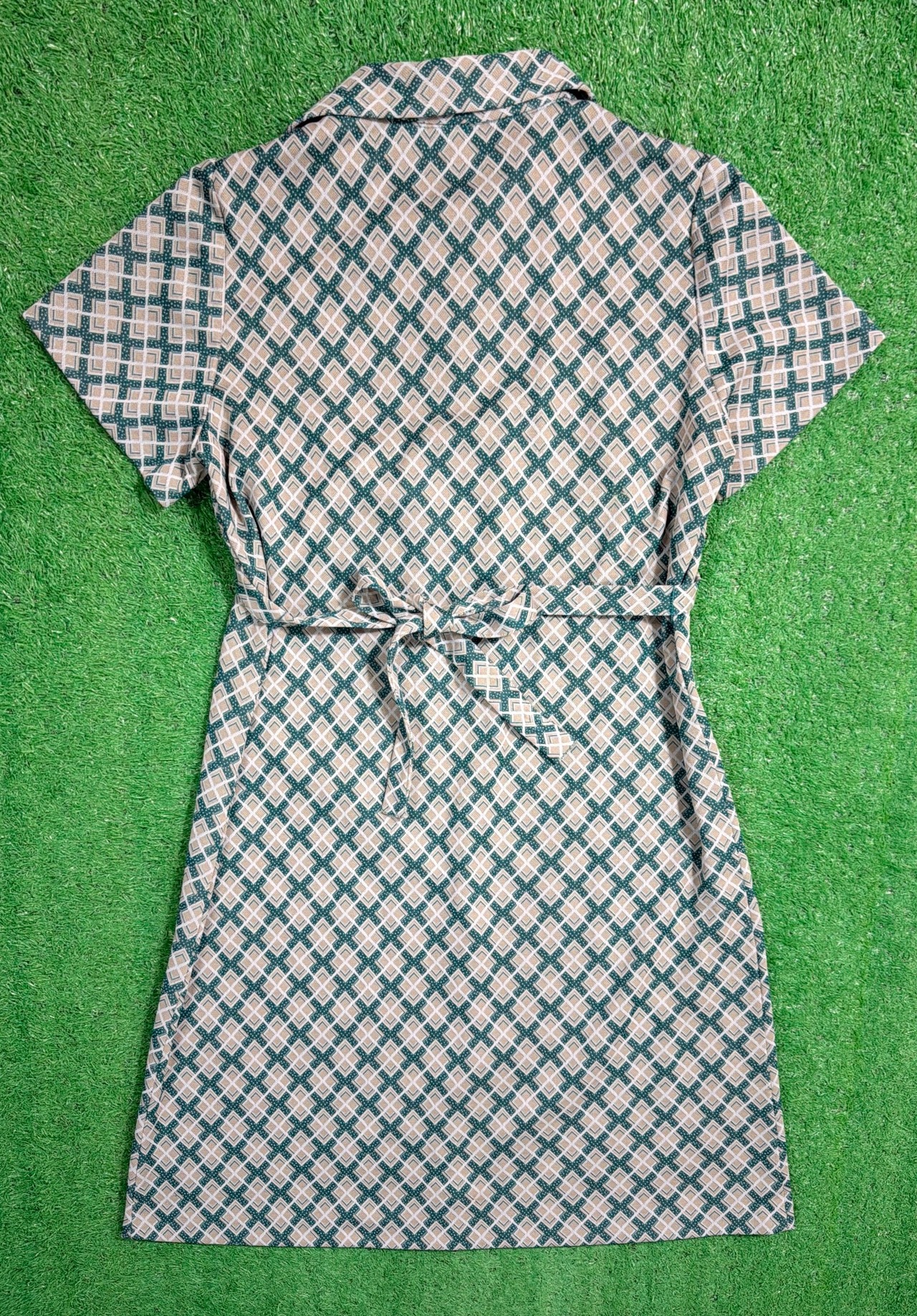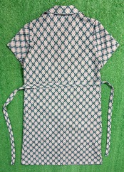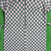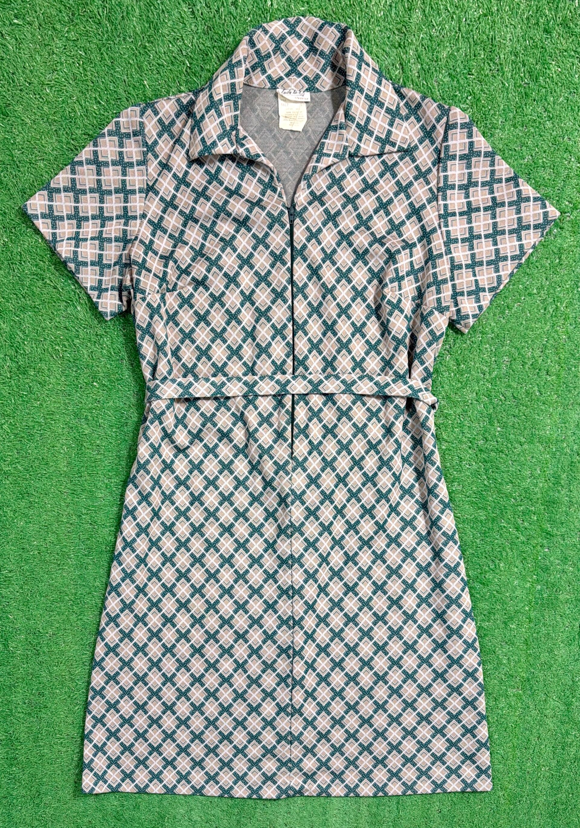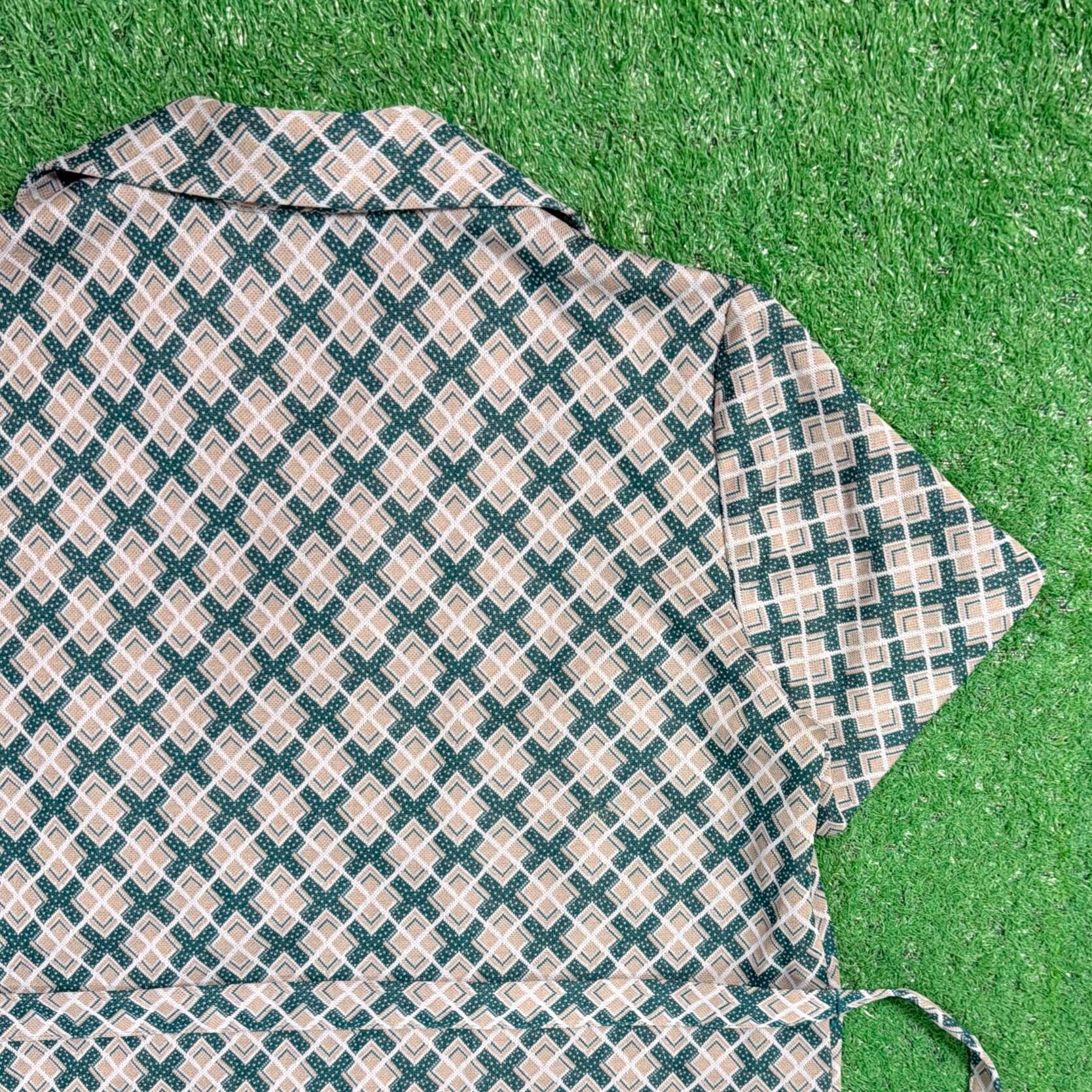 小紋のような細かい総柄デザインが特徴的で、落ち着いたカラーリングながらしっかりと存在感のある一枚。開襟デザインとウエストの切り替えがバランスよく、70年代らしいクラシックな雰囲気を感じられます。