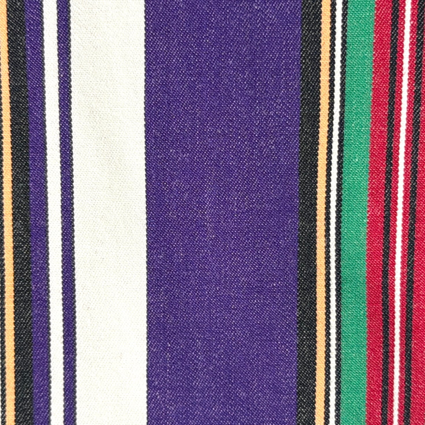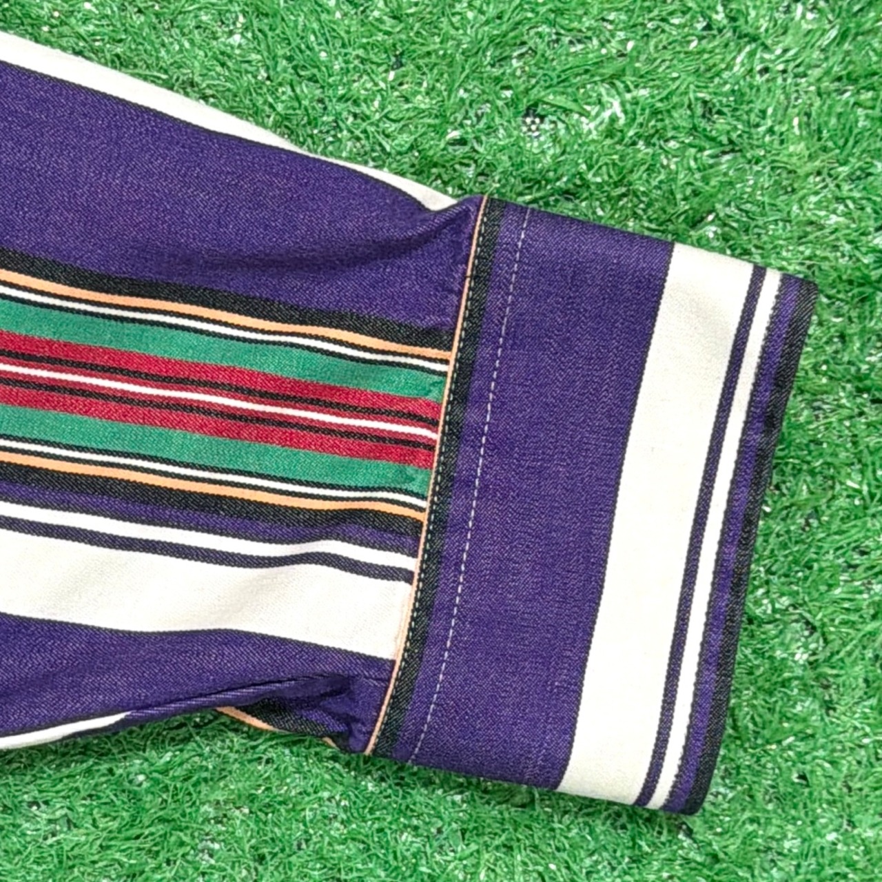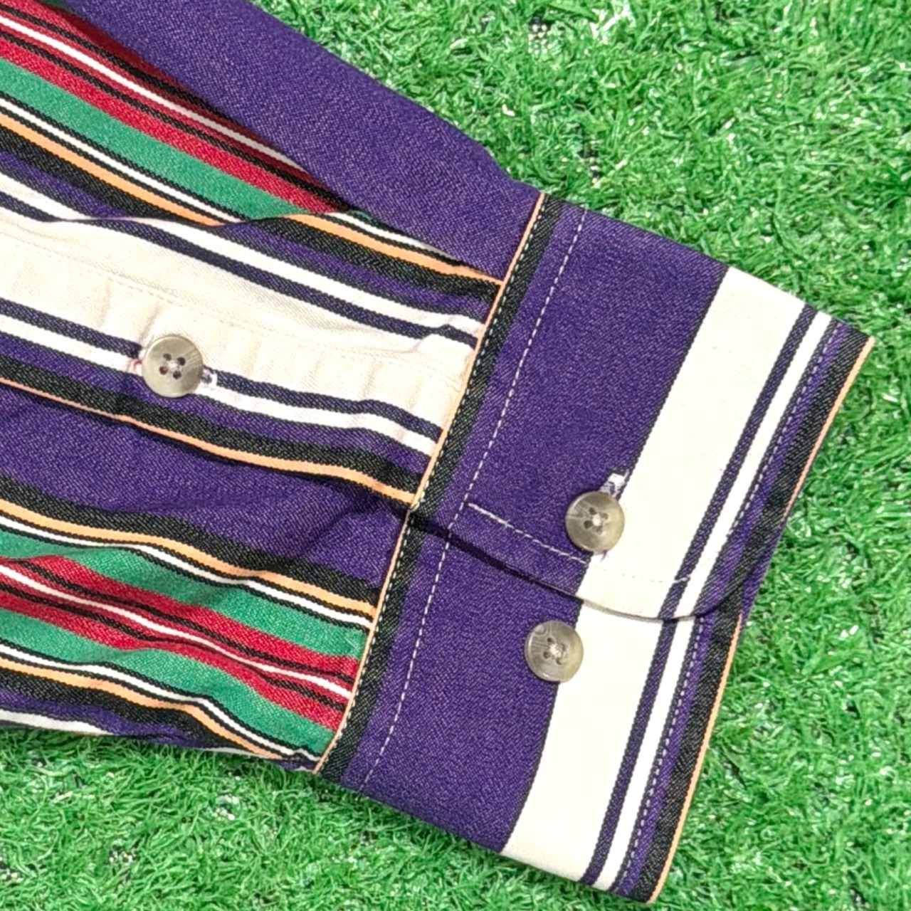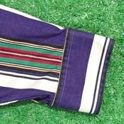 パープルをベースに、多色で構成されたストライプが印象的な一枚。配色のバランスが良く、1枚でしっかりスタイリングの主役になるデザインです。