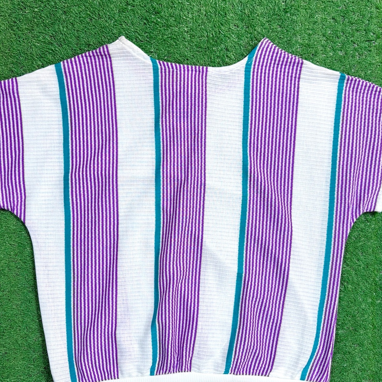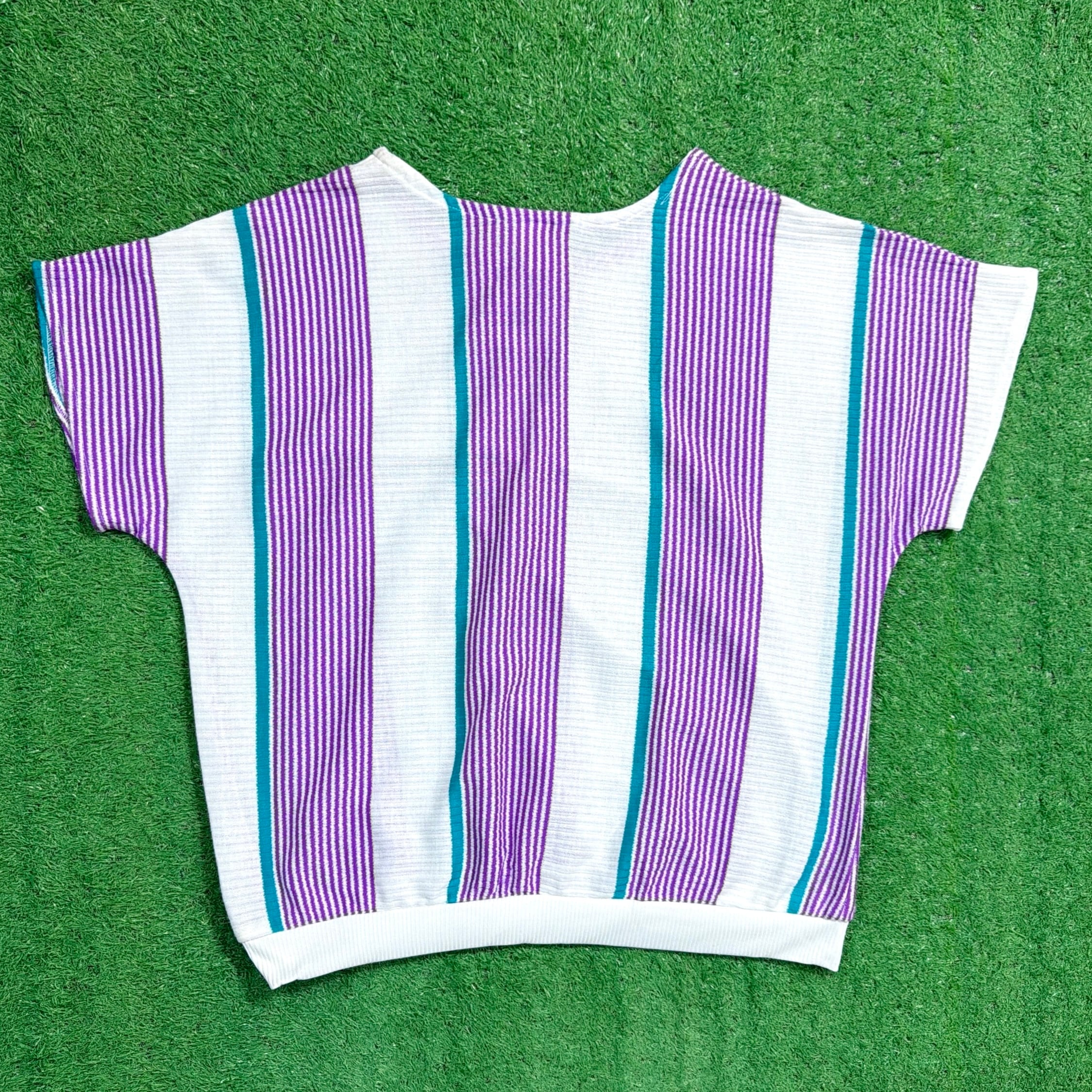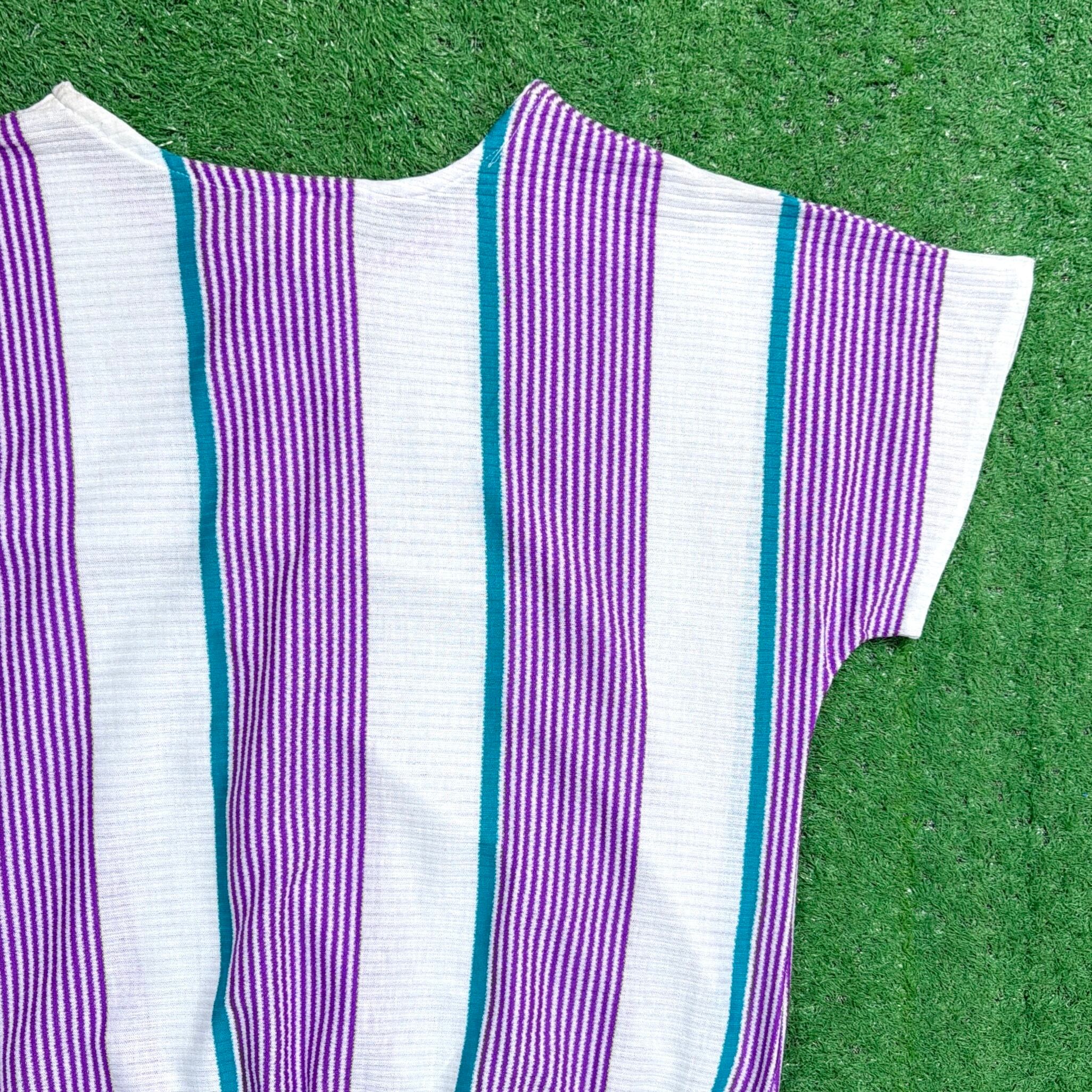 パープル×ホワイトをベースに、グリーンのラインが入ったストライプデザインが目を惹く一枚。