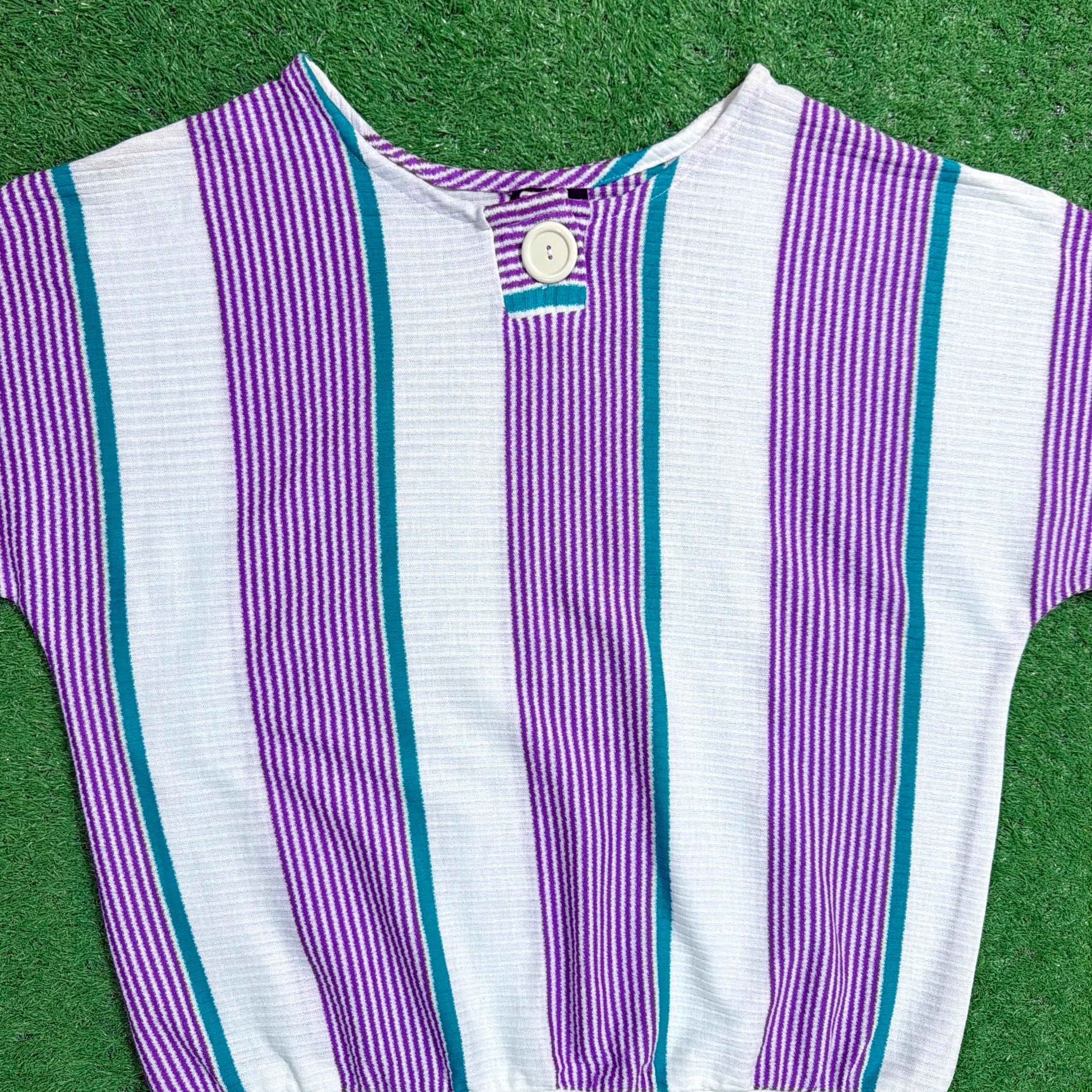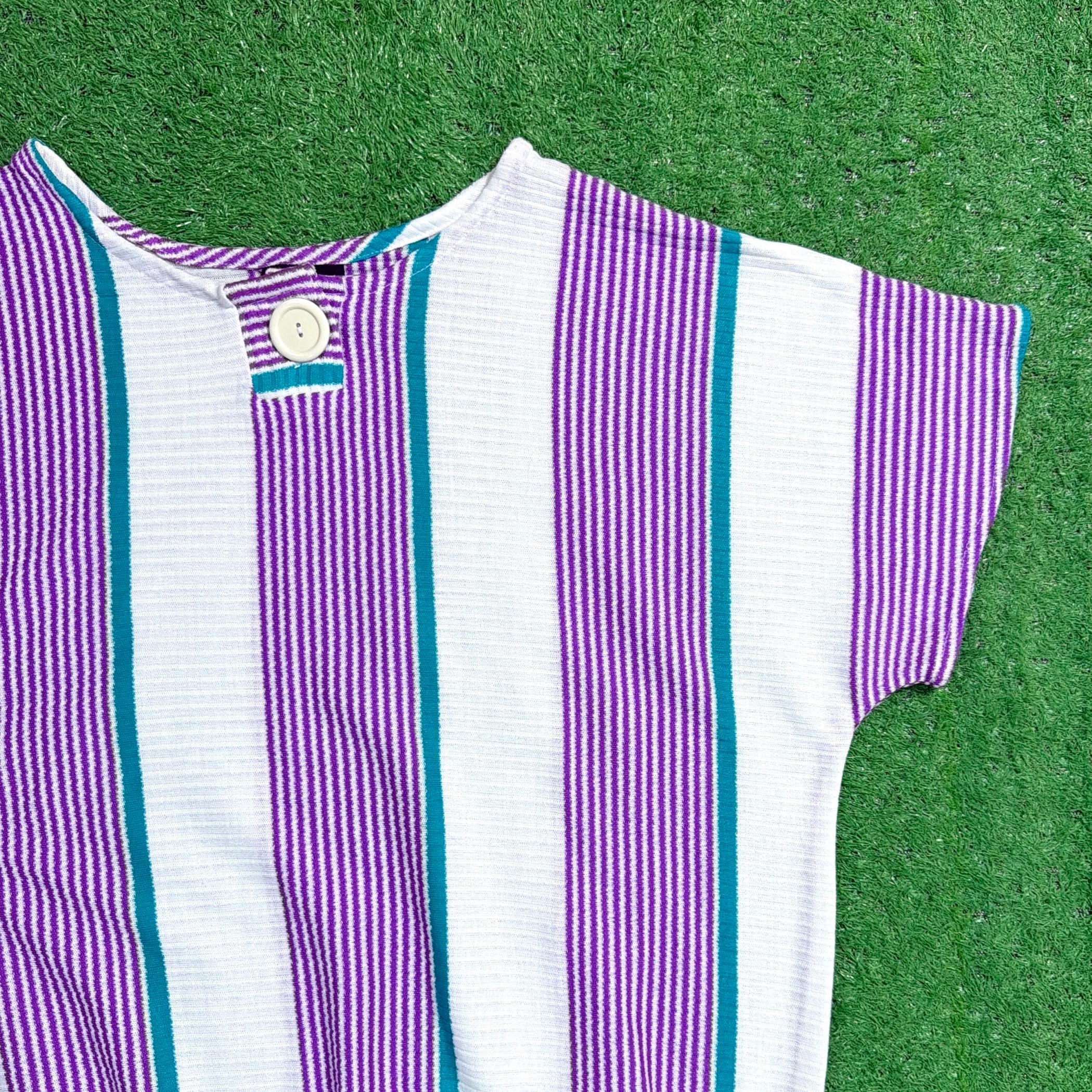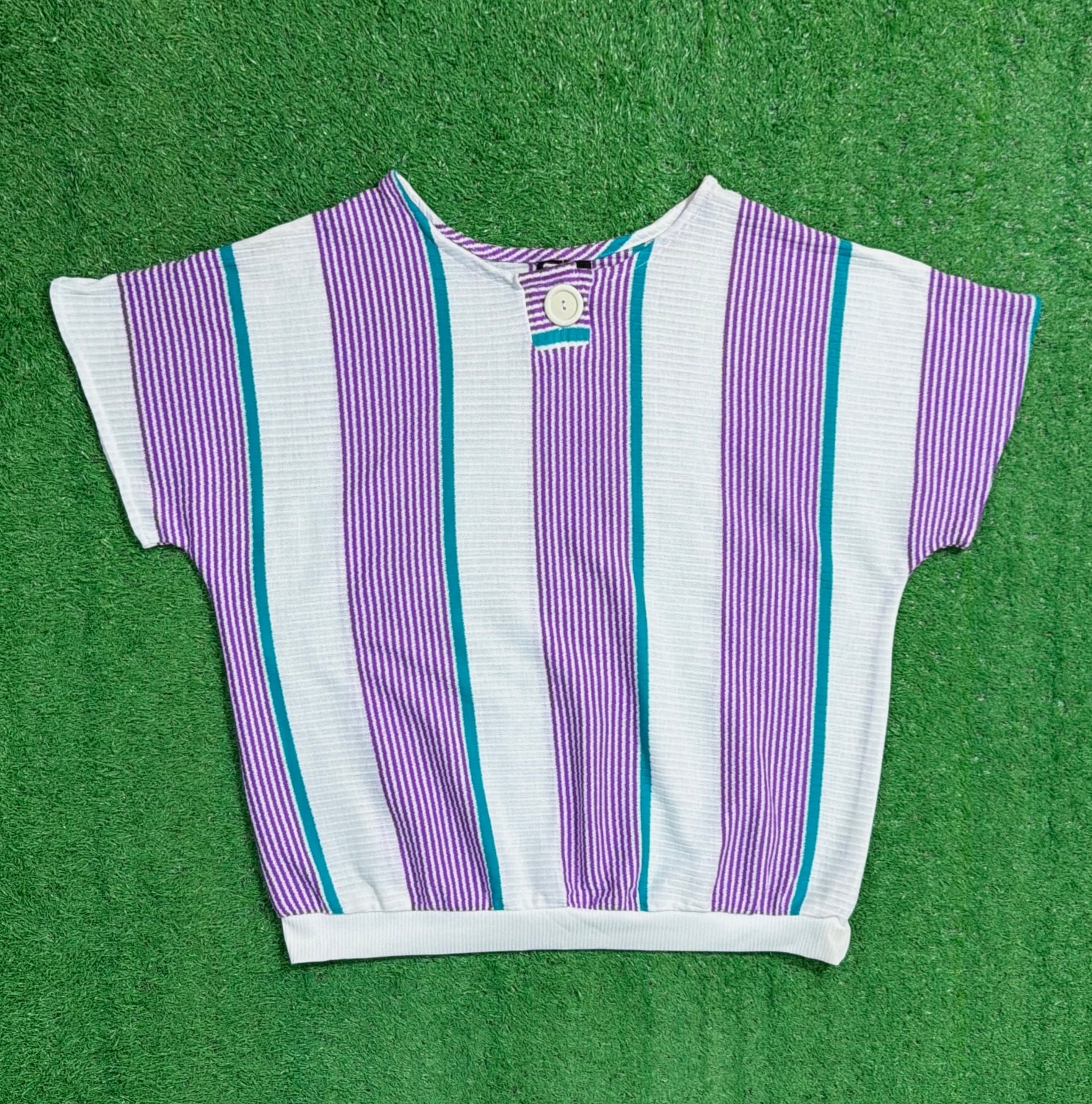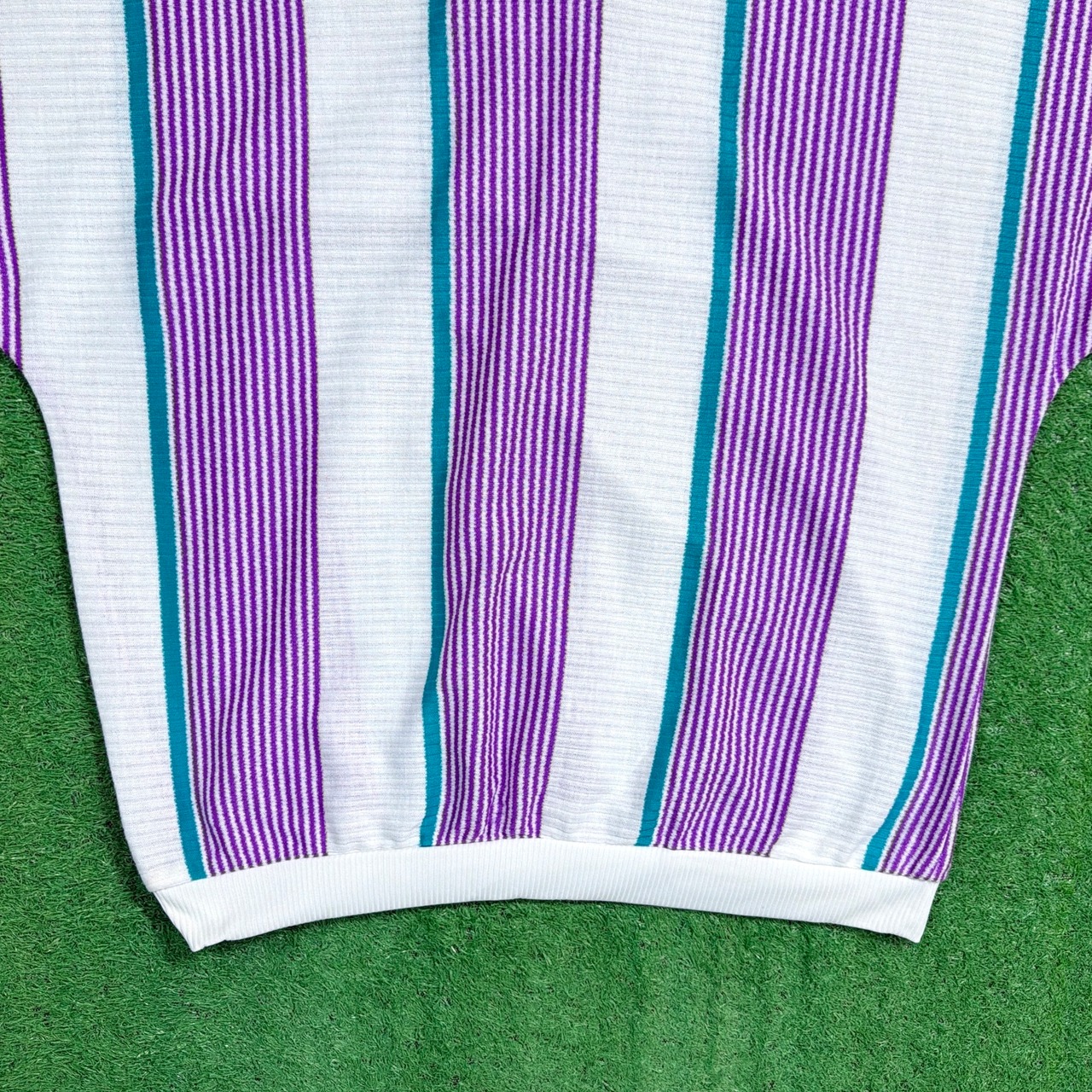 パープル×ホワイトをベースに、グリーンのラインが入ったストライプデザインが目を惹く一枚。