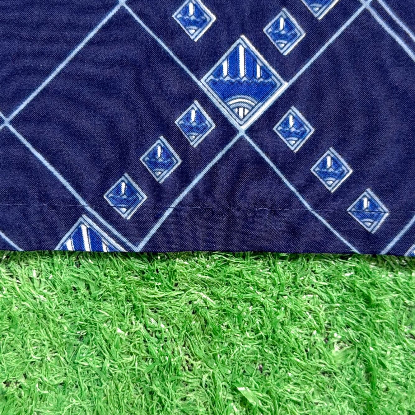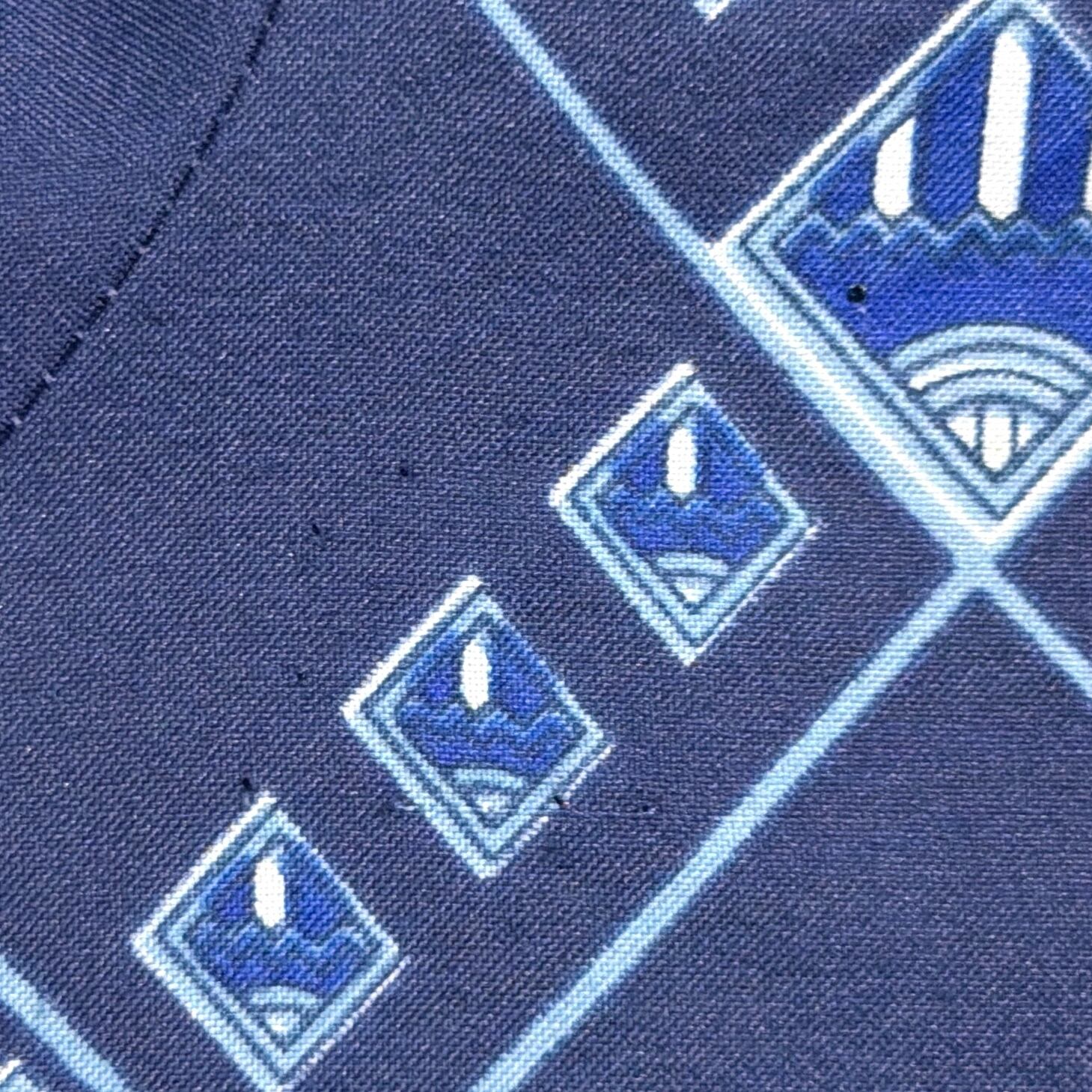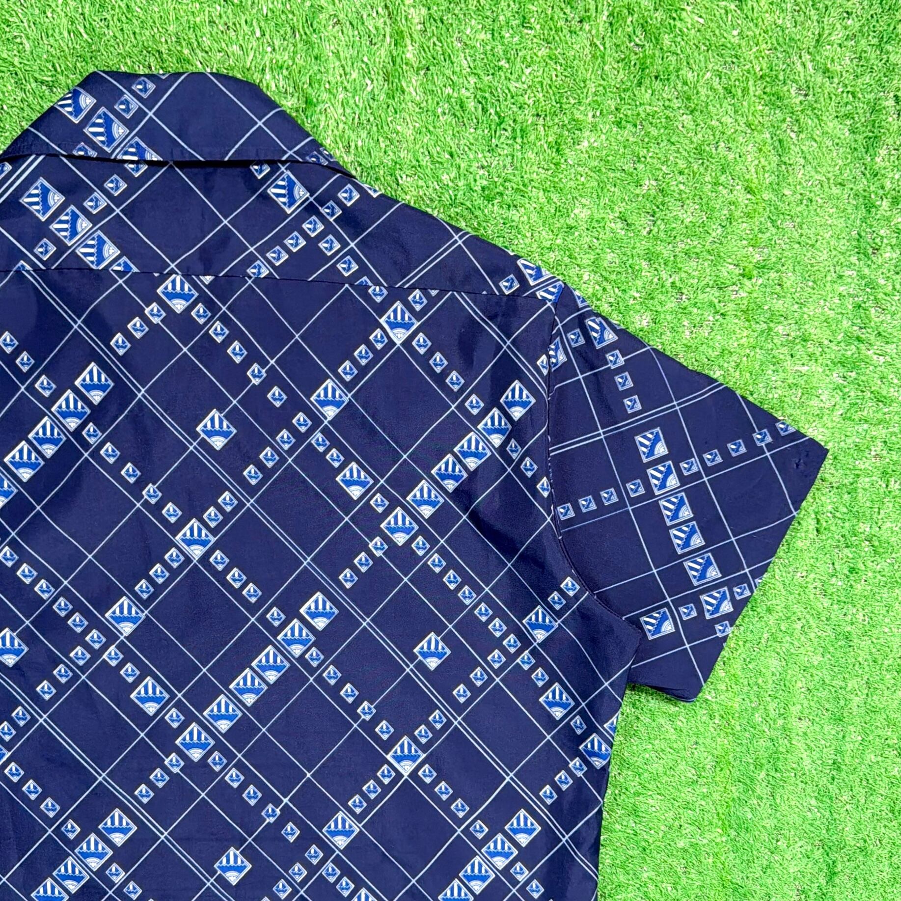 ネイビーベースに幾何学的な総柄が入ったデザインで、70年代らしいレトロな雰囲気がしっかり感じられる一枚。細かく配置されたダイヤ柄やラインのバランスが良く、落ち着きの中にも個性がある仕上がりです。