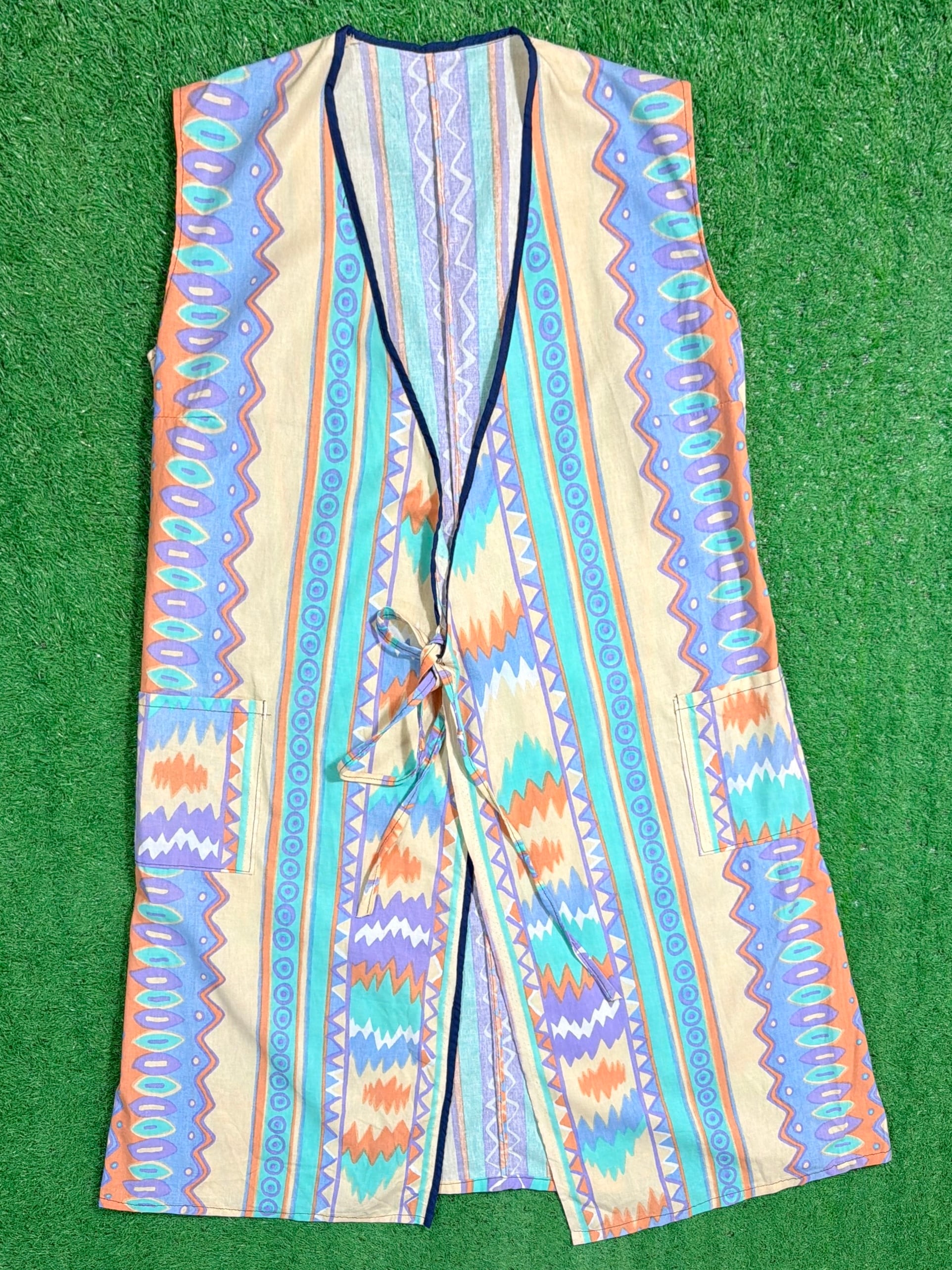 ネイティブ調の総柄デザインが印象的なロング丈ベストです。