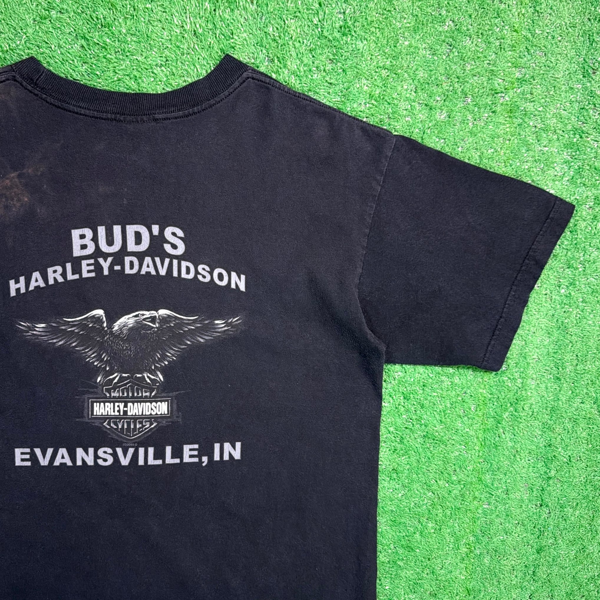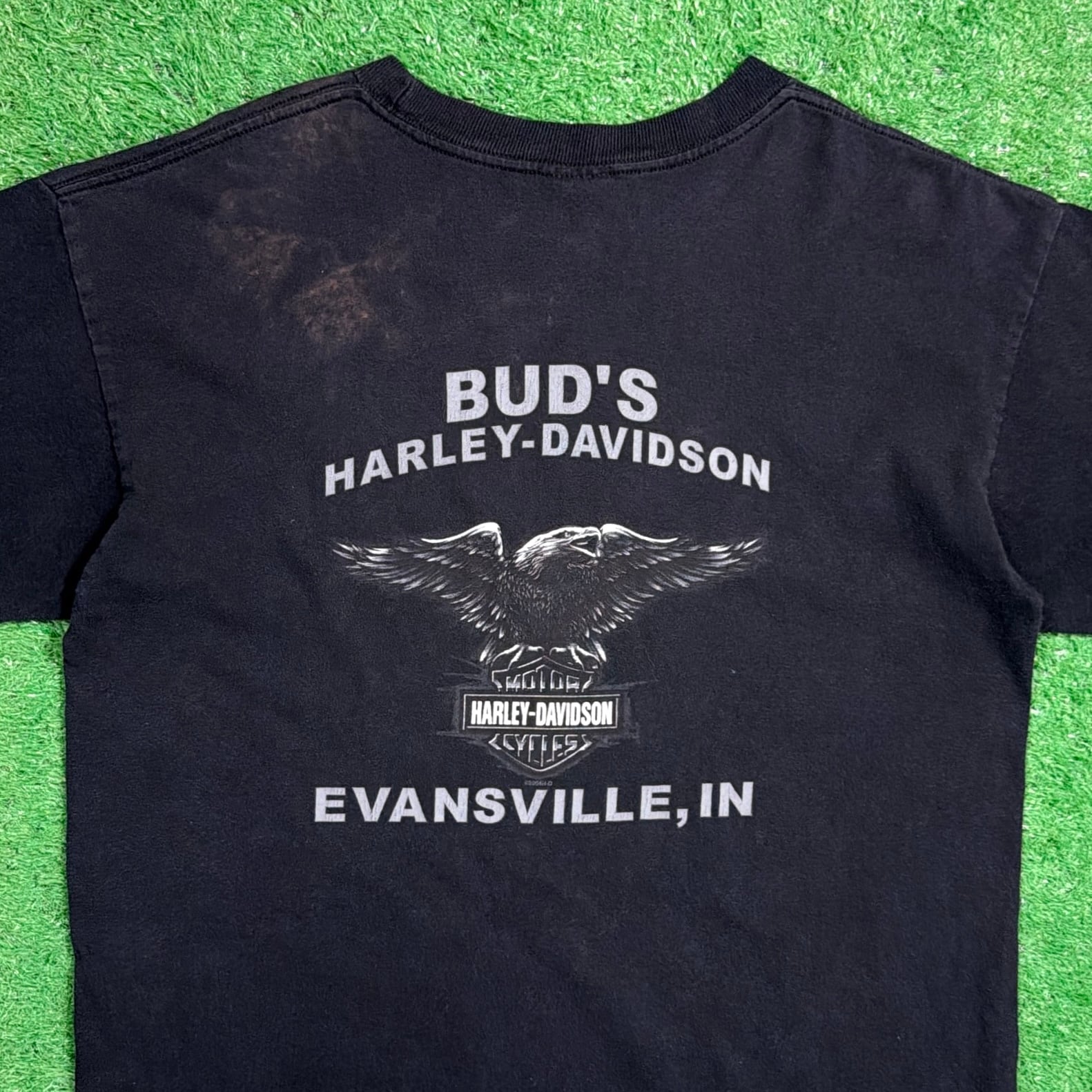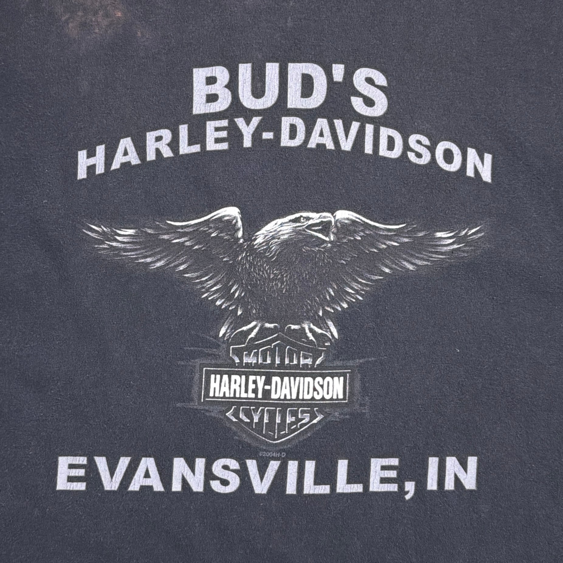 フロントにはインパクトのあるイーグルモチーフのロゴがプリントされ、ハーレーらしい無骨で存在感のあるデザインが魅力の一枚。バックには「BUD'S HARLEY-DAVIDSON」と「EVANSVILLE, IN(アメリカ・インディアナ州エバンズビル)」のプリントが入り、ローカル感のあるディーラーTシャツならではの雰囲気が楽しめます。