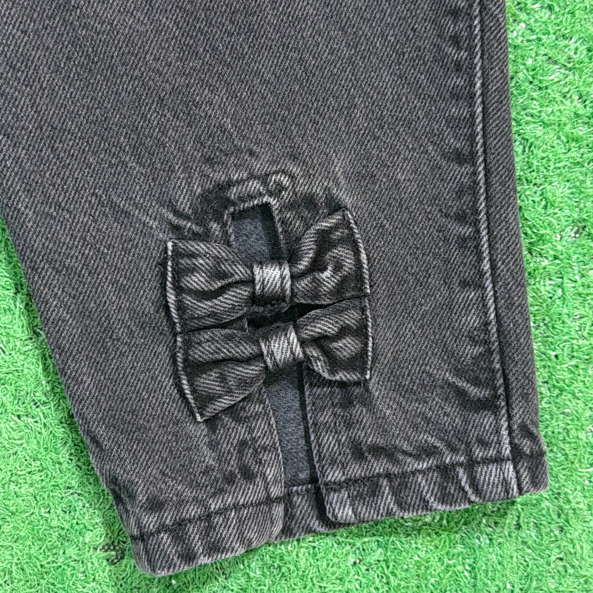 裾部分にはリボンのようなデザインディテールが施されており、シンプルなブラックデニムの中にさりげないアクセントが効いた一着。程よくテーパードの効いたシルエットで、バランスの取りやすいアイテムです。