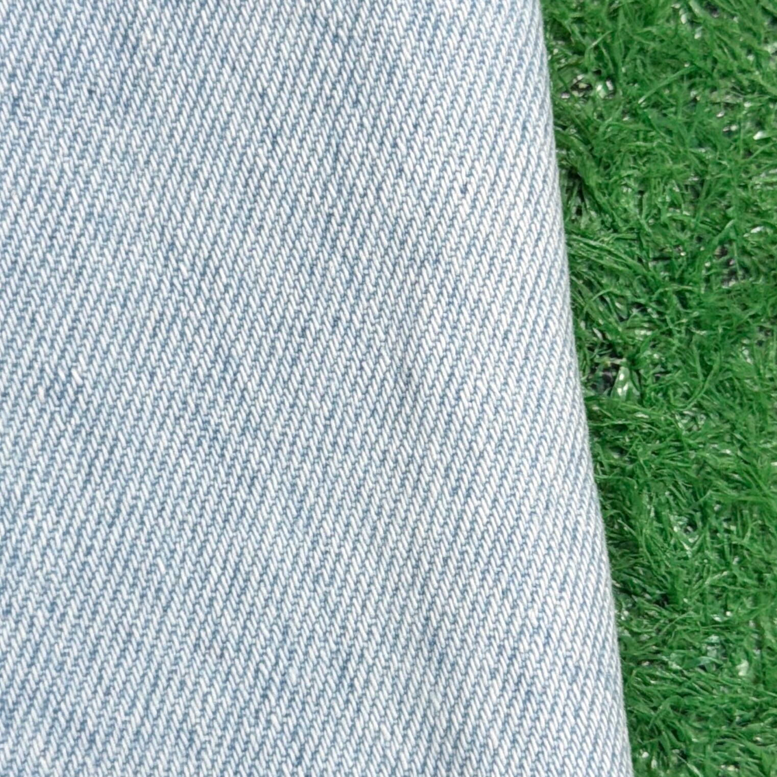 淡いライトブルーの色味が特徴的で、柔らかく爽やかな印象の一本。ハイウエスト仕様で、腰回りをすっきりと見せつつ、スタイルアップ効果も期待できるシルエットです。