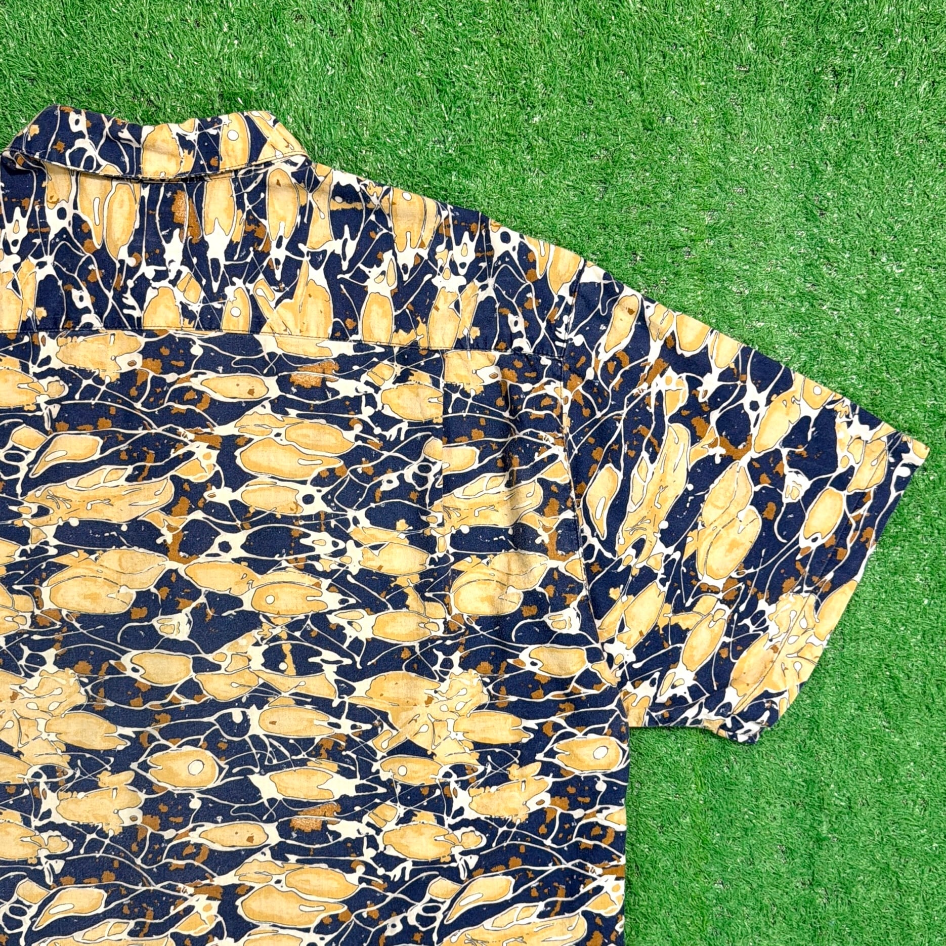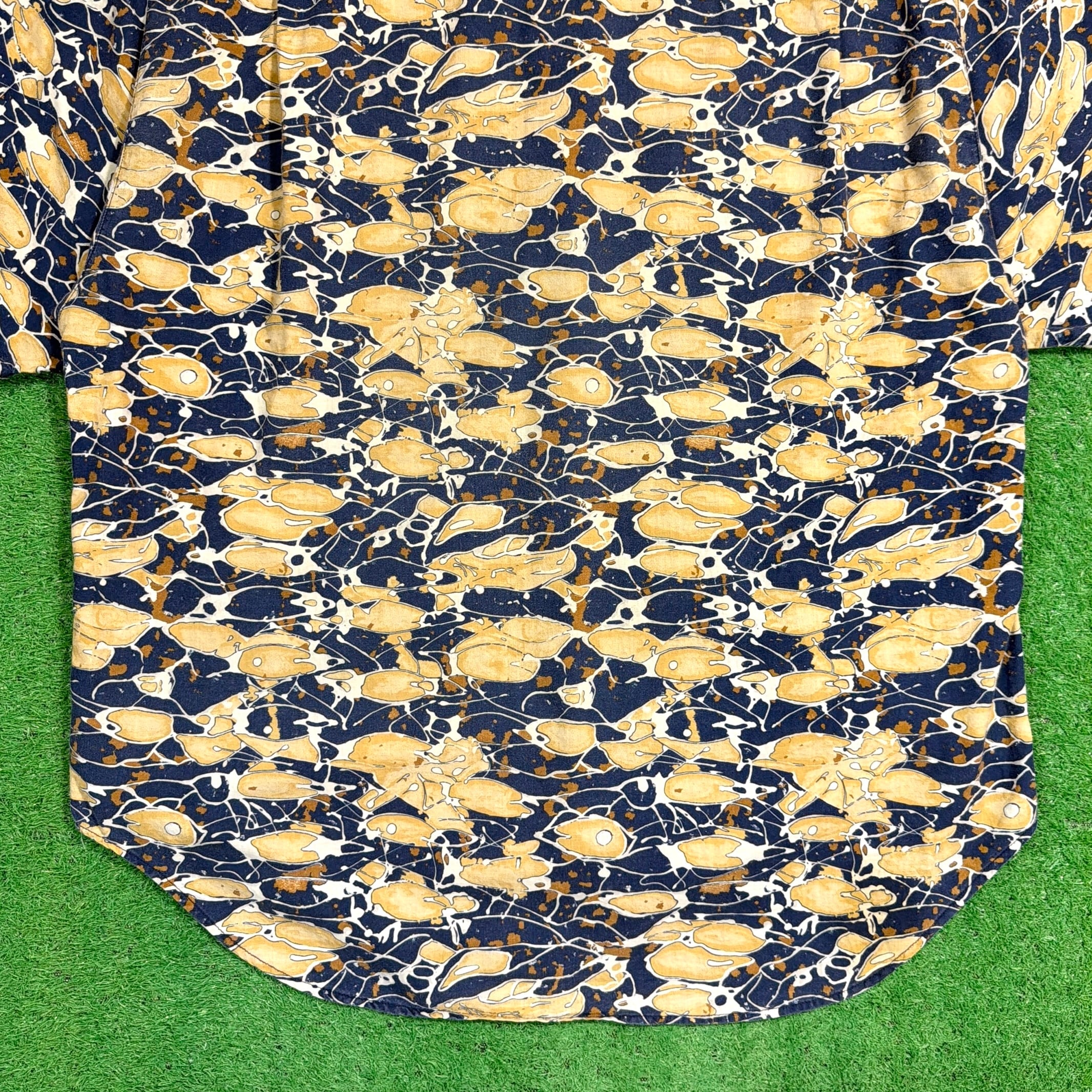 ネイビーとベージュをベースにした独特な総柄デザインが特徴的で、アートのような雰囲気を感じられる一枚。ランダムに配置されたような柄のバランスが良く、シンプルなコーデでもしっかり主役になるアイテムです。