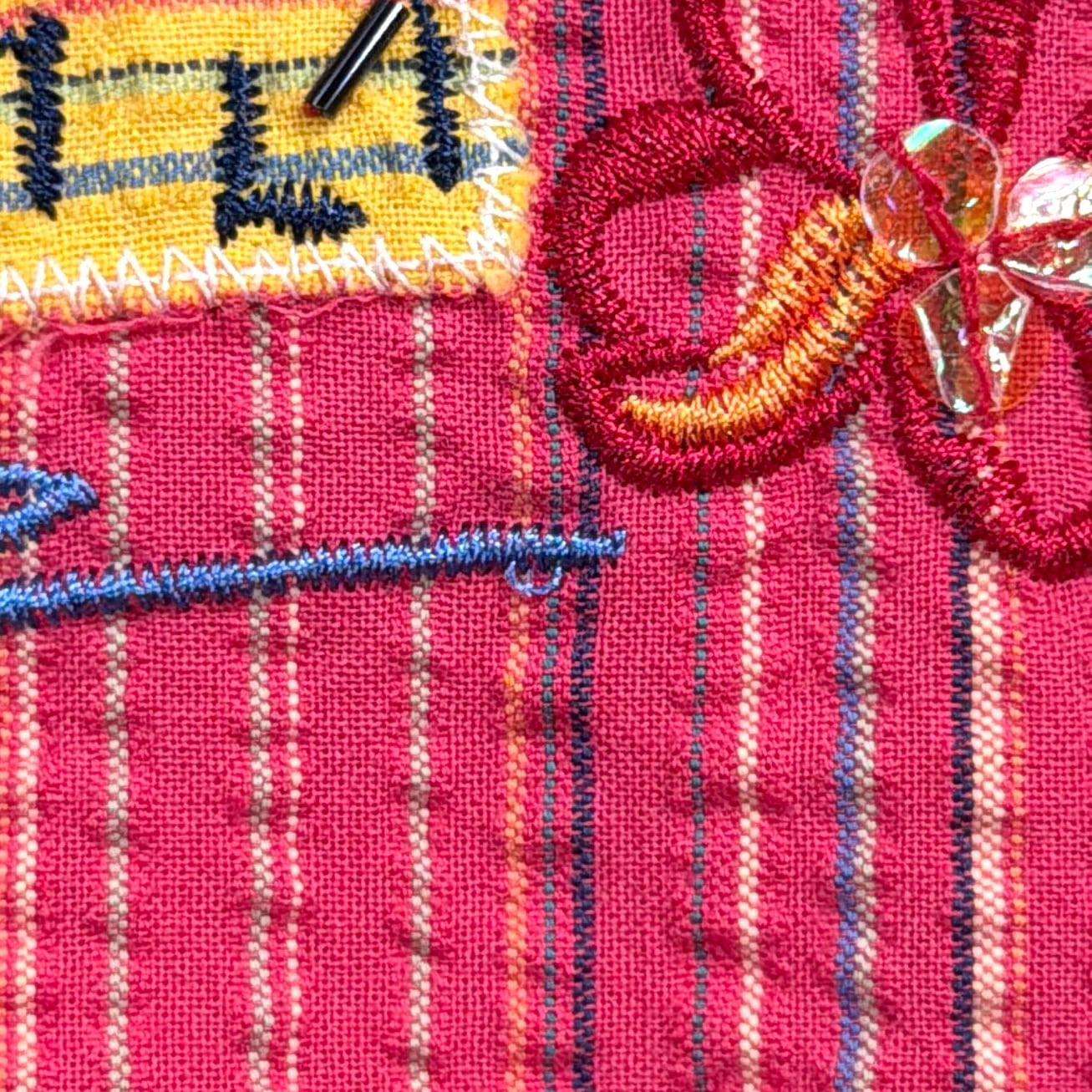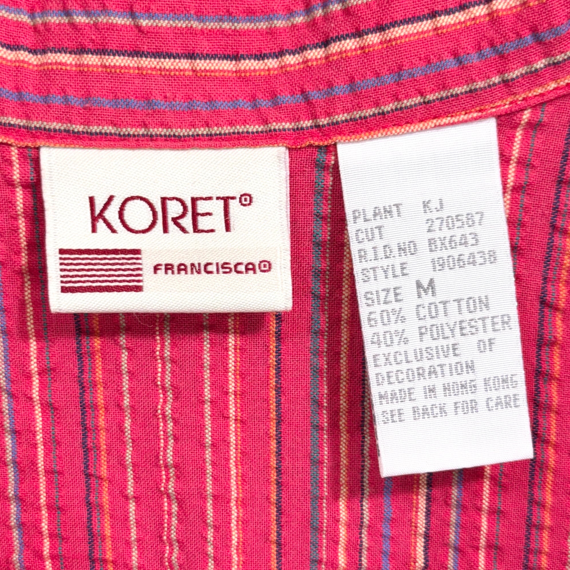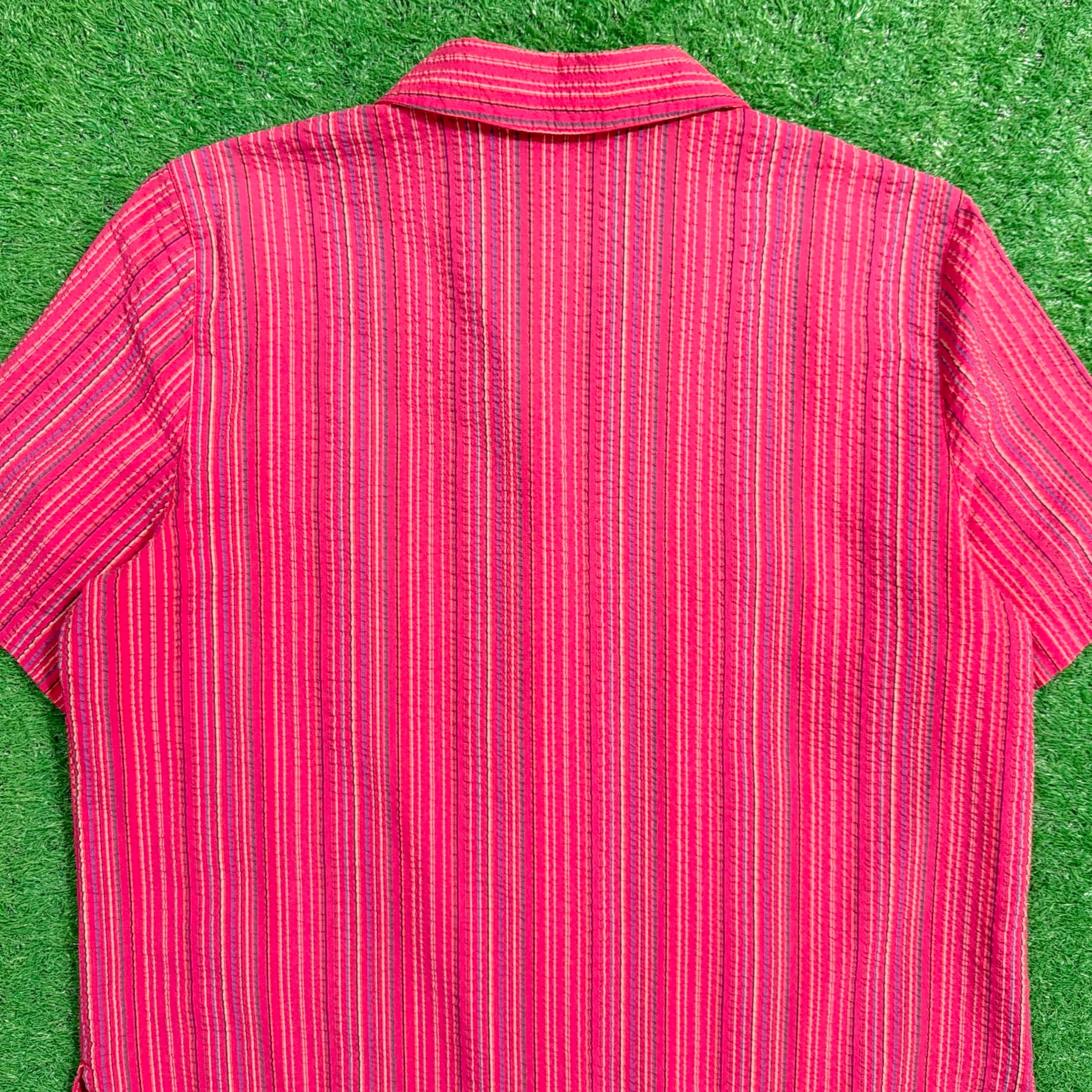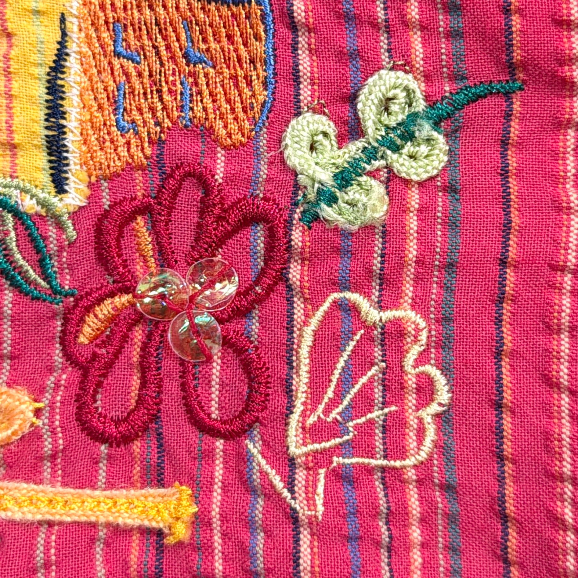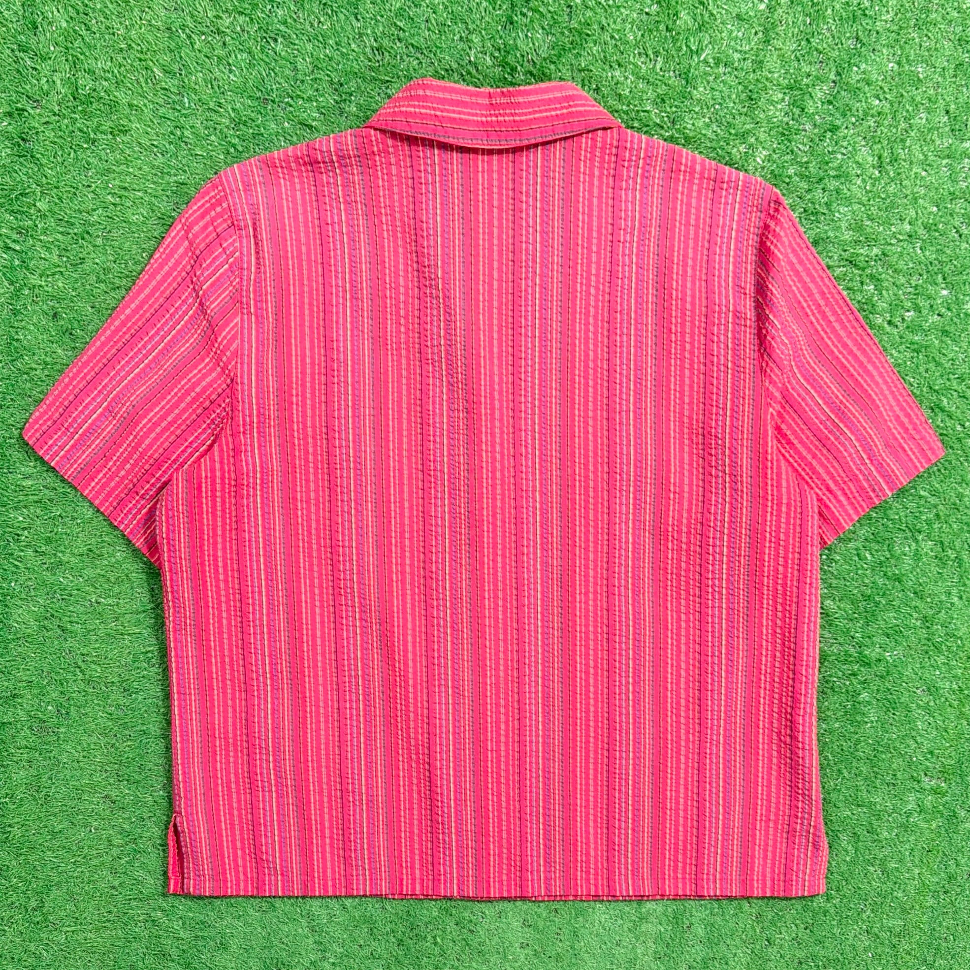 鮮やかなピンクベースに、ストライプがステッチで表現された立体感のある生地が特徴的な一枚。フロントにはトロピカルモチーフの刺繍が施されており、華やかで遊び心のあるデザインに仕上がっています。