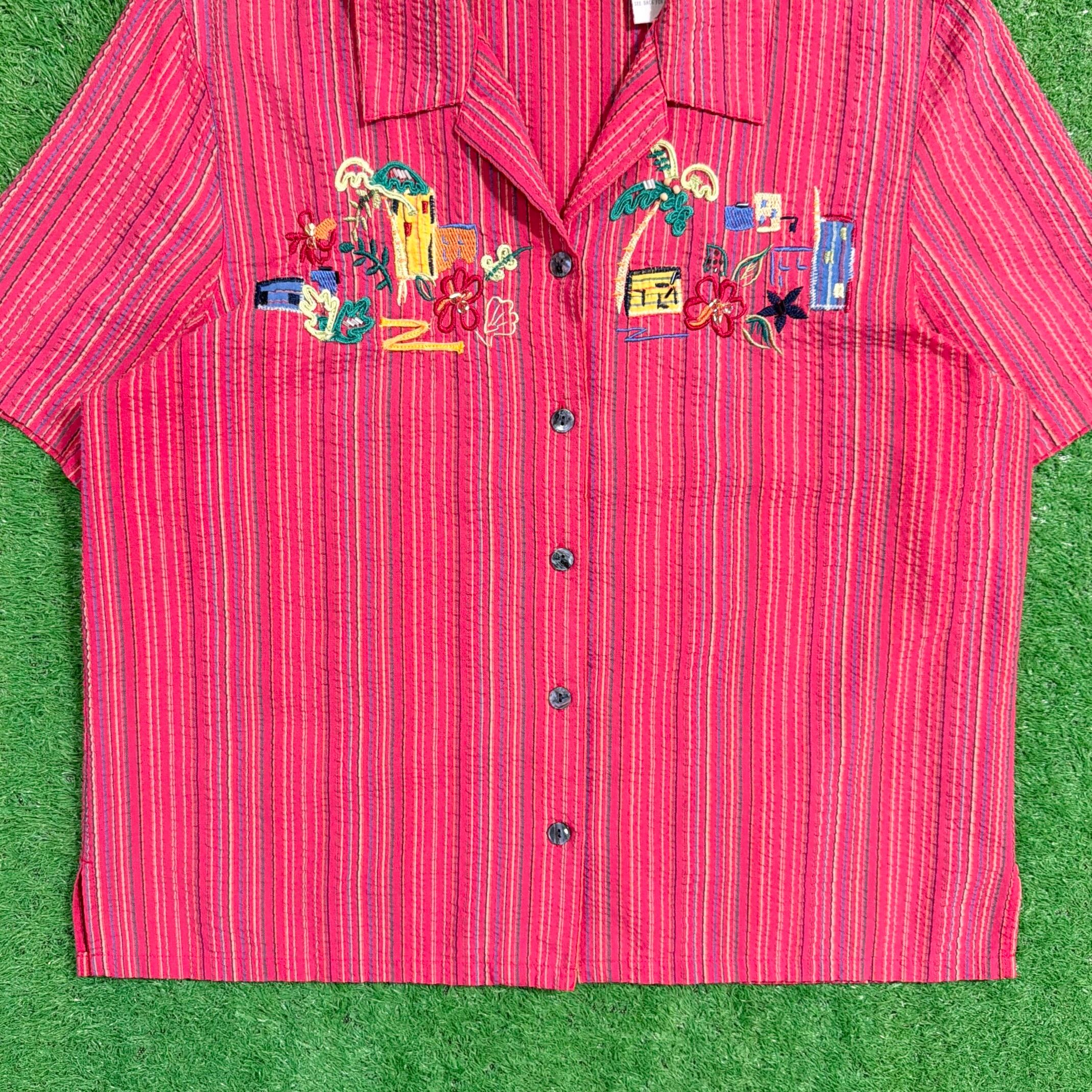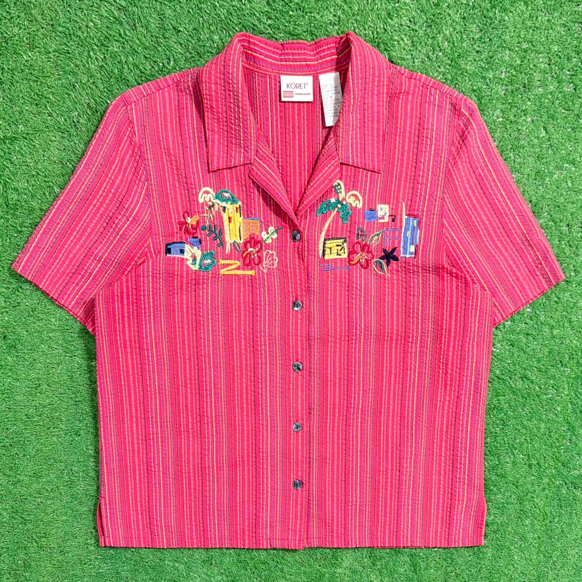 【Lady's】 90s トロピカル 刺繍 ストライプ 開襟シャツ / 90年代 古着 半袖 シャツ オープンカラー レディース 1714