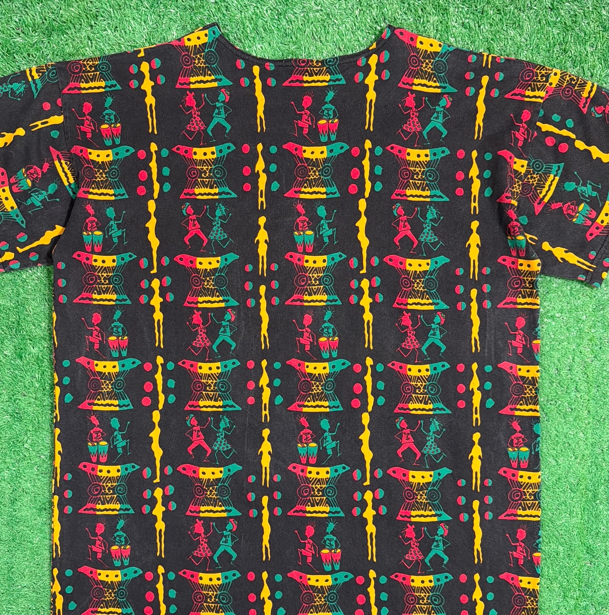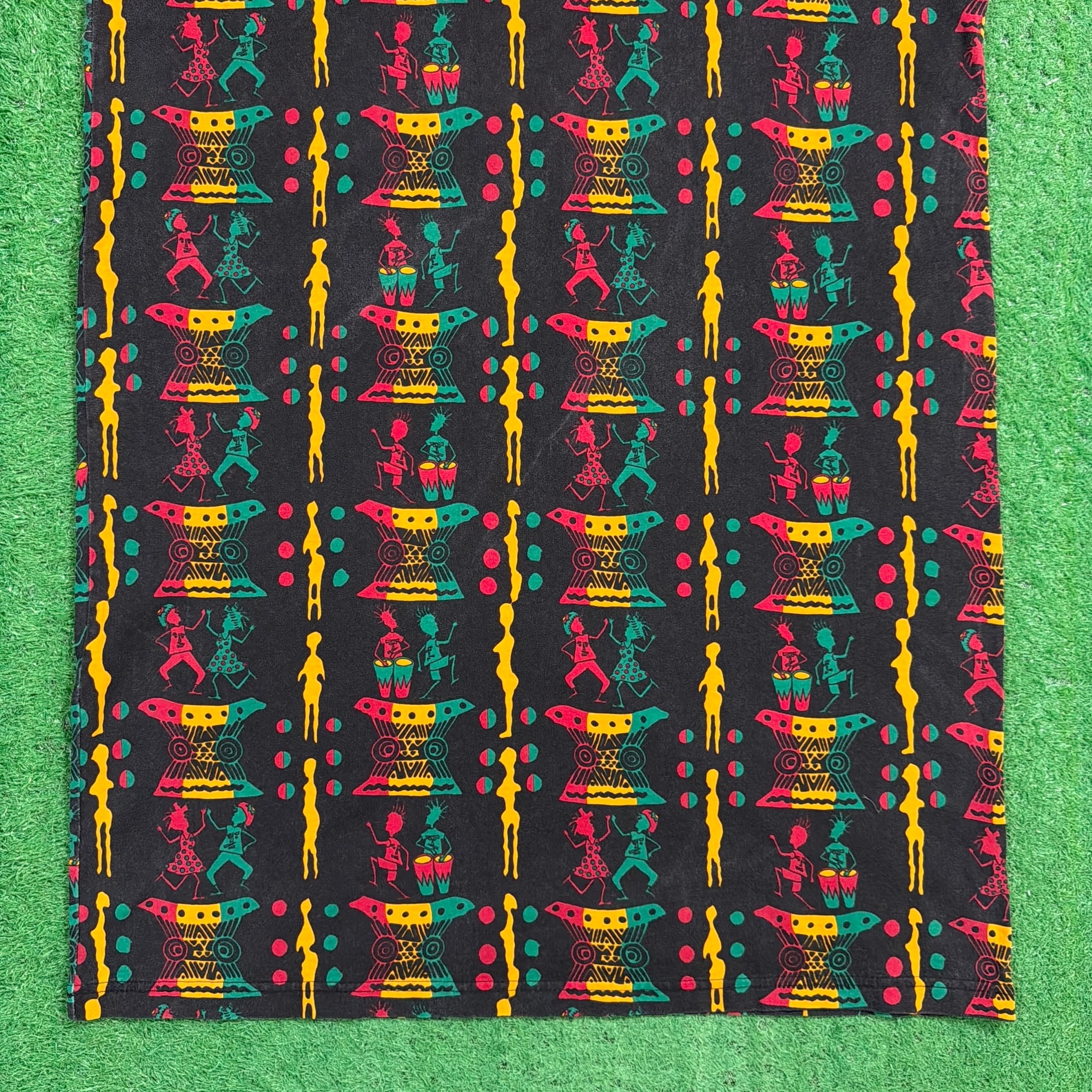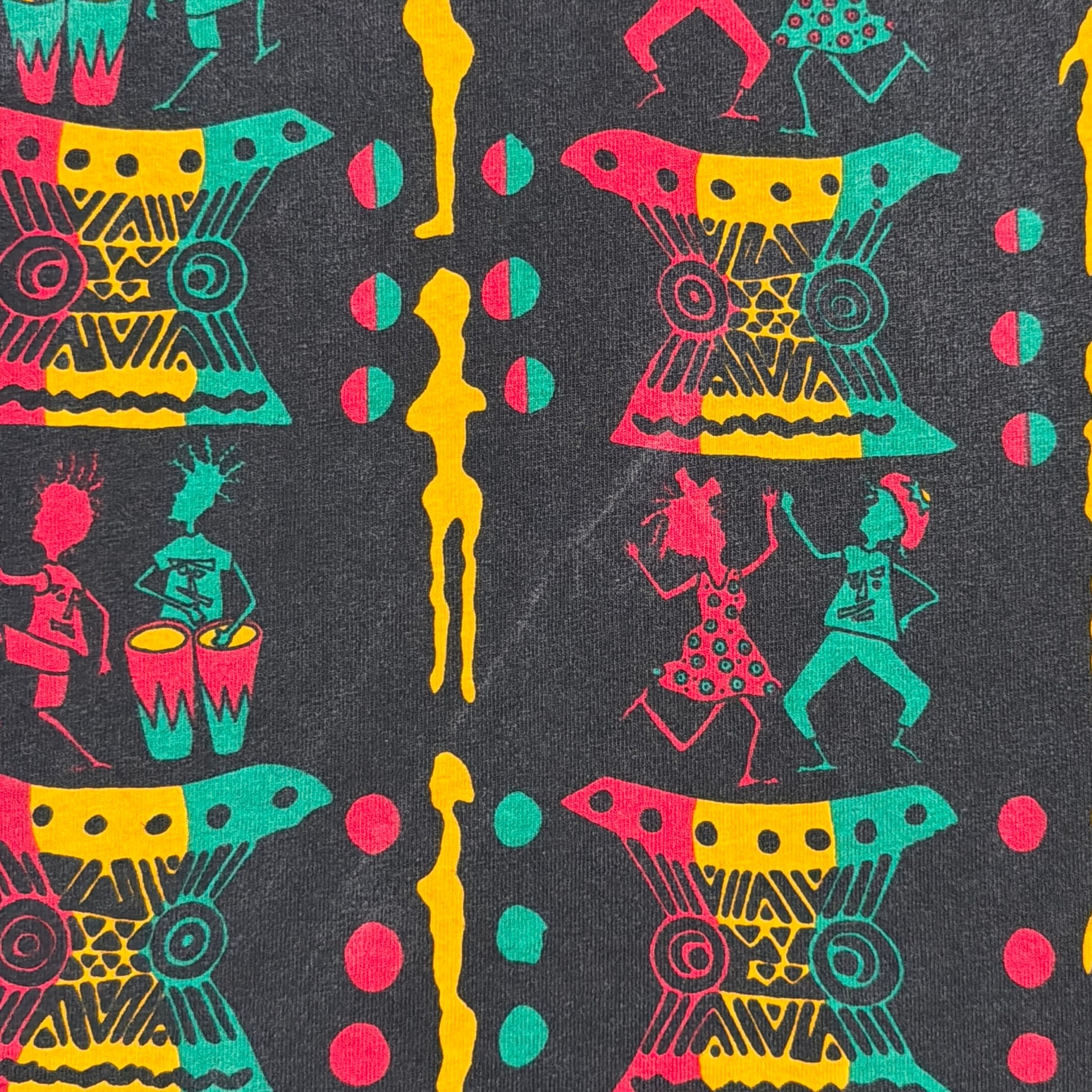 ブラックベースにラスタカラー(レッド・イエロー・グリーン)を使用した総柄デザインが特徴的な一枚。人物やモチーフがリズミカルに配置されており、レゲエやアフリカンカルチャーを感じさせるインパクトのあるデザインに仕上がっています。