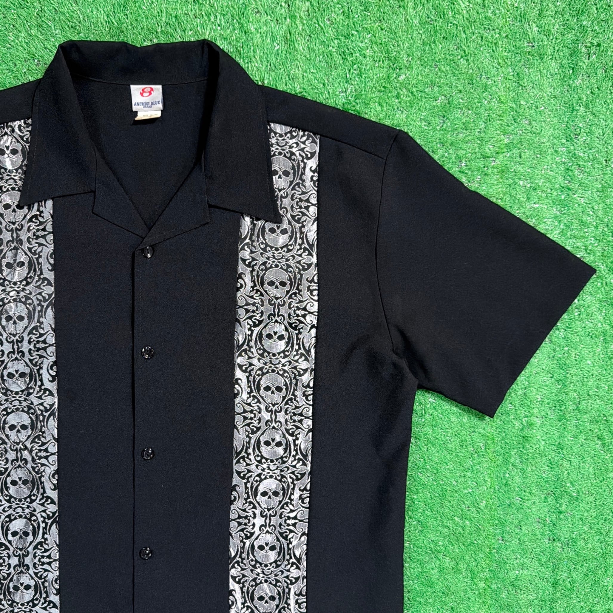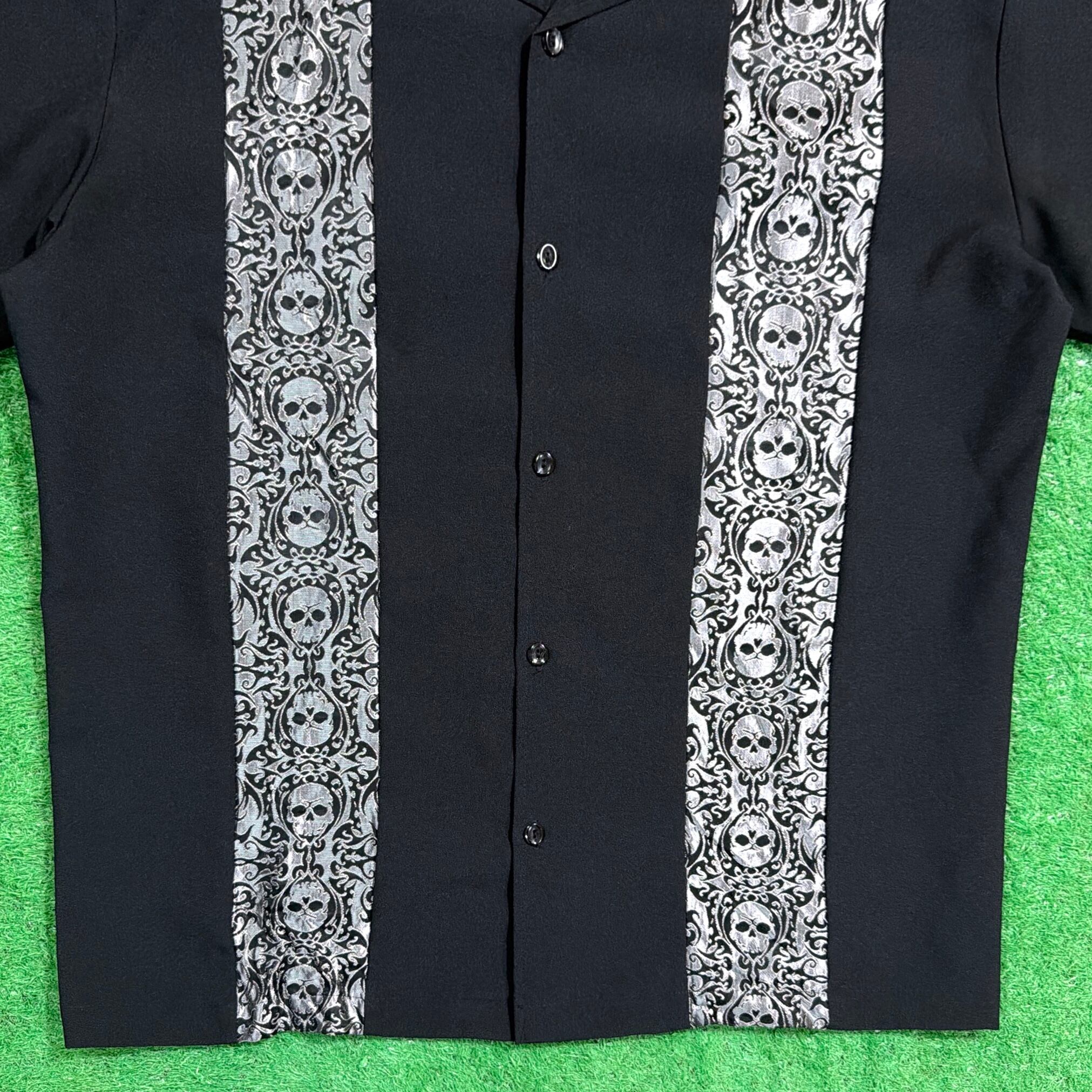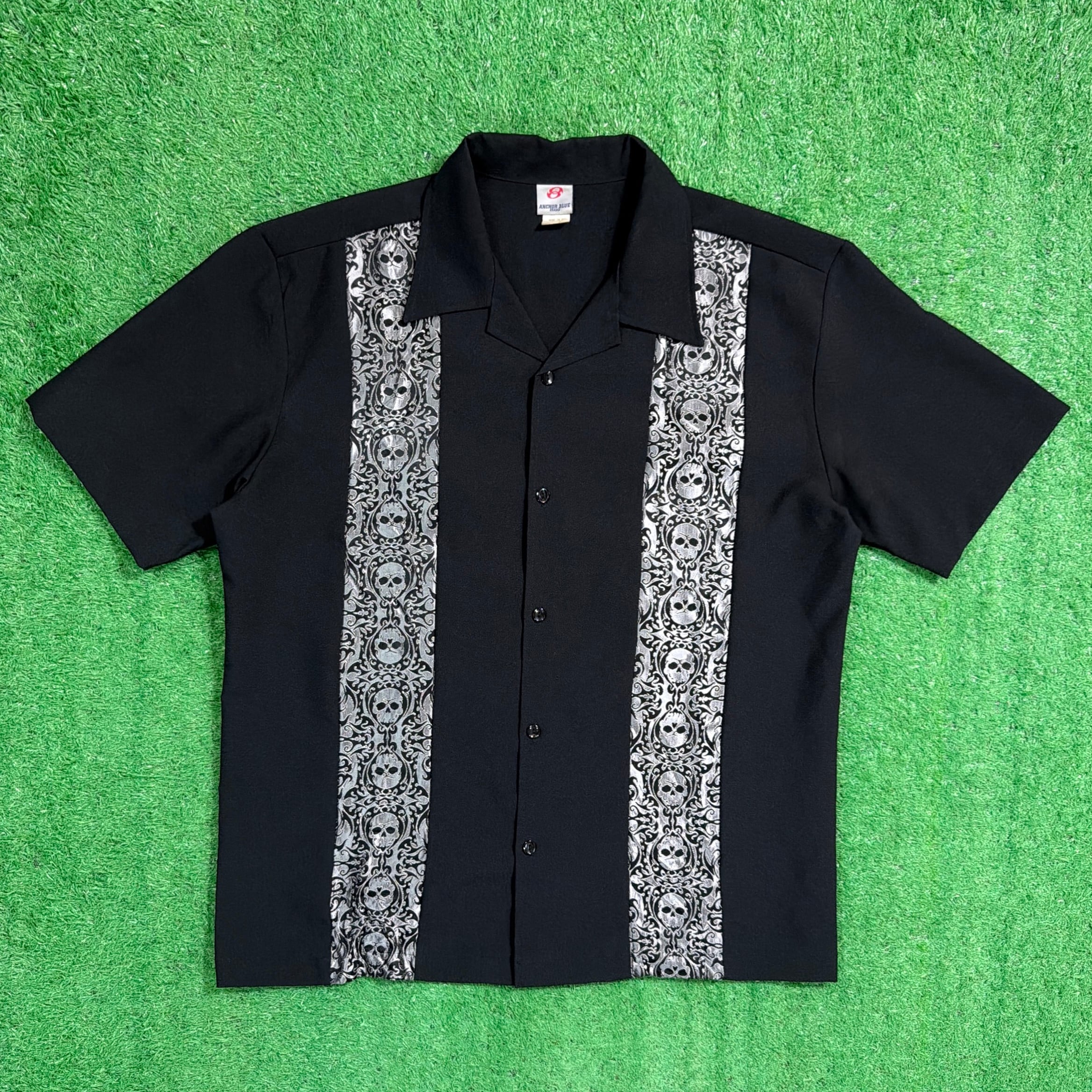 ブラックボディにフロントの縦ラインデザインが映える、シンプルながら存在感のある一枚。柄入りの切り替えがアクセントになっており、ボーリングシャツやロカビリースタイルを感じさせる雰囲気が魅力です。