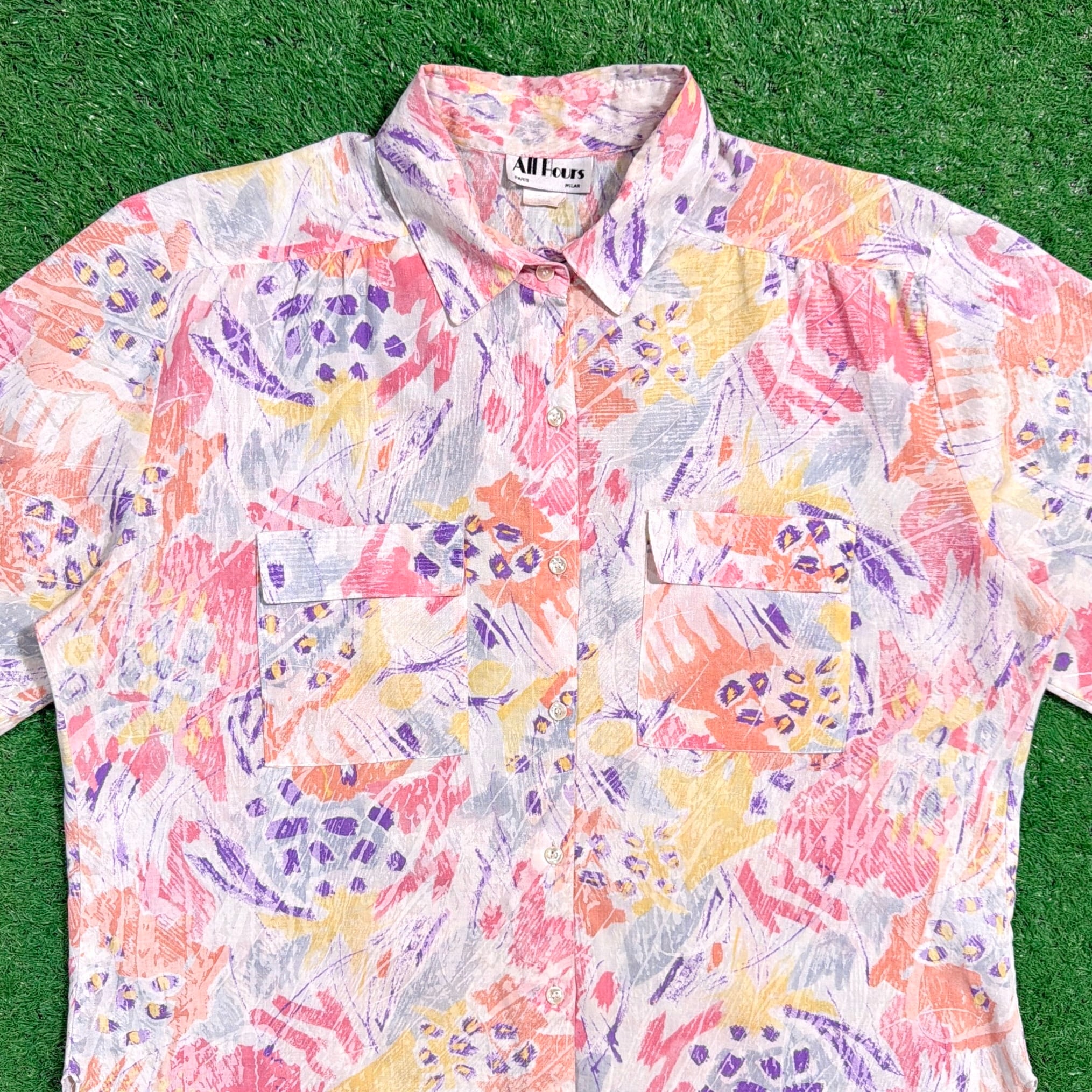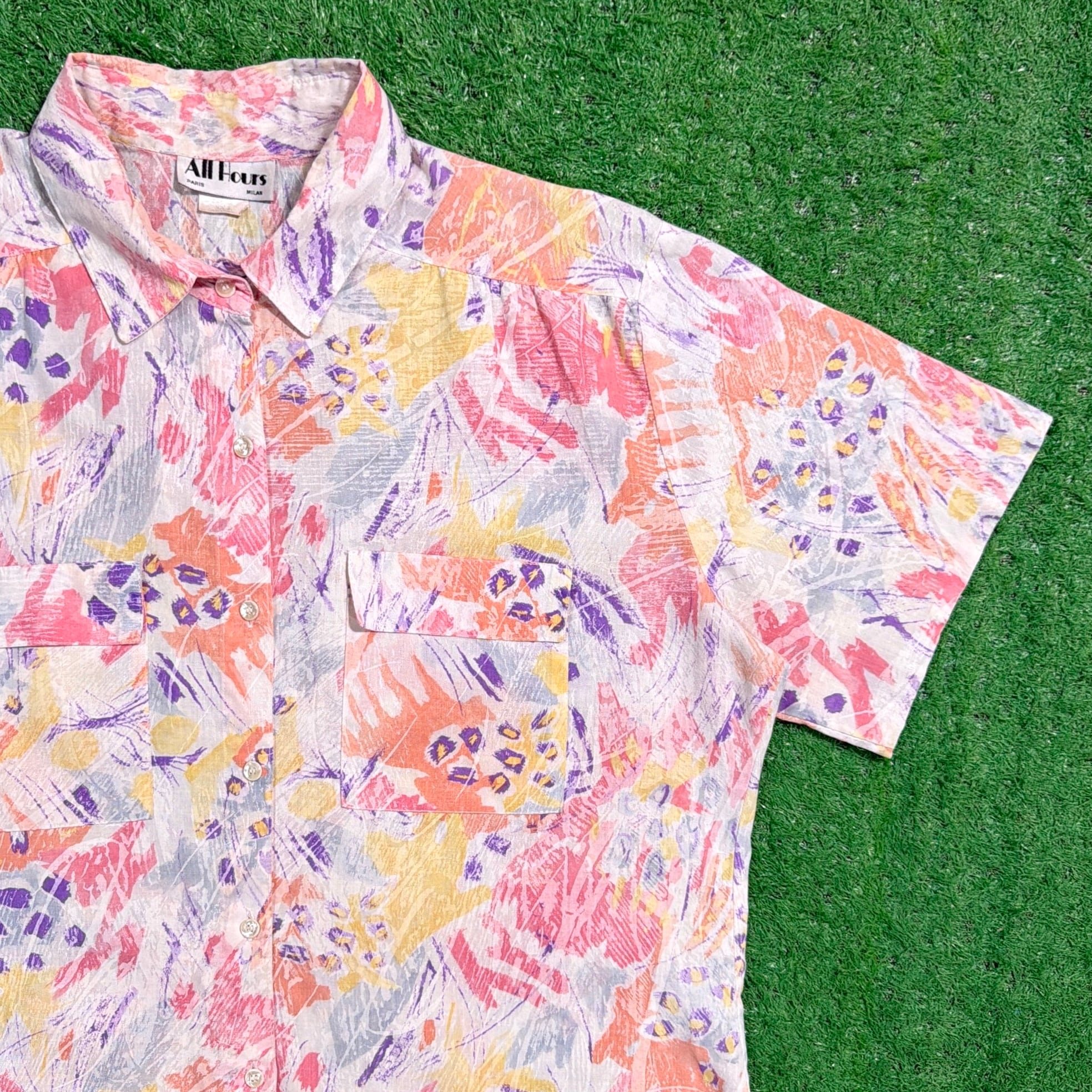 【Lady's】 80s アート柄 半袖 シャツ / アメリカ製 USA製 80年代 半袖シャツ 総柄 柄シャツ レディース 古着 1718