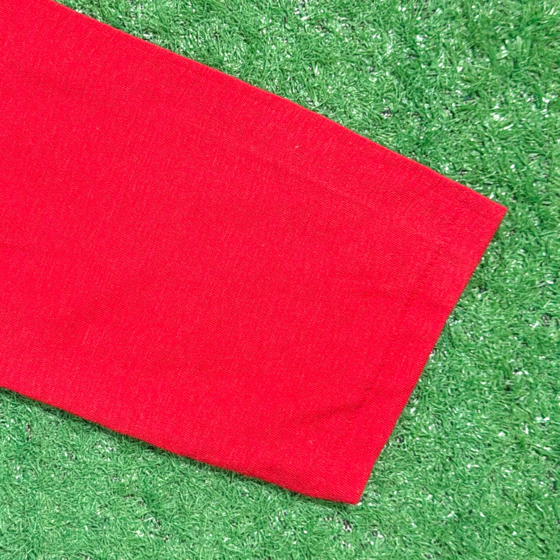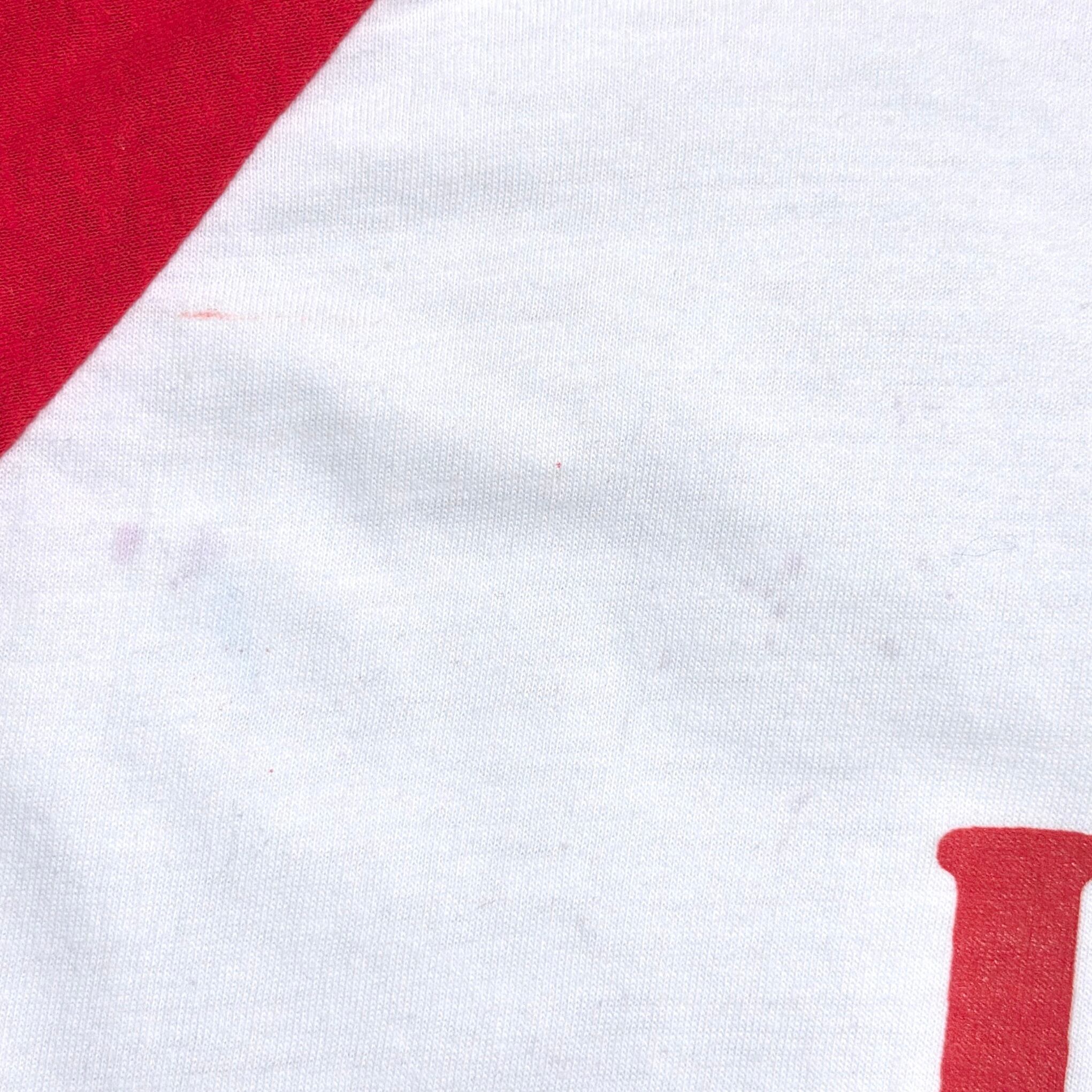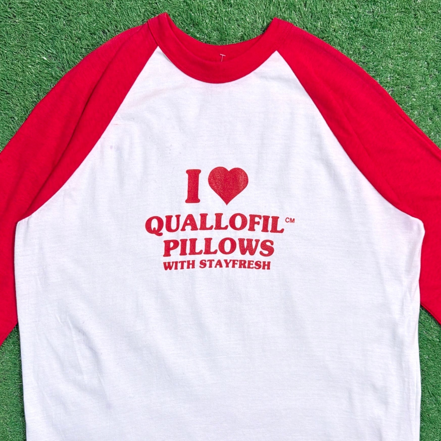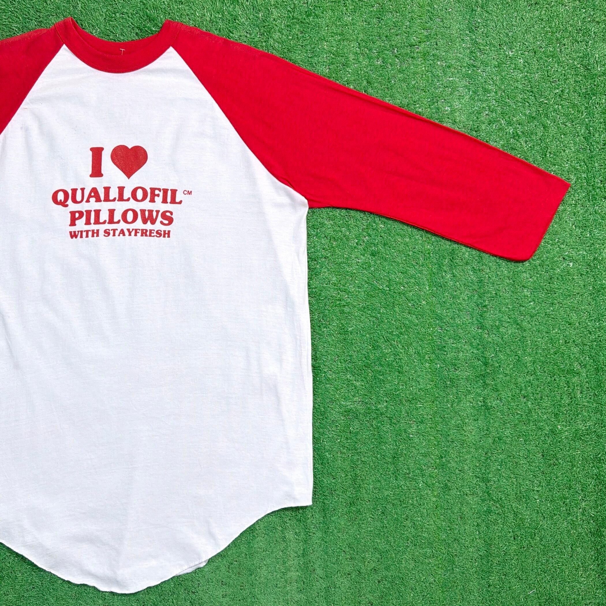 ホワイトボディにレッドのラグランスリーブが映える、クラシックな配色が魅力の一枚。フロントには「I ♥ QUALLOFIL PILLOWS WITH STAYFRESH」と入ったプリントが施されており、枕などに使われる中綿素材“Quallofil”のプロモーションとして作られた、企業系ならではのユニークなデザインです。