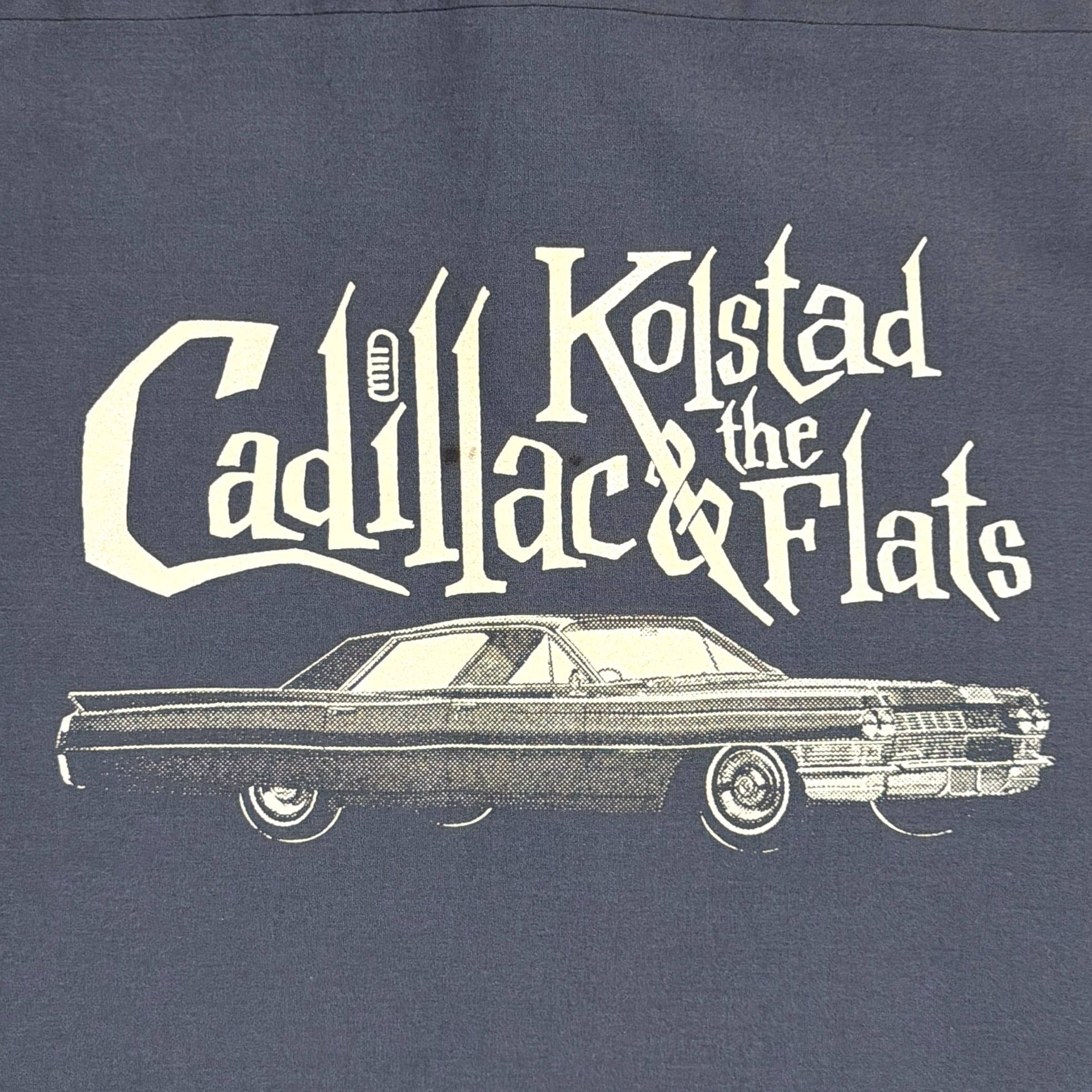 ブラックボディに、バックには「Kolstad Cadillac the Flats」とキャデラックのイラストが入ったデザインが特徴的な一枚。アメリカのキャデラック専門ディーラーやカスタムショップのものと見られる、企業系ならではの雰囲気が魅力です。
