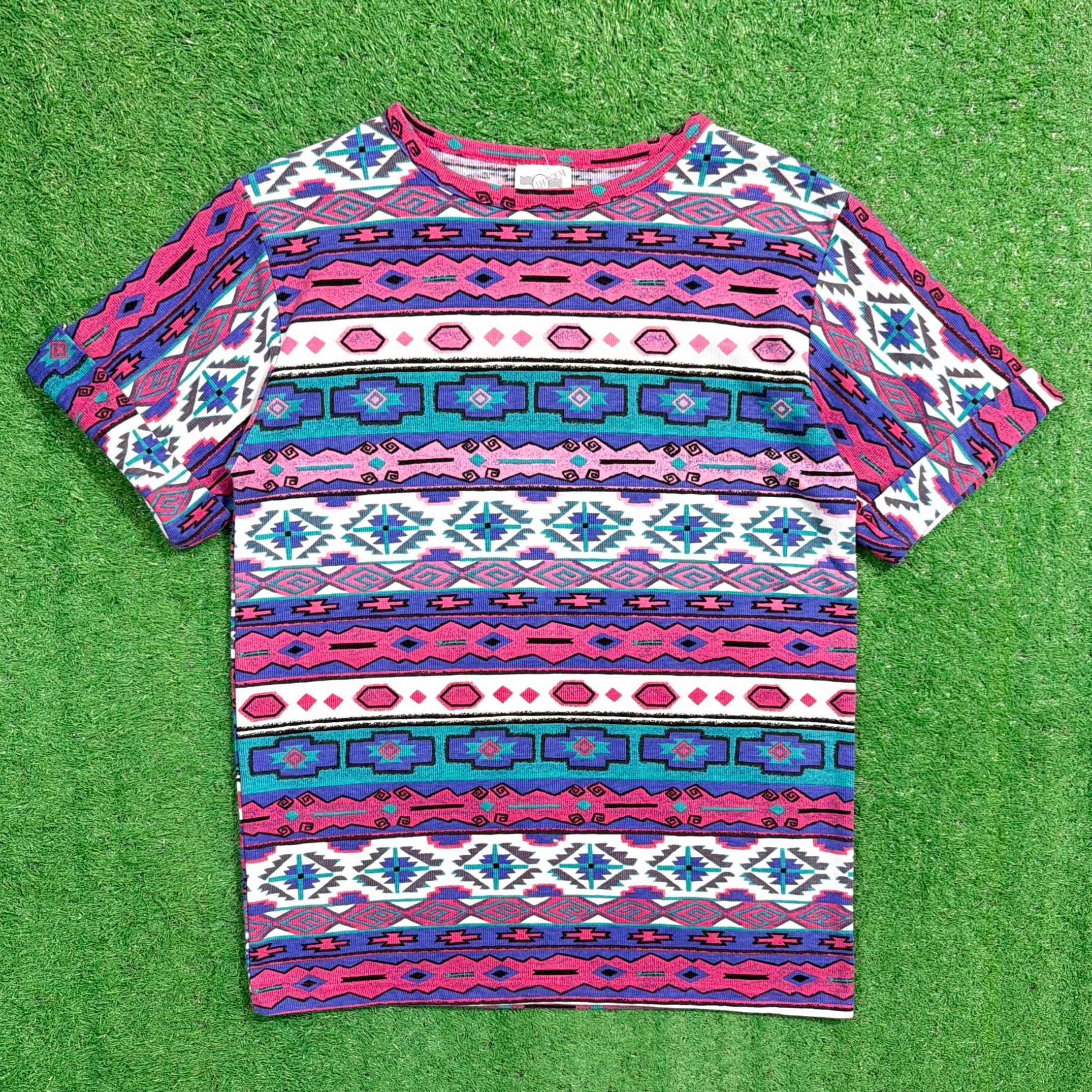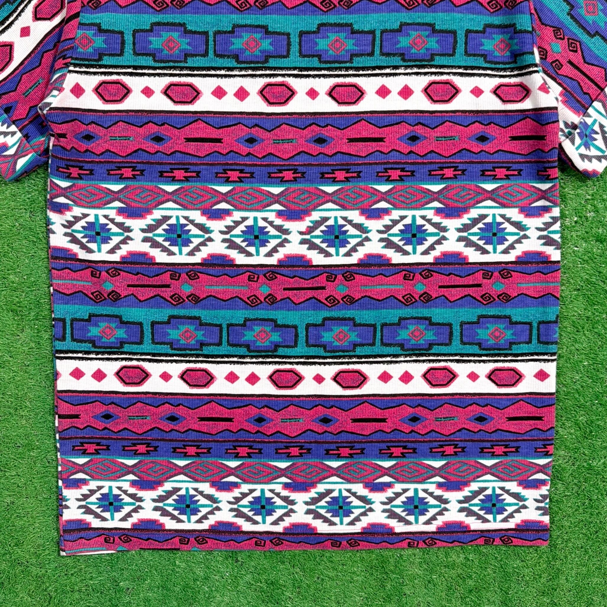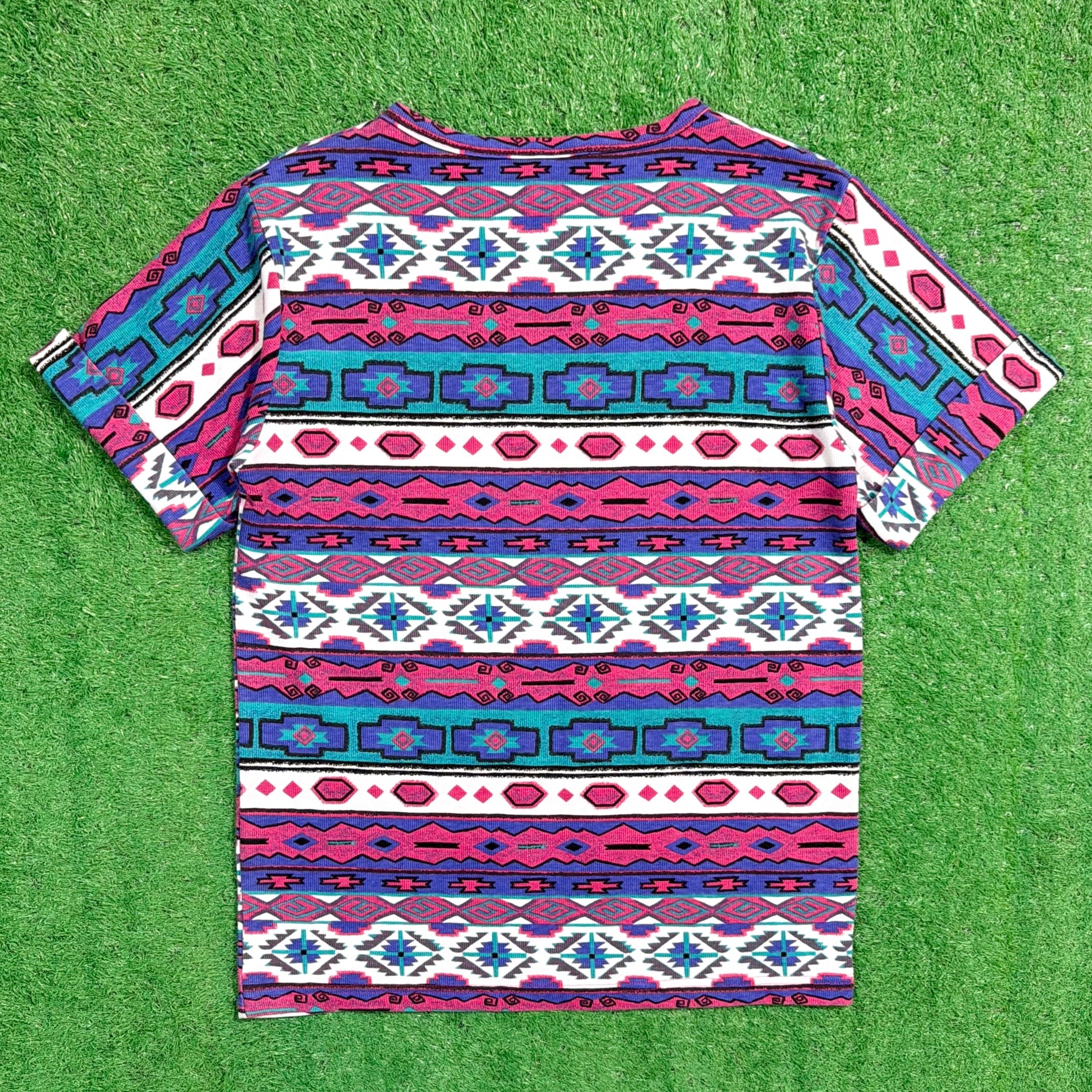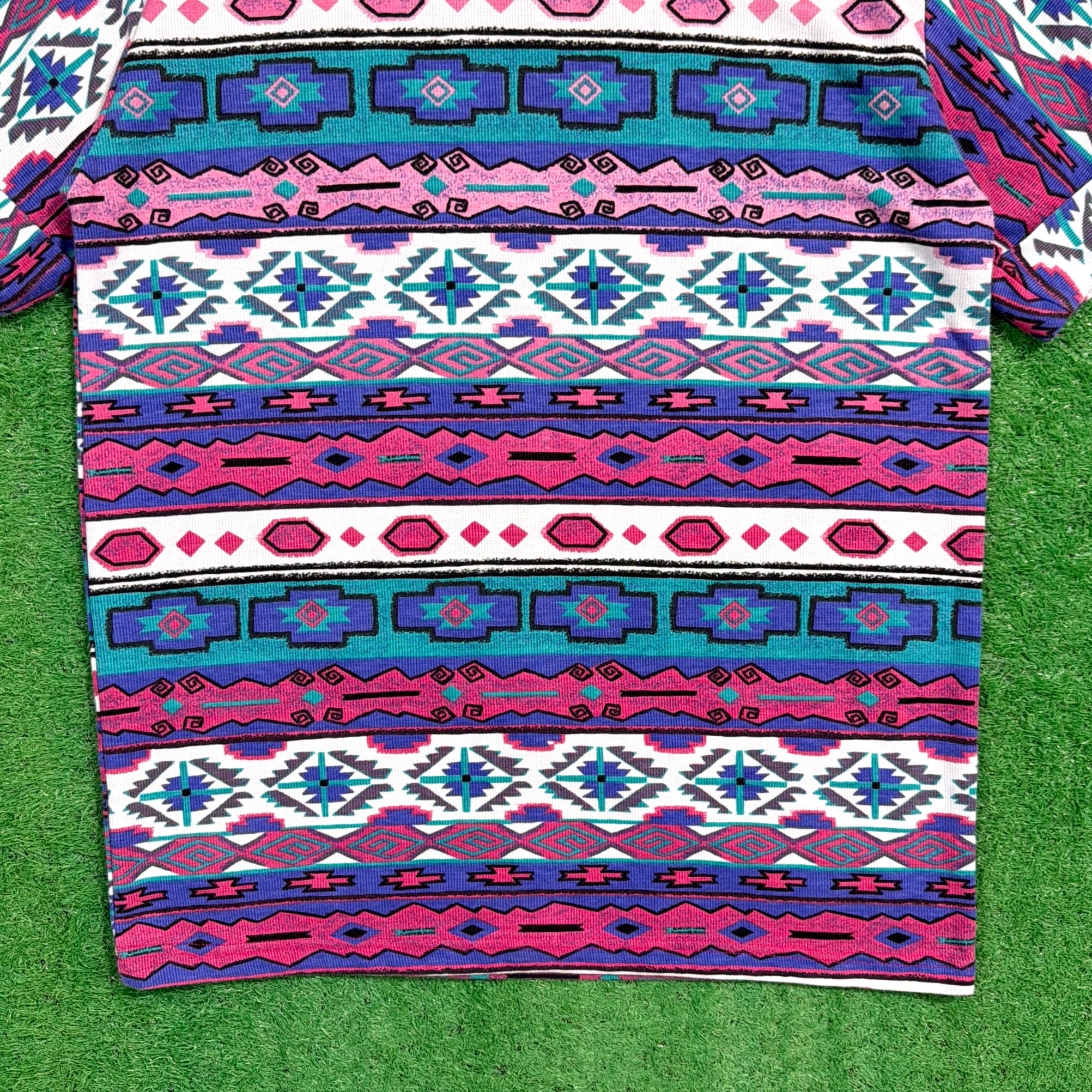ピンクやブルーを基調としたネイティブ調の総柄デザインが目を引く一枚。細かい柄がボーダー状に配置されており、90年代らしいポップさと民族調の雰囲気が絶妙にミックスされたデザインです。