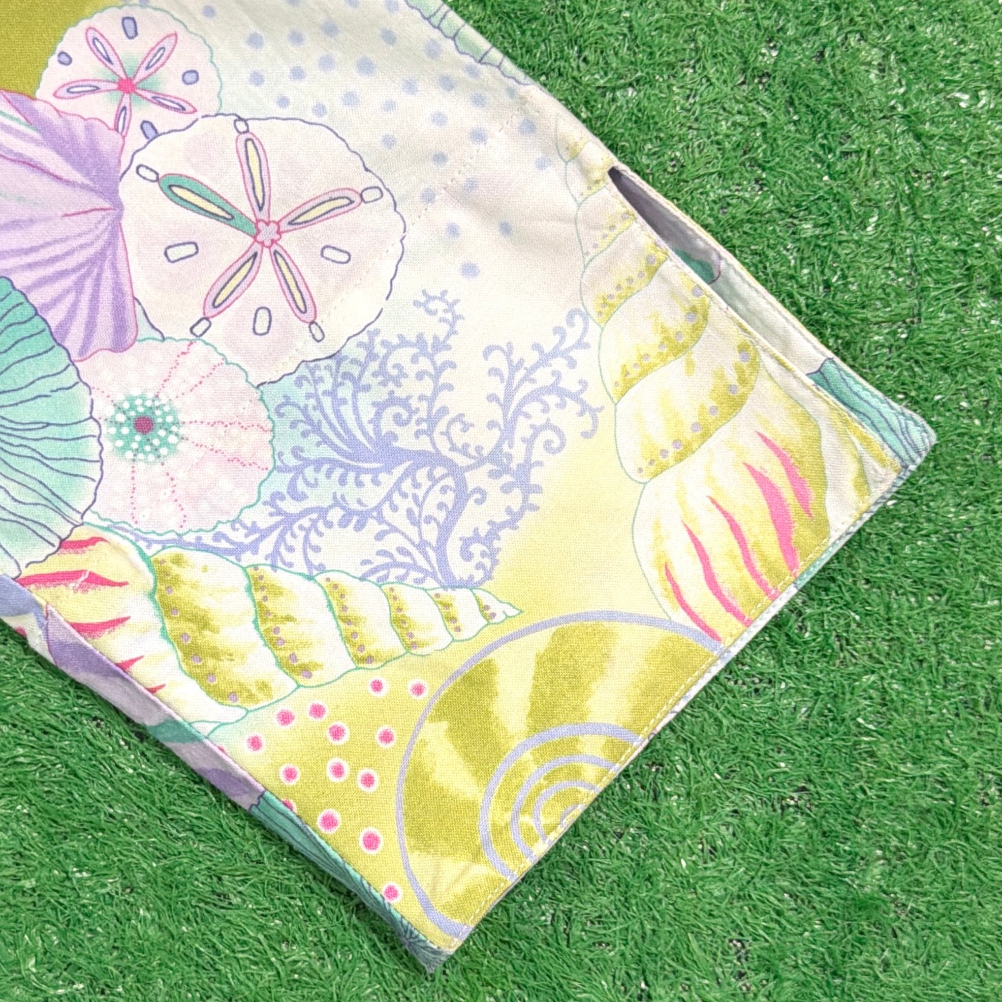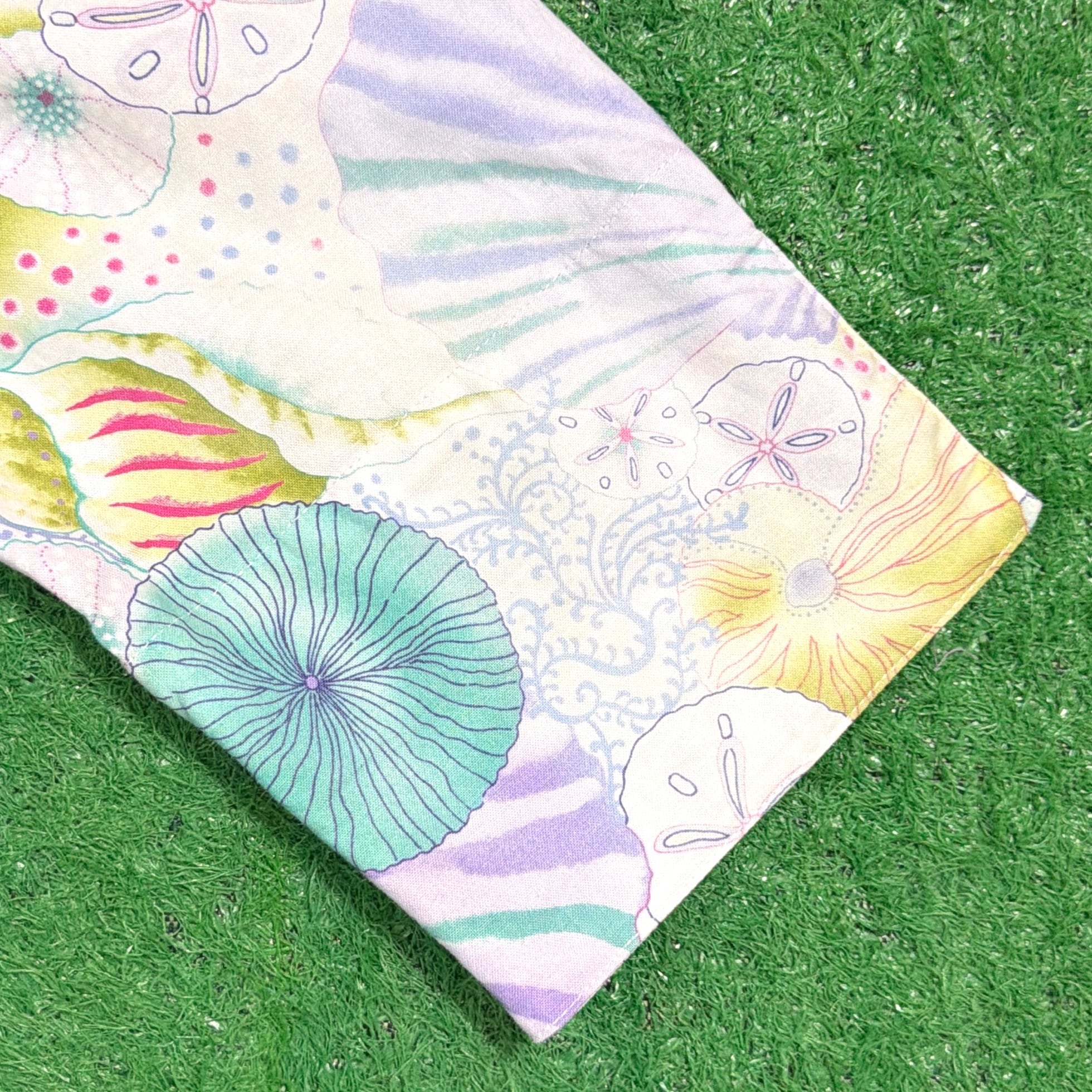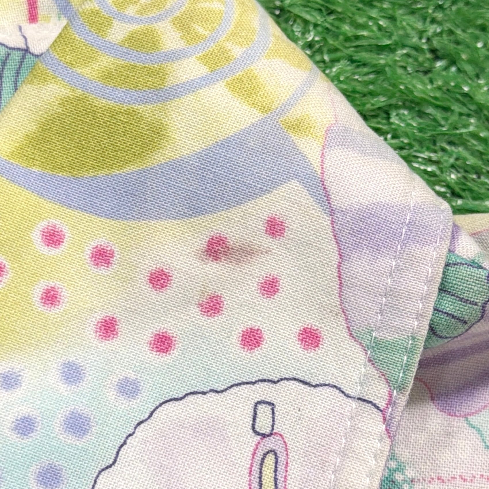 淡いパステルカラーをベースに、ボタニカルモチーフが全体に広がる柔らかい印象の一枚。優しい色味と細かい総柄デザインが、ナチュラルでリラックス感のある雰囲気を演出してくれます。