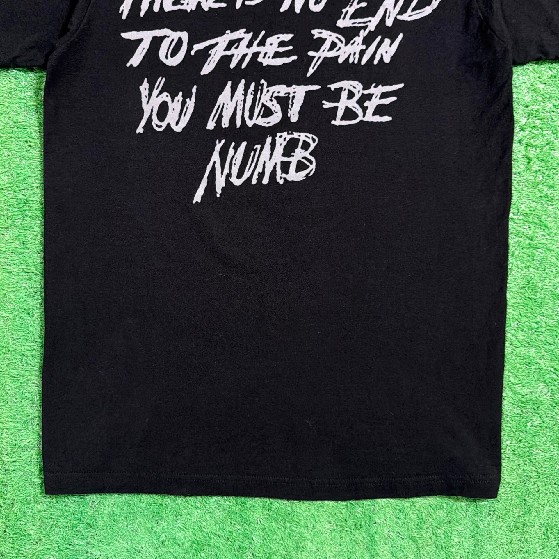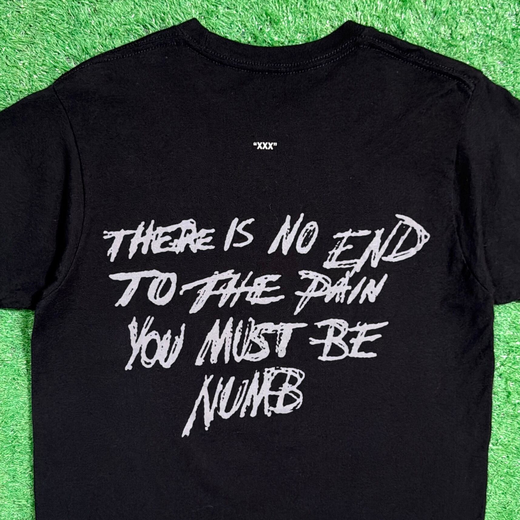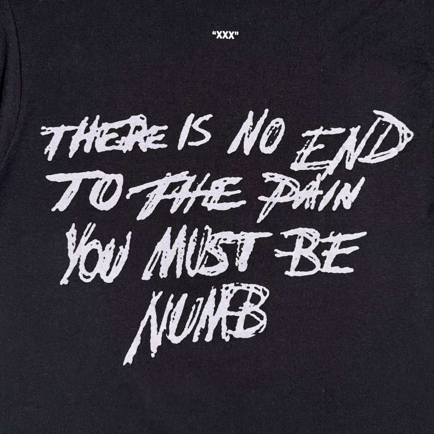 フロントには印象的なフォトプリント、バックには「There is no end to the pain you must be numb(痛みに終わりはない、無感覚になるしかない)」というメッセージが大胆にプリントされた一枚。シンプルながらも強い存在感とストーリー性を感じられるデザインです。