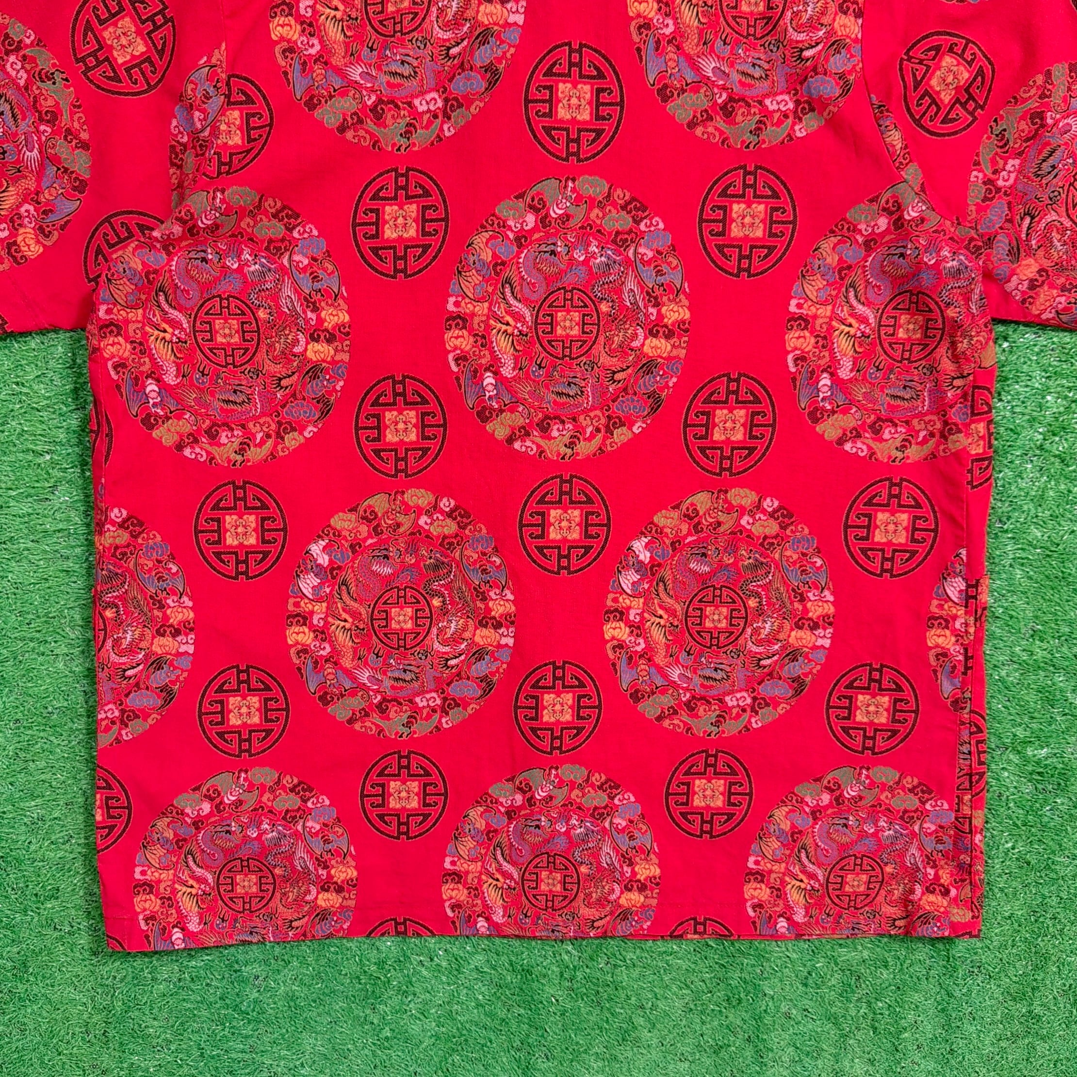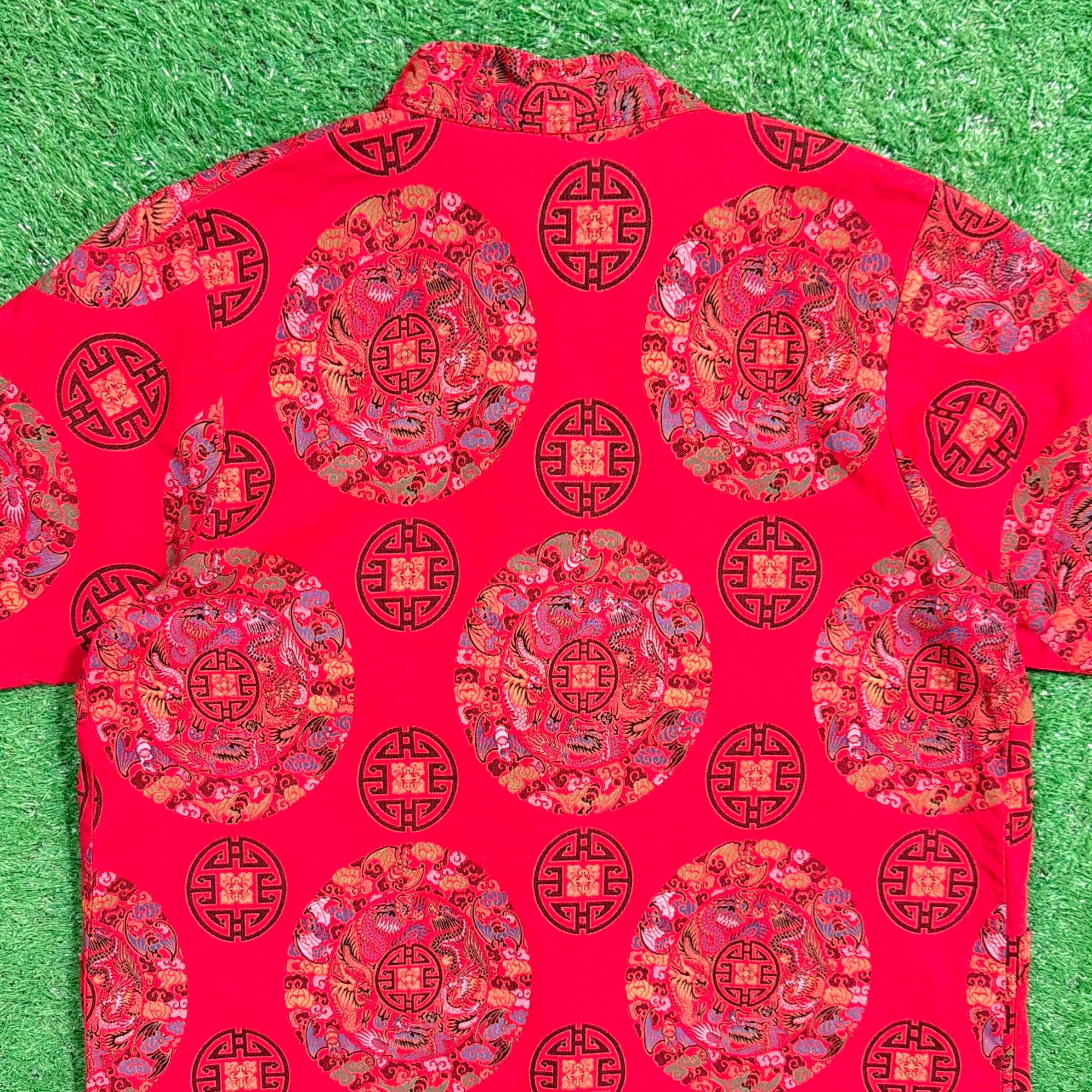 鮮やかなレッドベースに、中国のモチーフを思わせる円形柄が全面に施された存在感のある一枚。総柄ながらも規則的な配置で、まとまりのある印象に仕上がっています。