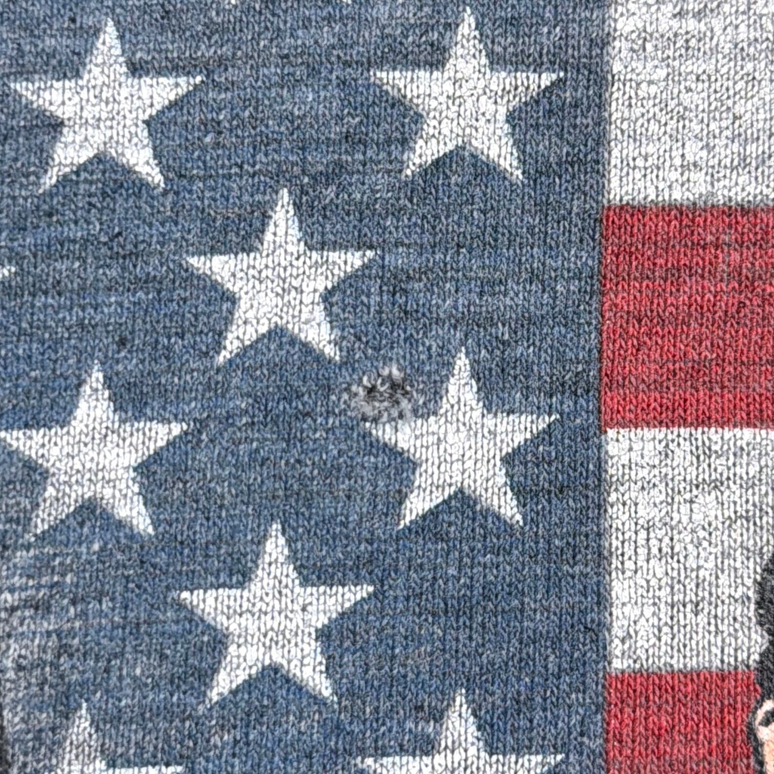 フロントにはアメリカ国旗を背景に、DCを代表するヒーローたちが並ぶインパクトのあるデザイン。中央にスーパーマン、その周りにバットマン、フラッシュ、グリーンランタンなどが描かれた、豪華な構成の一枚です。