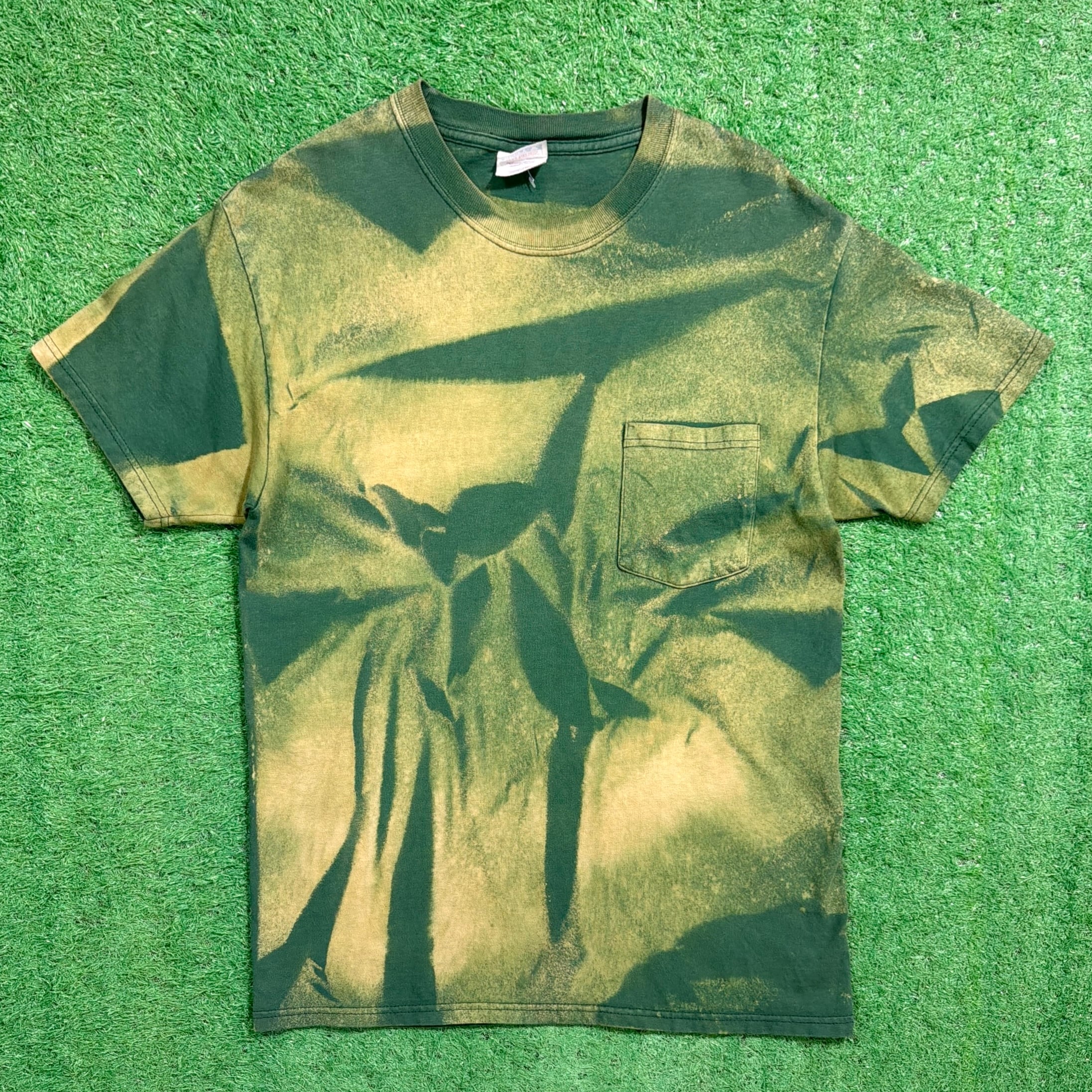全体に施されたブリーチ加工が特徴的な一枚。中央に向かって色が抜けたグラデーションのような仕上がりで、霧状のムラ感が独特の雰囲気を演出しています。