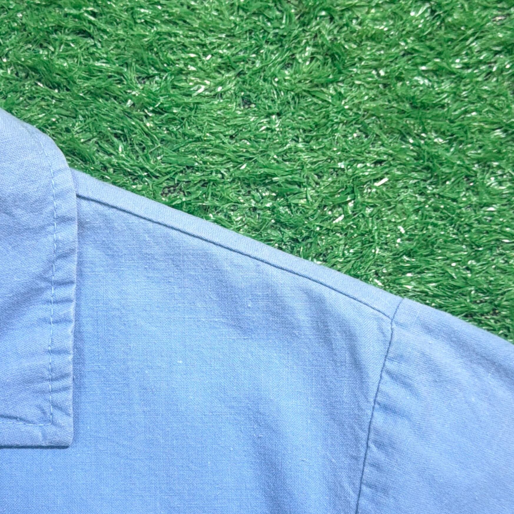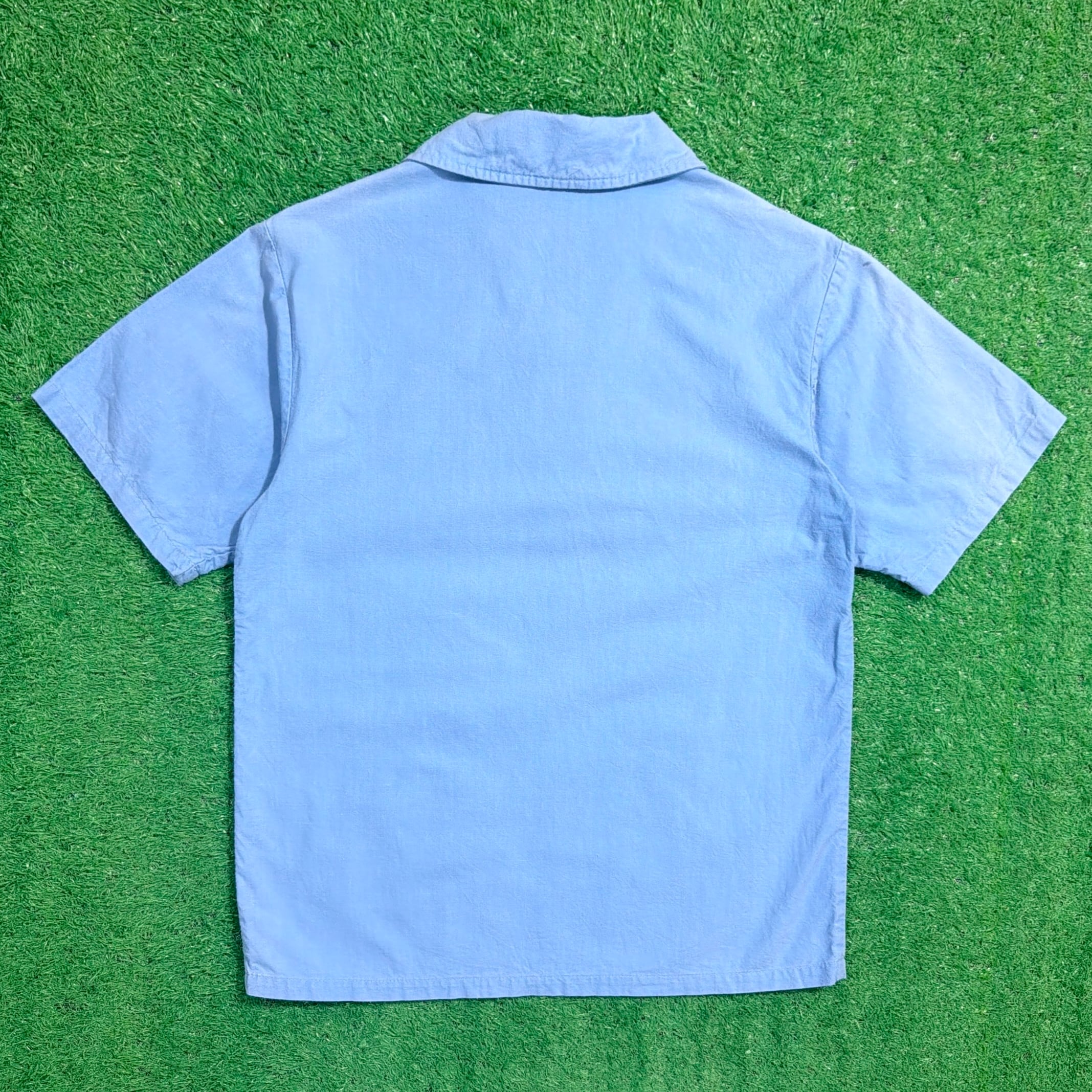 ポロシャツのようなデザインながら、シャツ素材で仕立てられたプルオーバータイプの一枚。開襟仕様で、リラックス感のある雰囲気が特徴です。