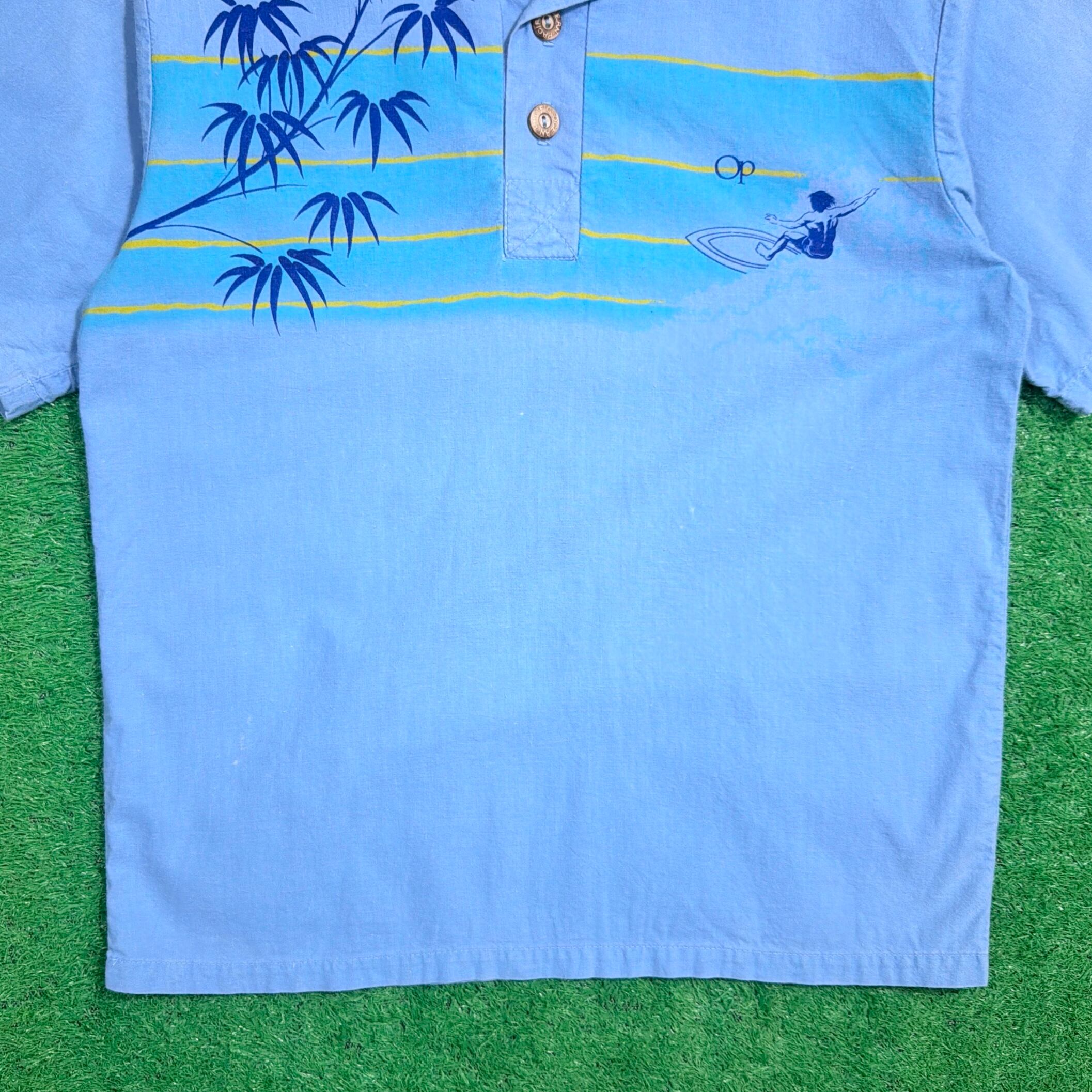 フロントにはヤシの木や海をイメージしたグラフィックが入り、OPらしいサーフテイスト全開のデザイン。淡いブルーカラーと相まって、夏らしい軽やかな印象に仕上がっています。