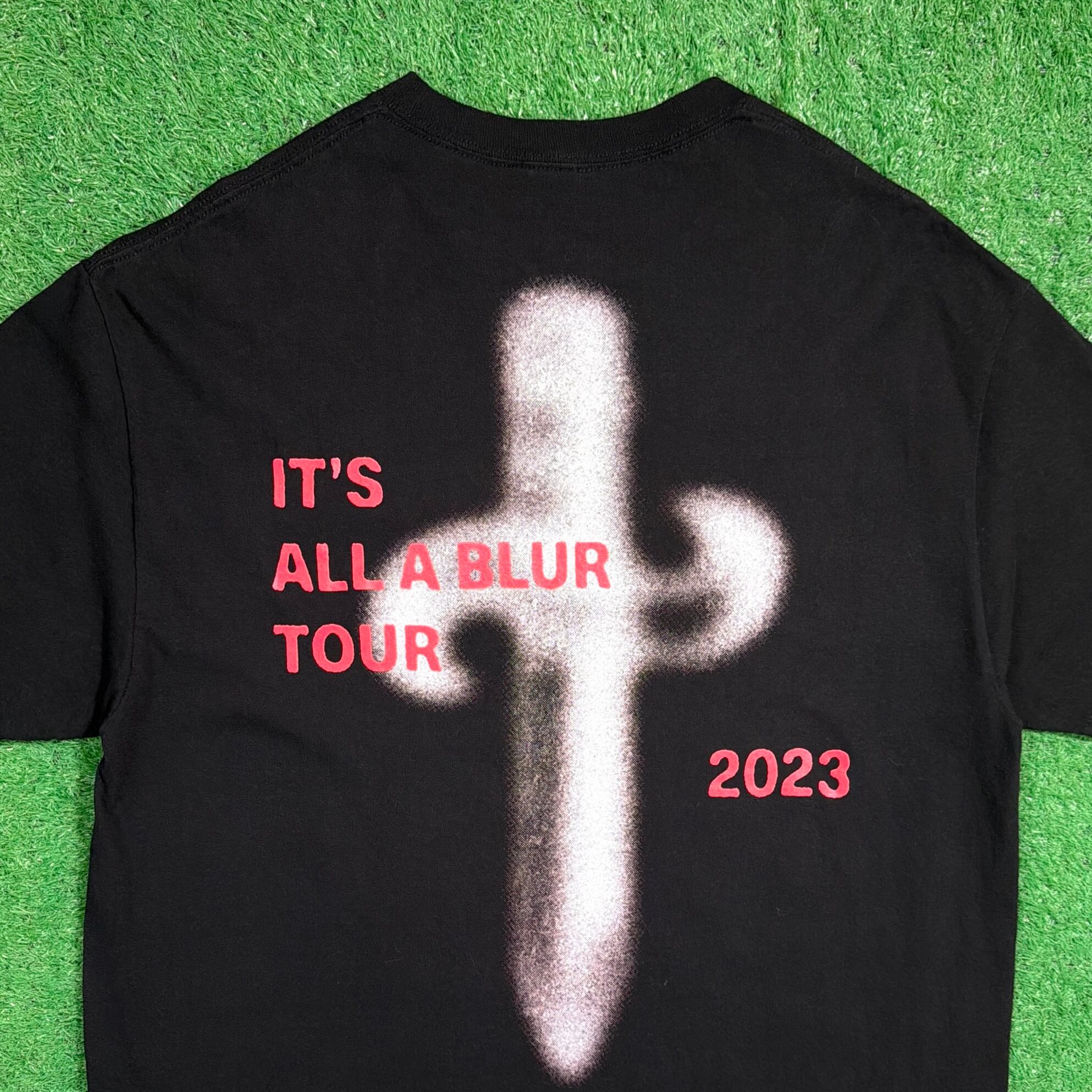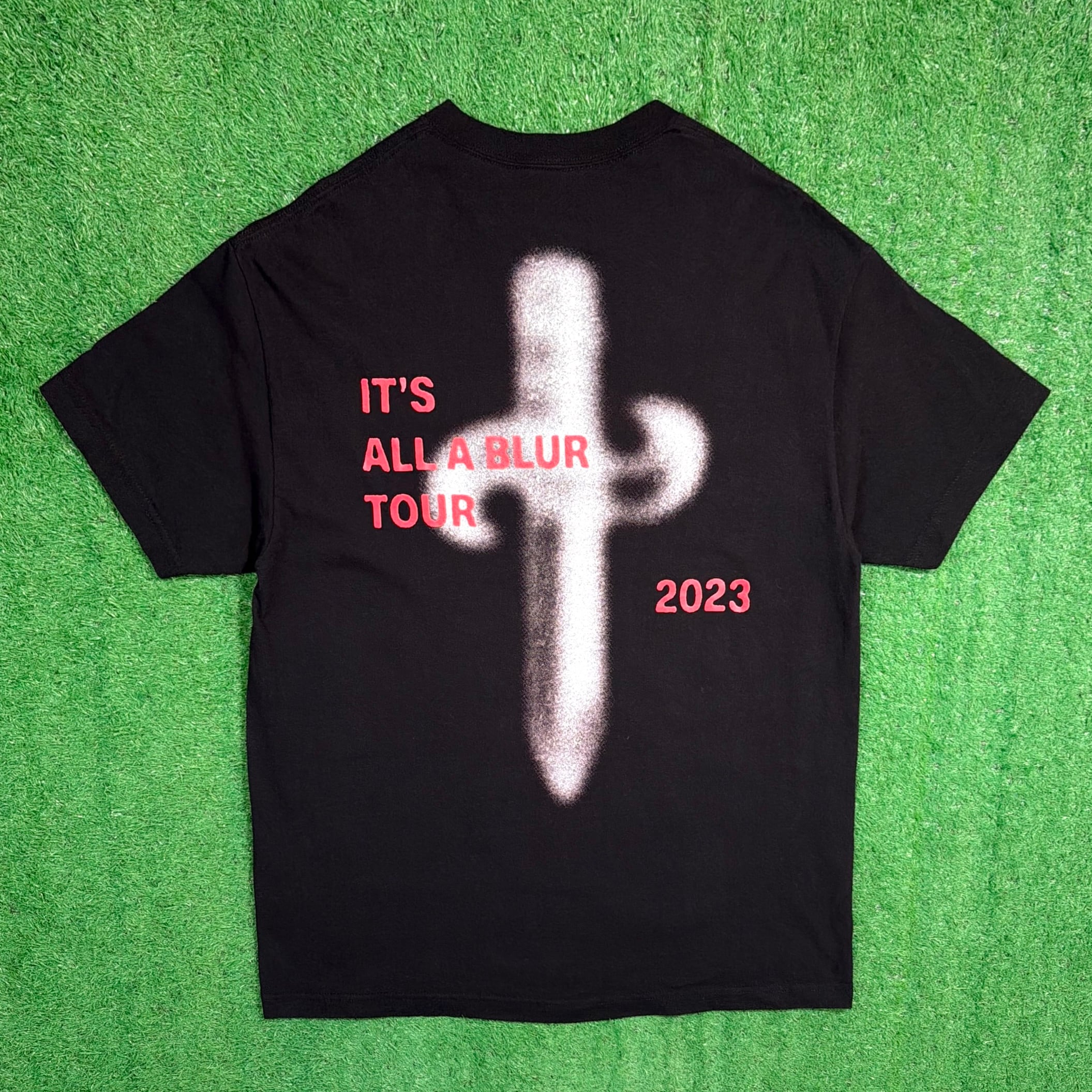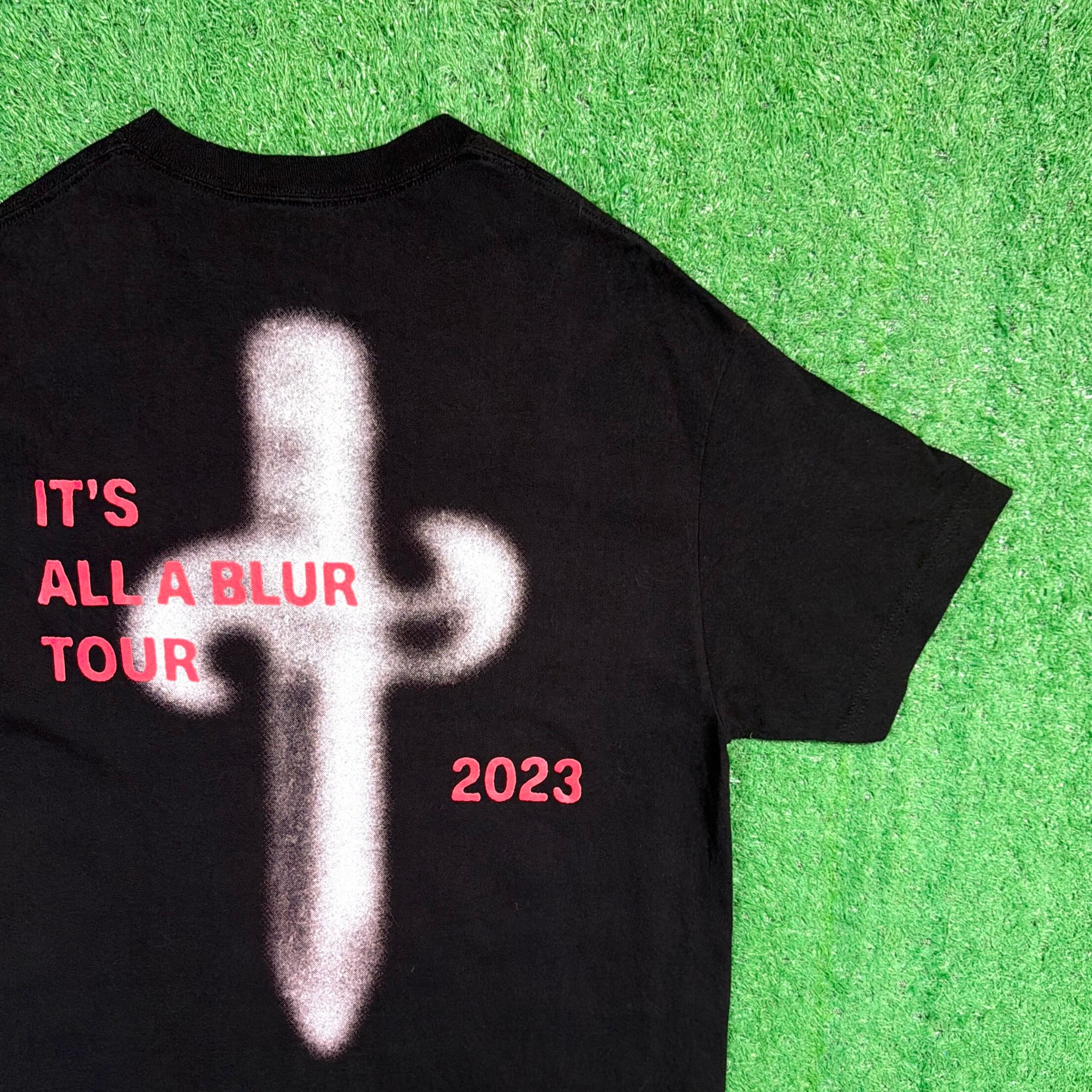 フロントには21 Savageのフォトプリントが大胆に配置され、バックには「IT'S ALL A BLUR TOUR 2023」のグラフィックが入ったインパクトのあるデザイン。シンプルながらも存在感があり、ストリート感の強い一枚です。