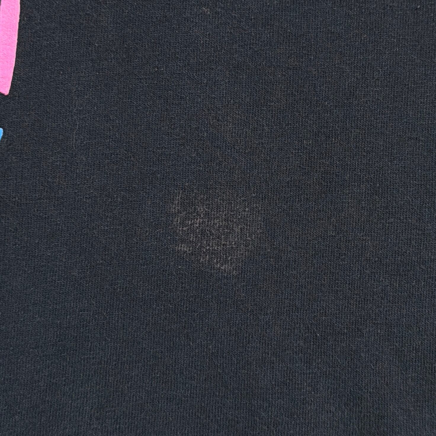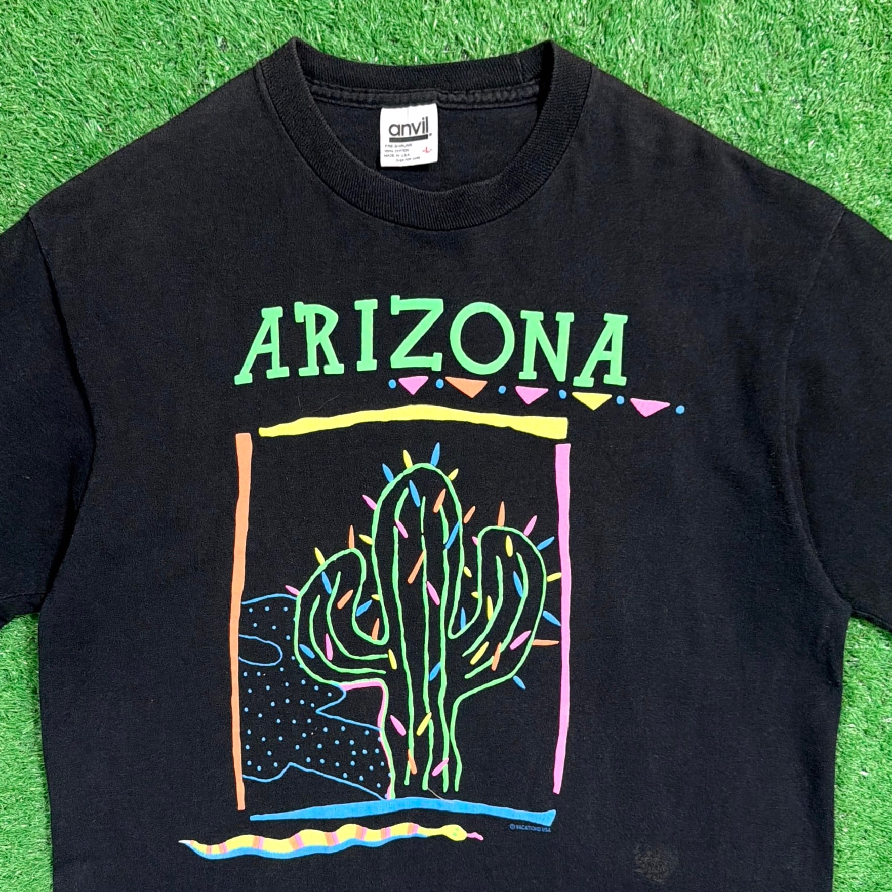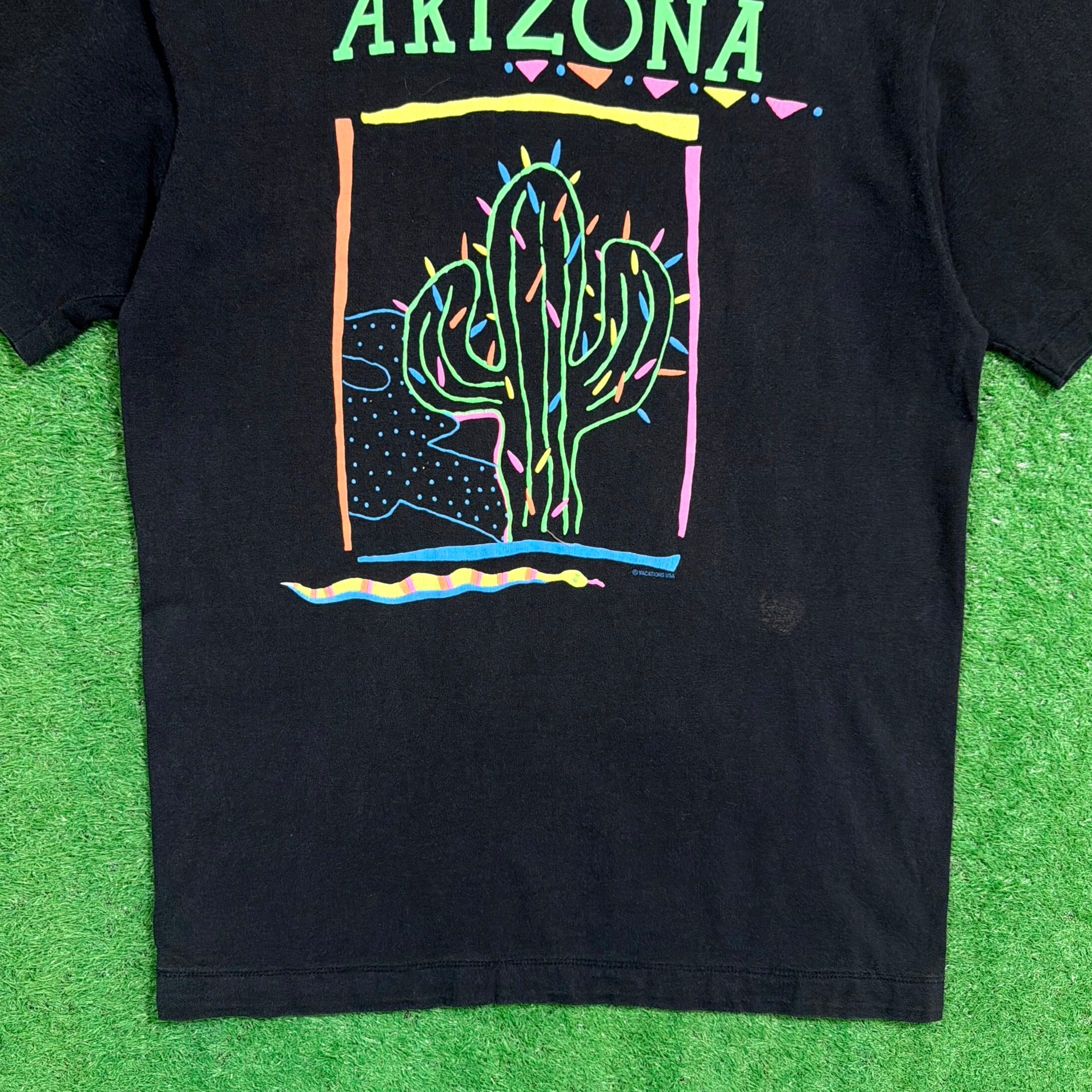 「ARIZONA」の文字とともに、大きくサボテンが描かれたイラストが印象的な一枚。アメリカ・アリゾナ州の砂漠地帯をイメージしたデザインで、90年代らしいポップな配色も魅力です。ネオン調のカラーリングがブラックボディに映え、シンプルながらしっかり存在感のある仕上がり。アメリカのローカルカルチャーを感じられるグラフィックTです。