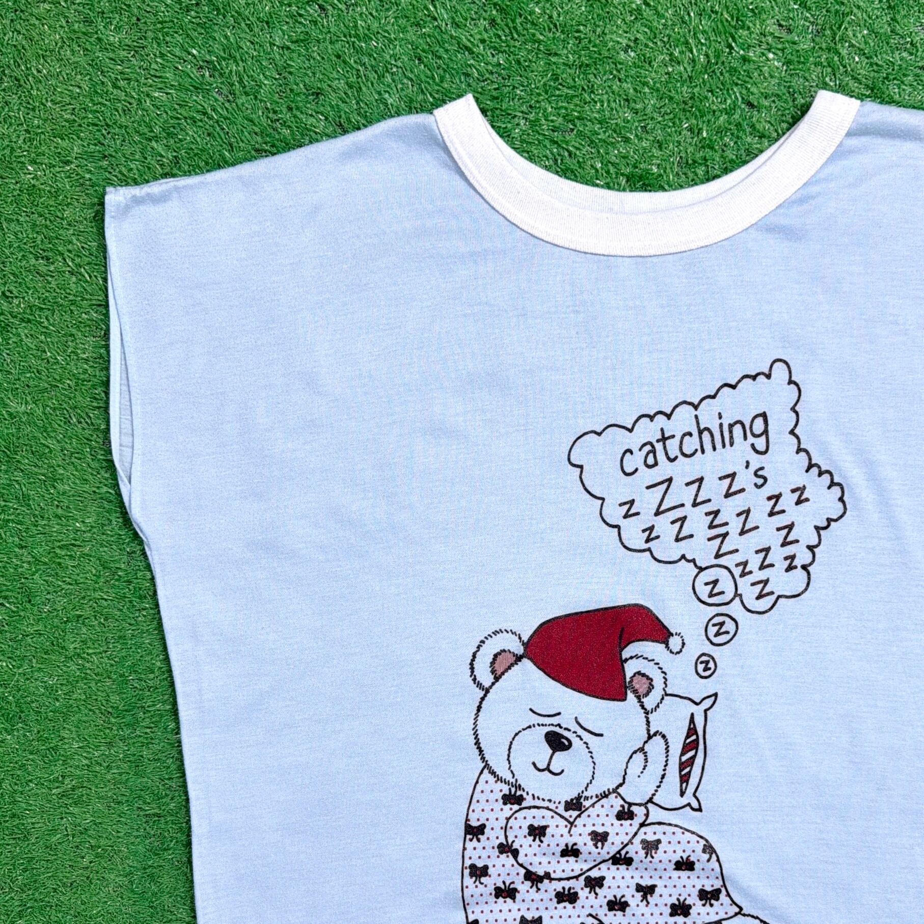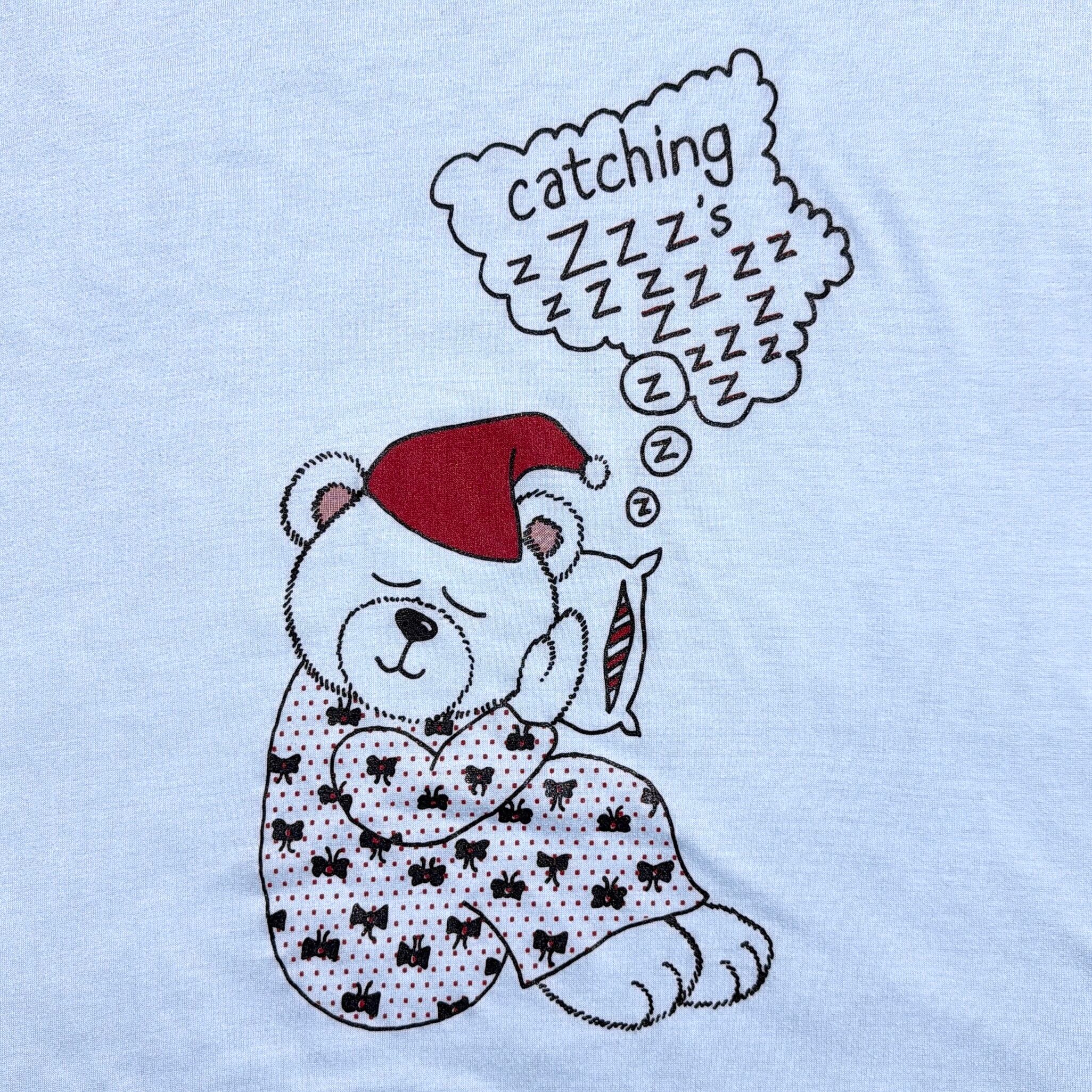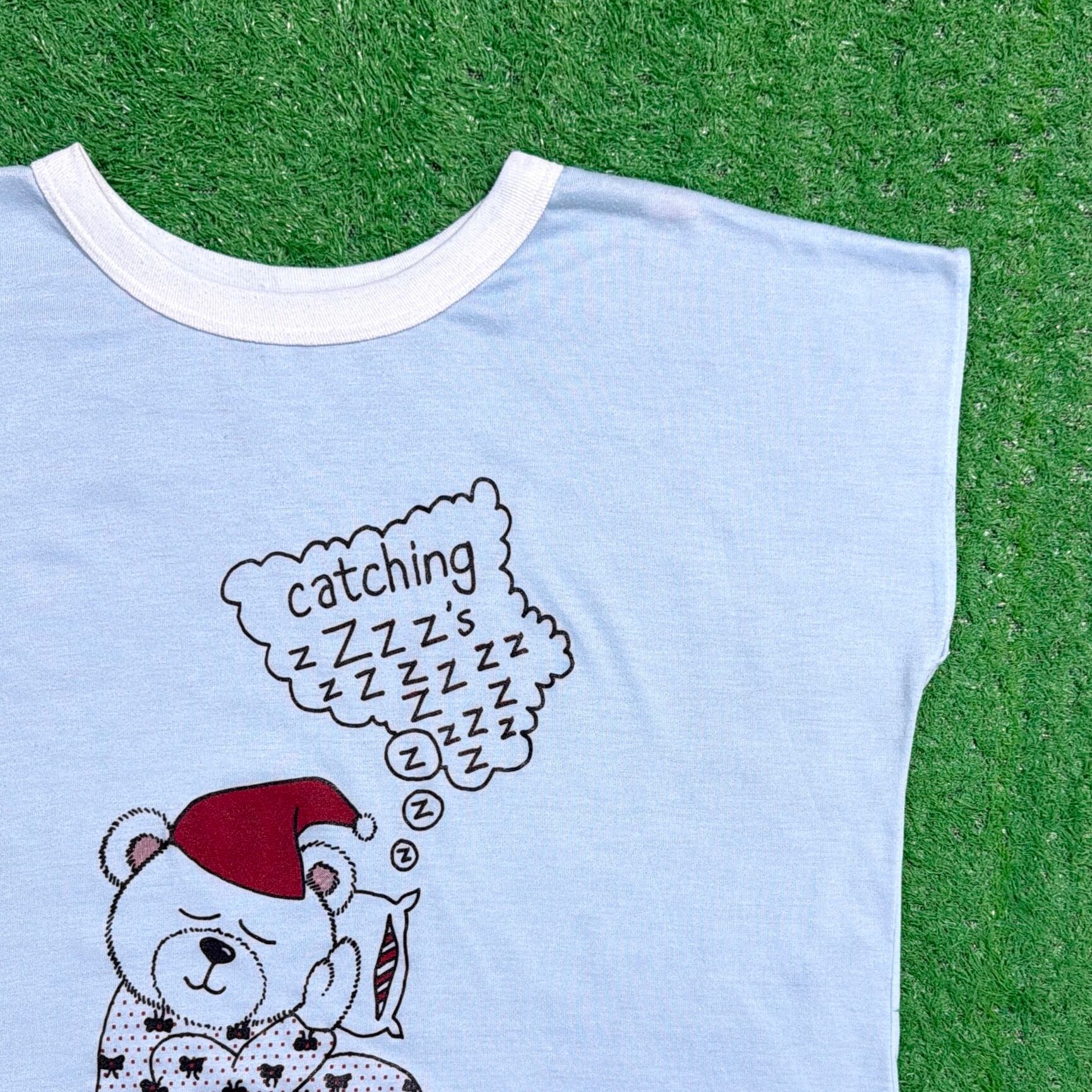 ナイトキャップ(スリープハット)をかぶったクマのイラストがプリントされた、どこかゆるくて愛らしいデザインが魅力の一枚。「Catching Zzz’s(ぐっすり眠る)」のメッセージも入っており、リラックスした雰囲気が漂います。