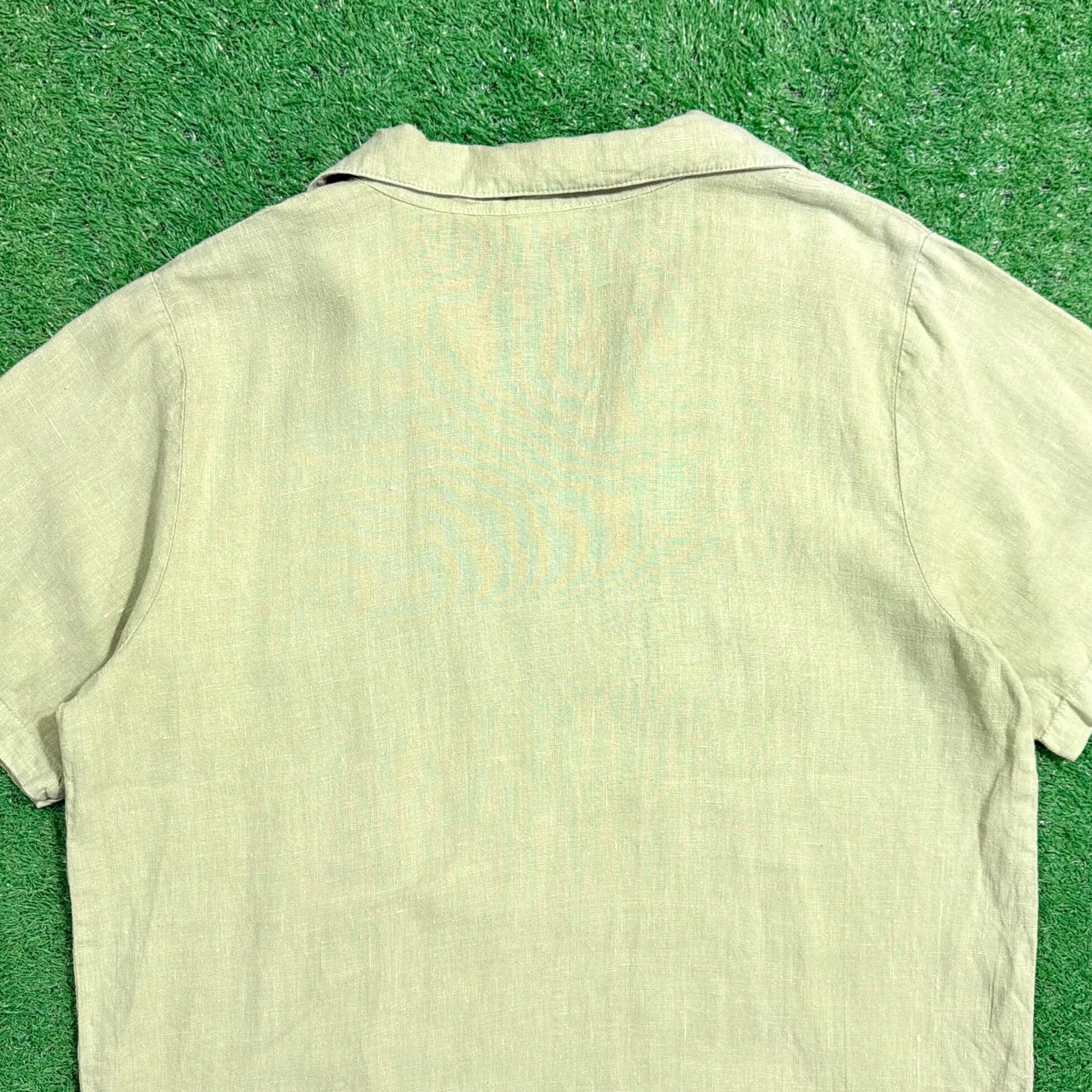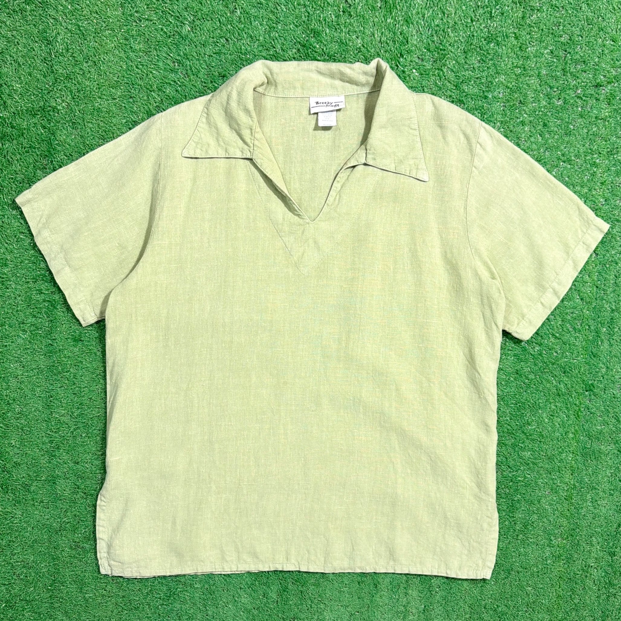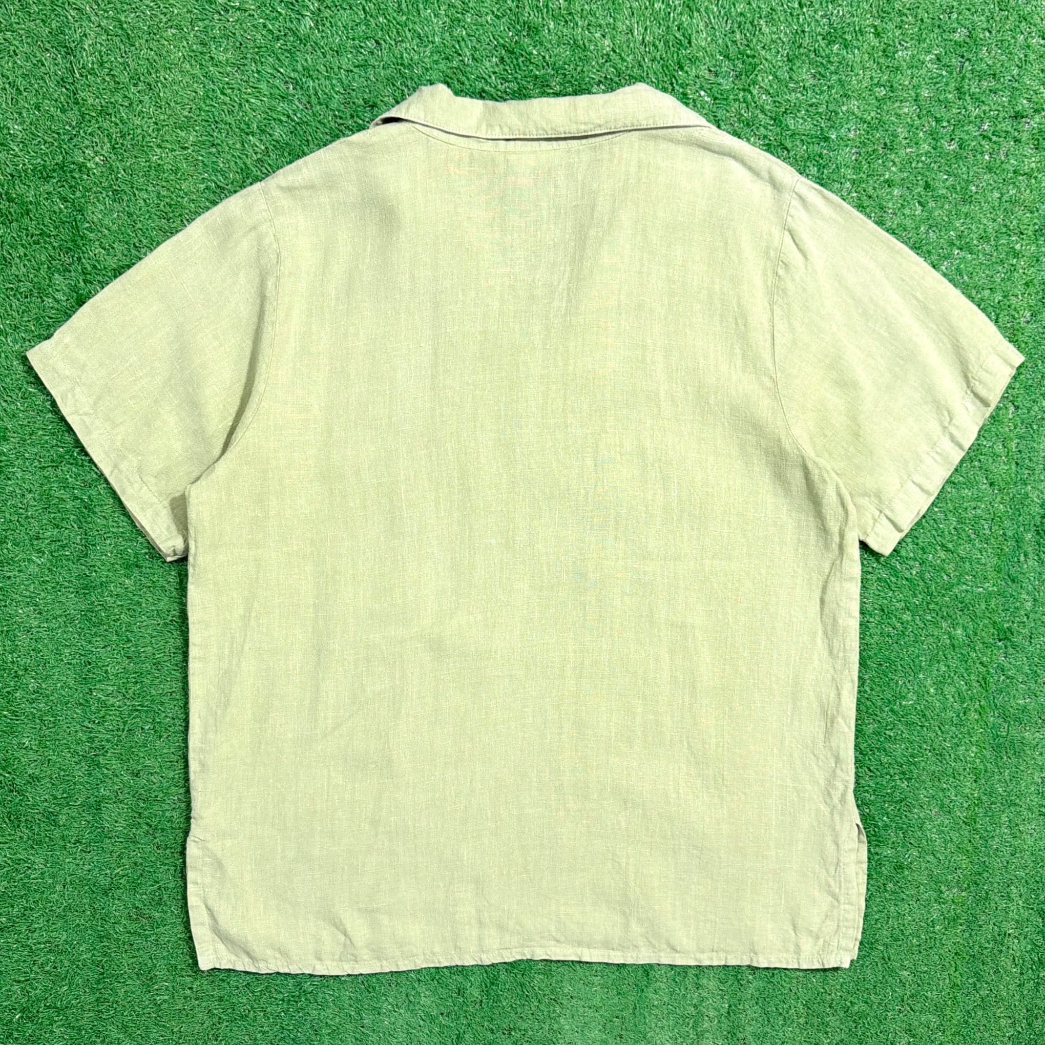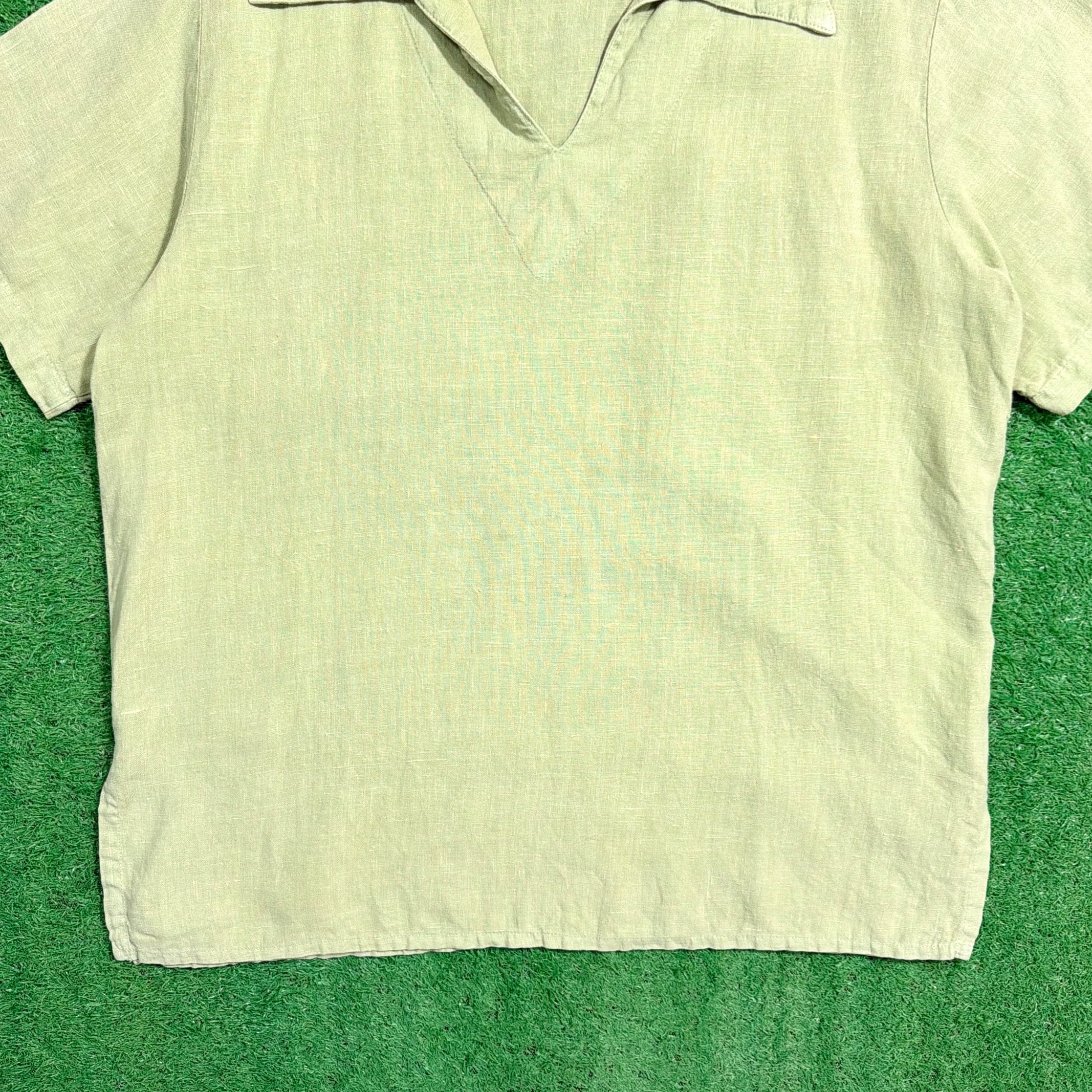 淡いライトグリーンのカラーが印象的で、涼しげでやわらかい雰囲気の一枚。リネン特有の軽やかでさらっとした素材感が魅力で、暑い季節にも快適に着用できます。