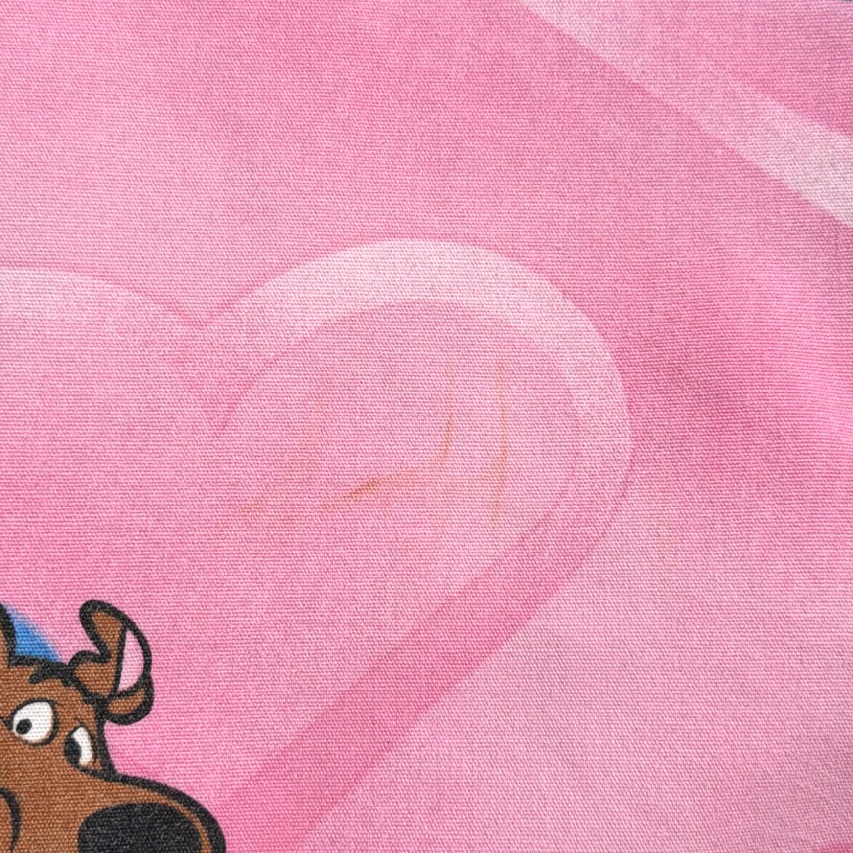 ピンクベースに、スクービー・ドゥーのキャラクターが総柄でプリントされたポップなデザイン。遊び心のある雰囲気が魅力の一枚です。