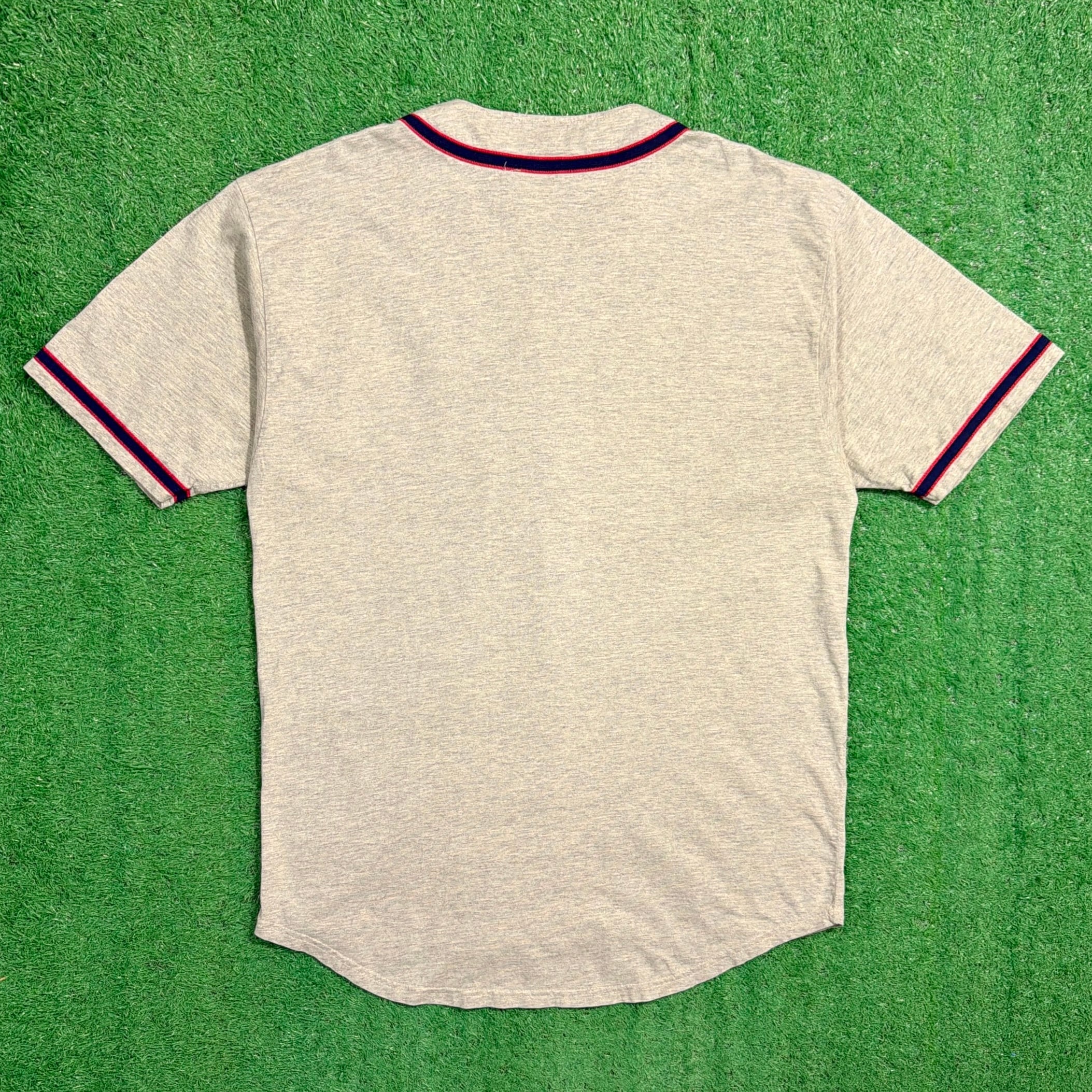 ベースボールシャツ仕様のデザインで、パイピングやボタンフロントが特徴的。Tシャツ感覚で着られる柔らかい素材感ながら、スポーティーな雰囲気も楽しめます。