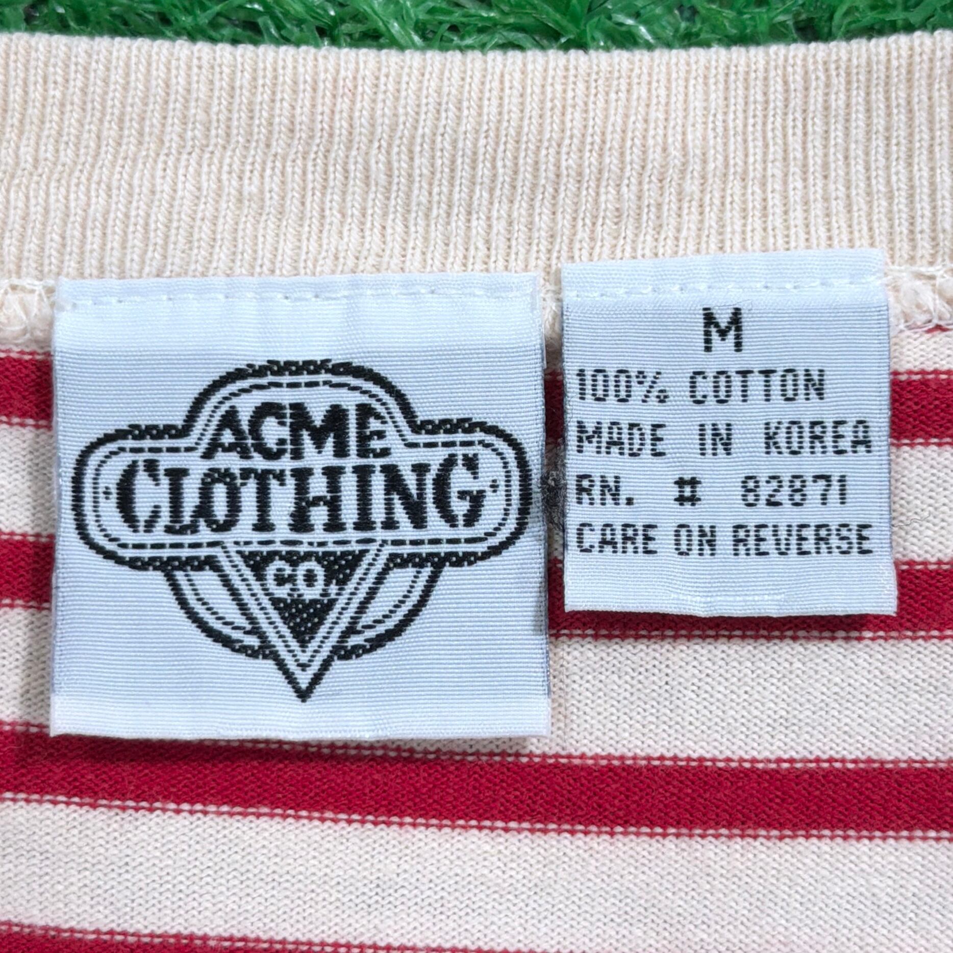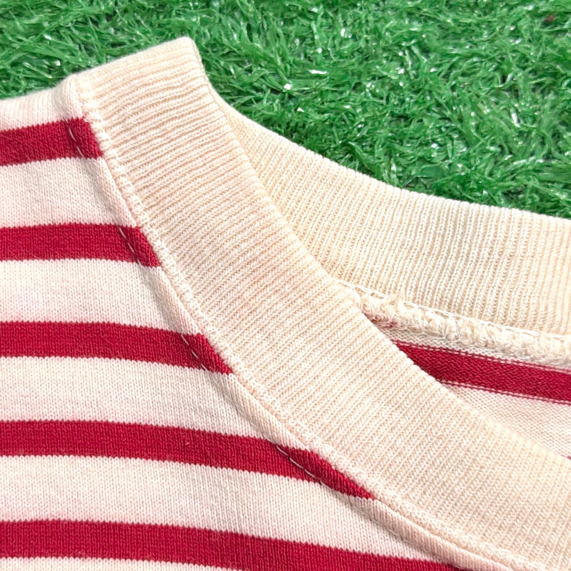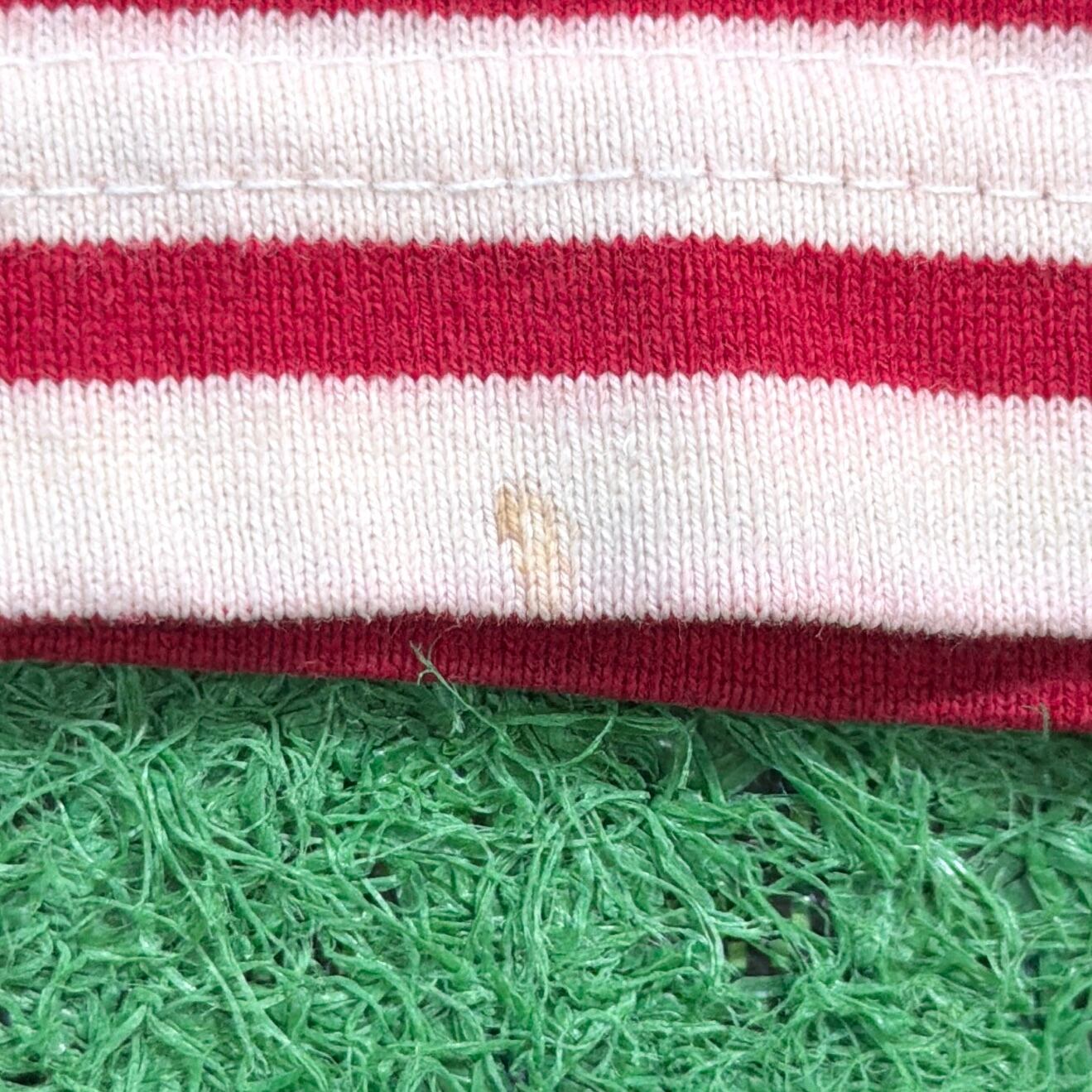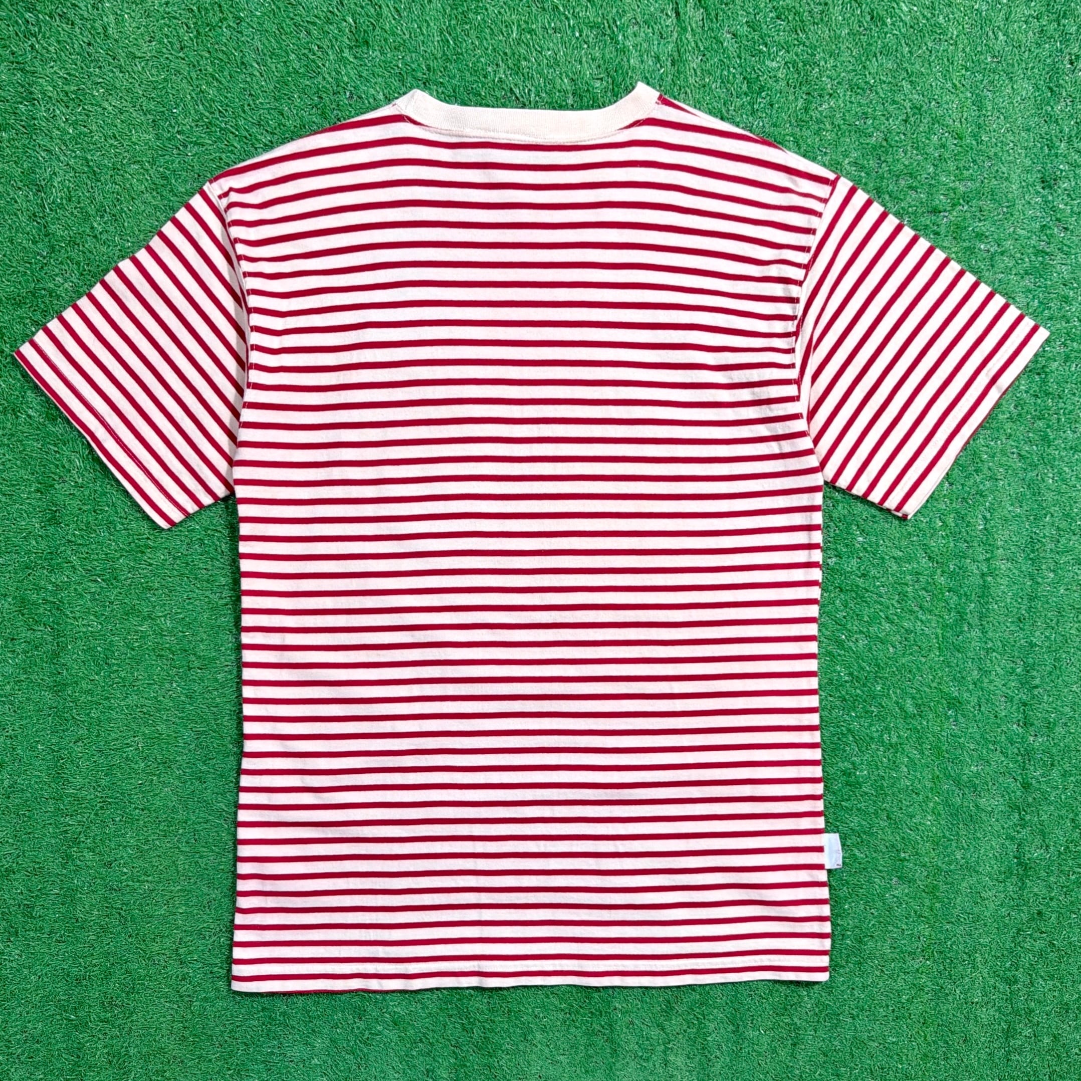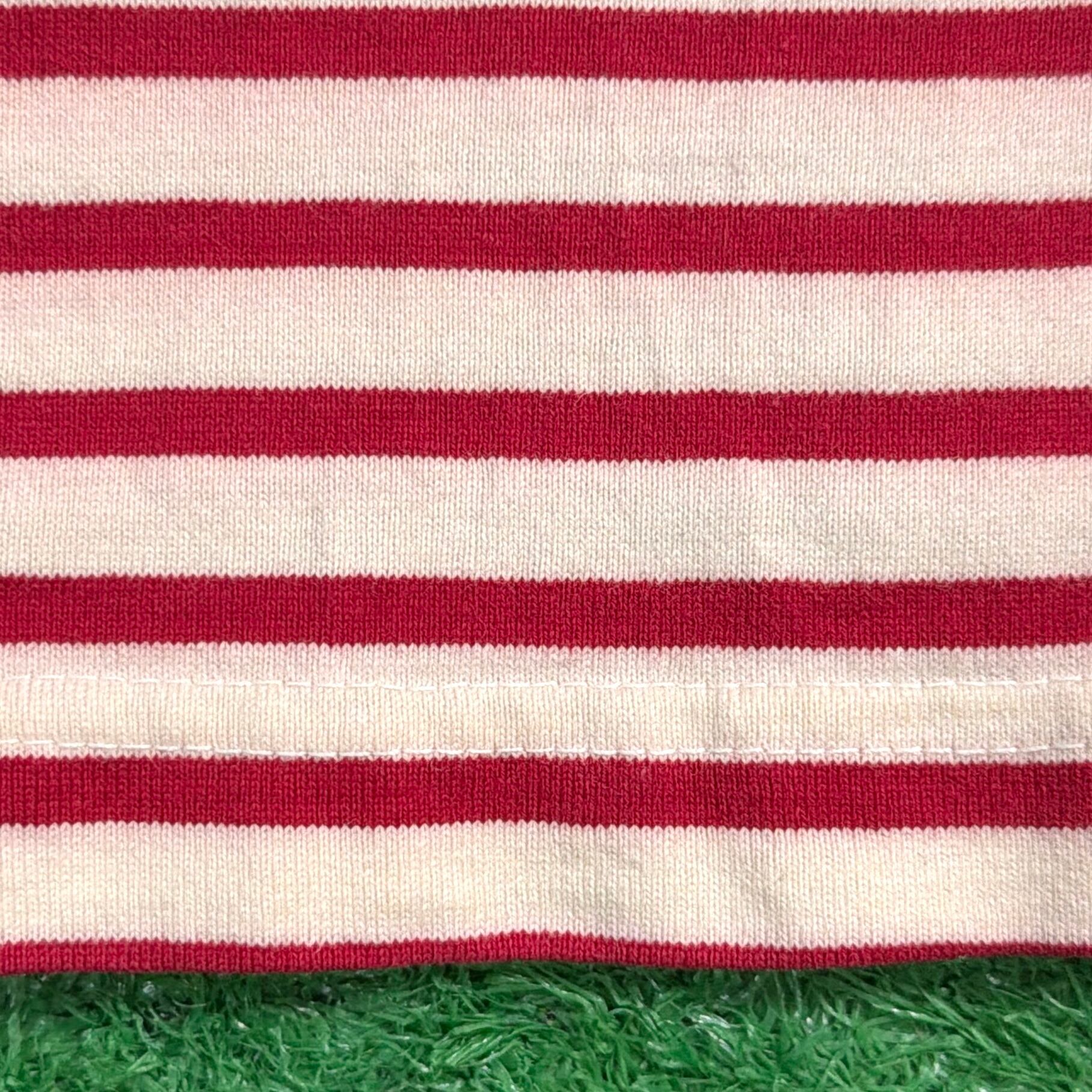 レッド×ホワイトのボーダーボディに、胸元にはBugs Bunnyの刺繍が入る遊び心のある一着。