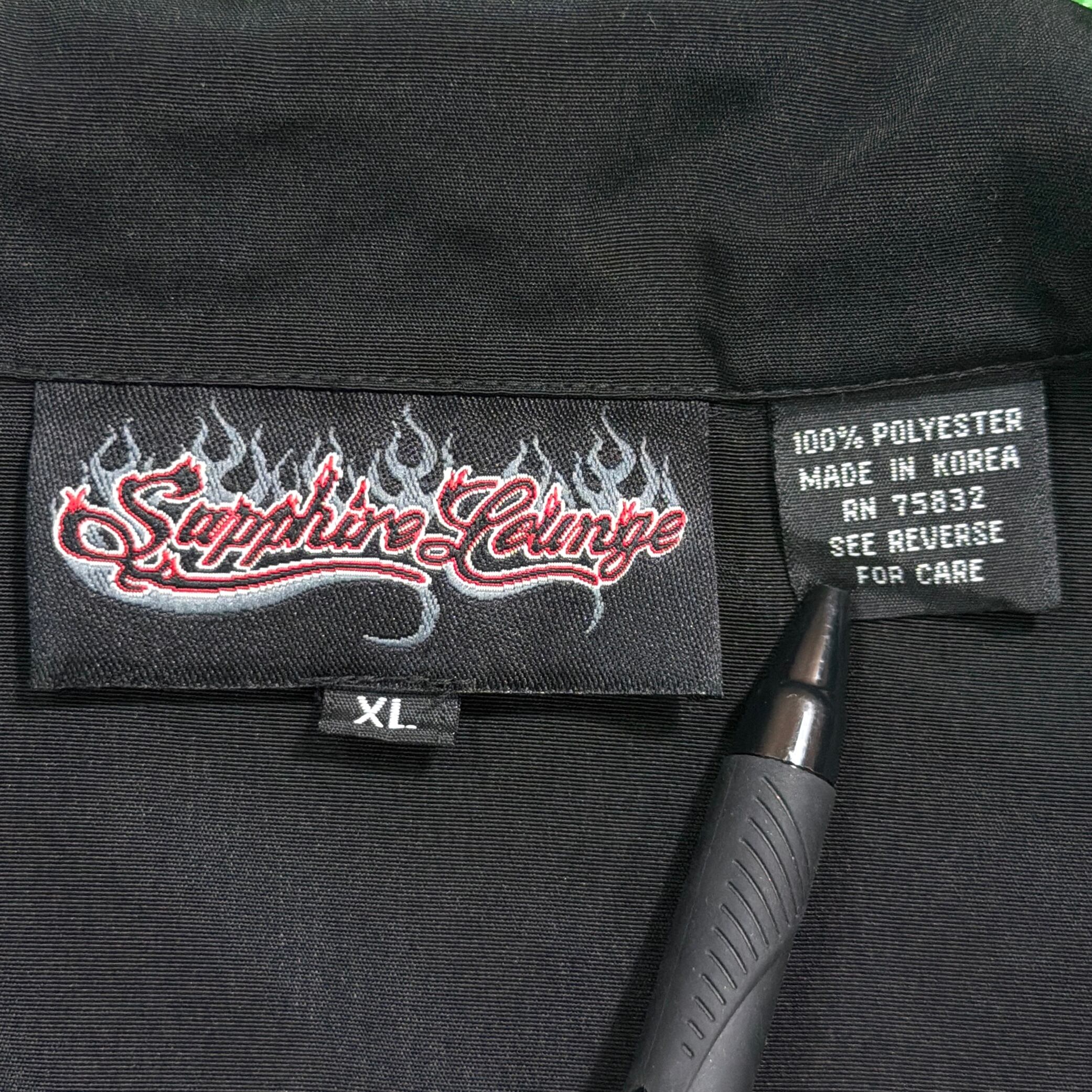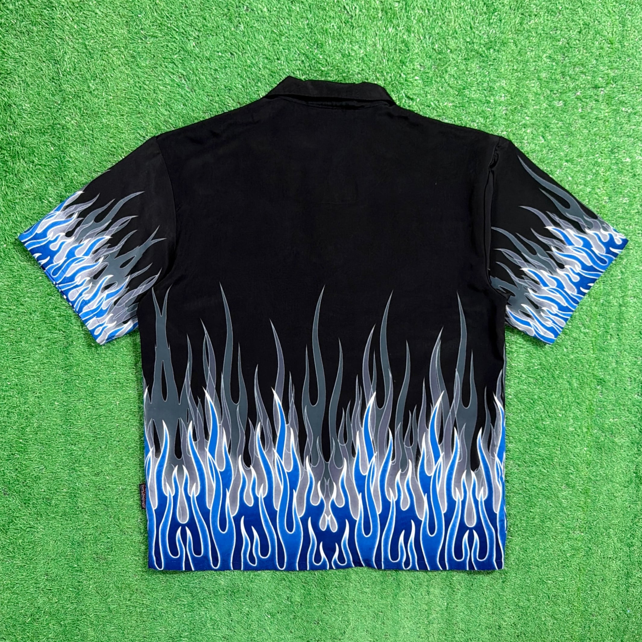 ブラックボディの裾から袖にかけて広がる炎のグラフィックがインパクト抜群の一着。