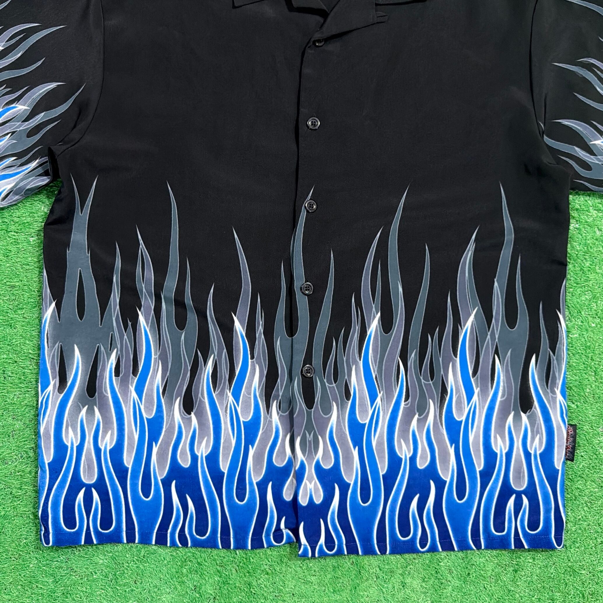 1990年代のファイヤーパターンのポリエステル開襟シャツです。