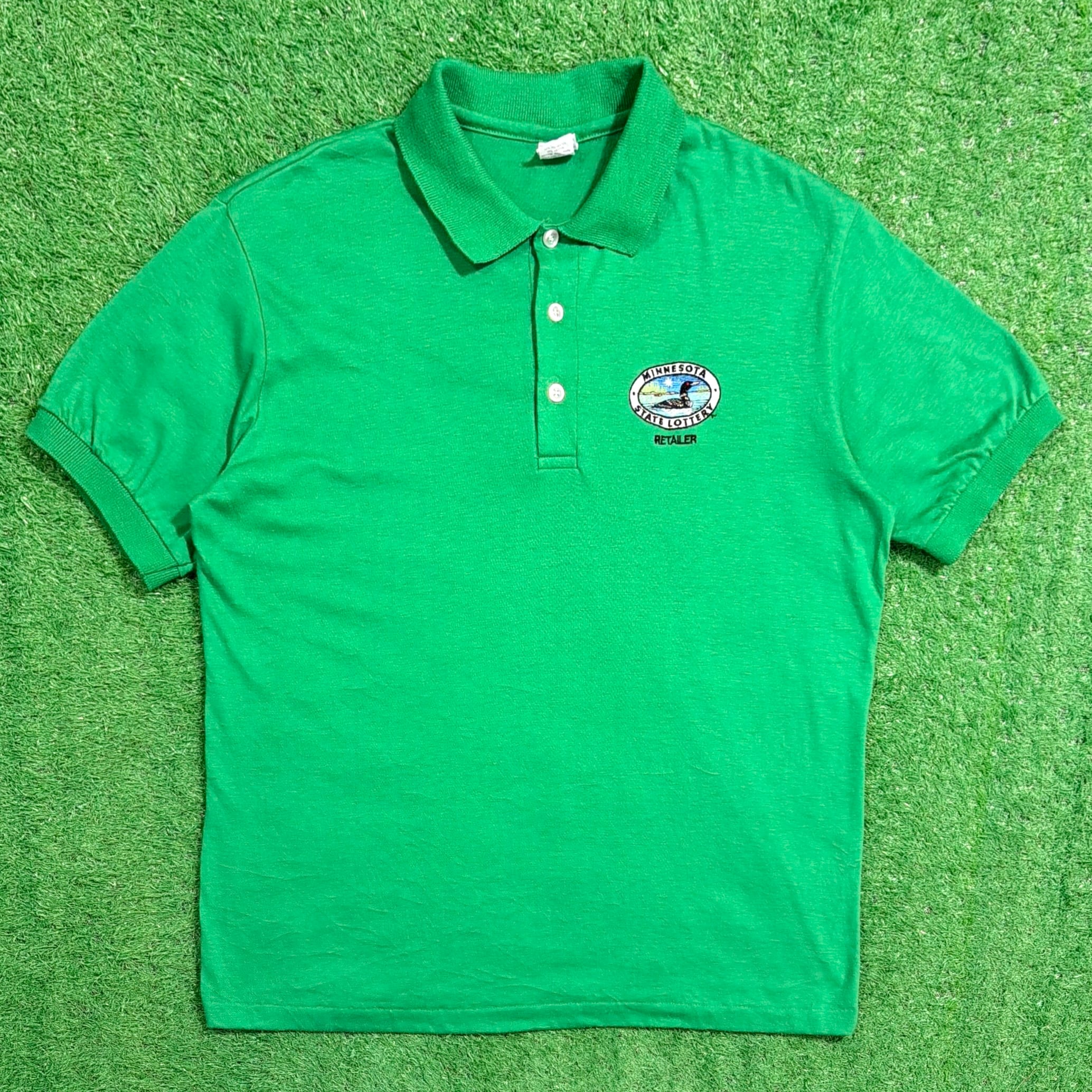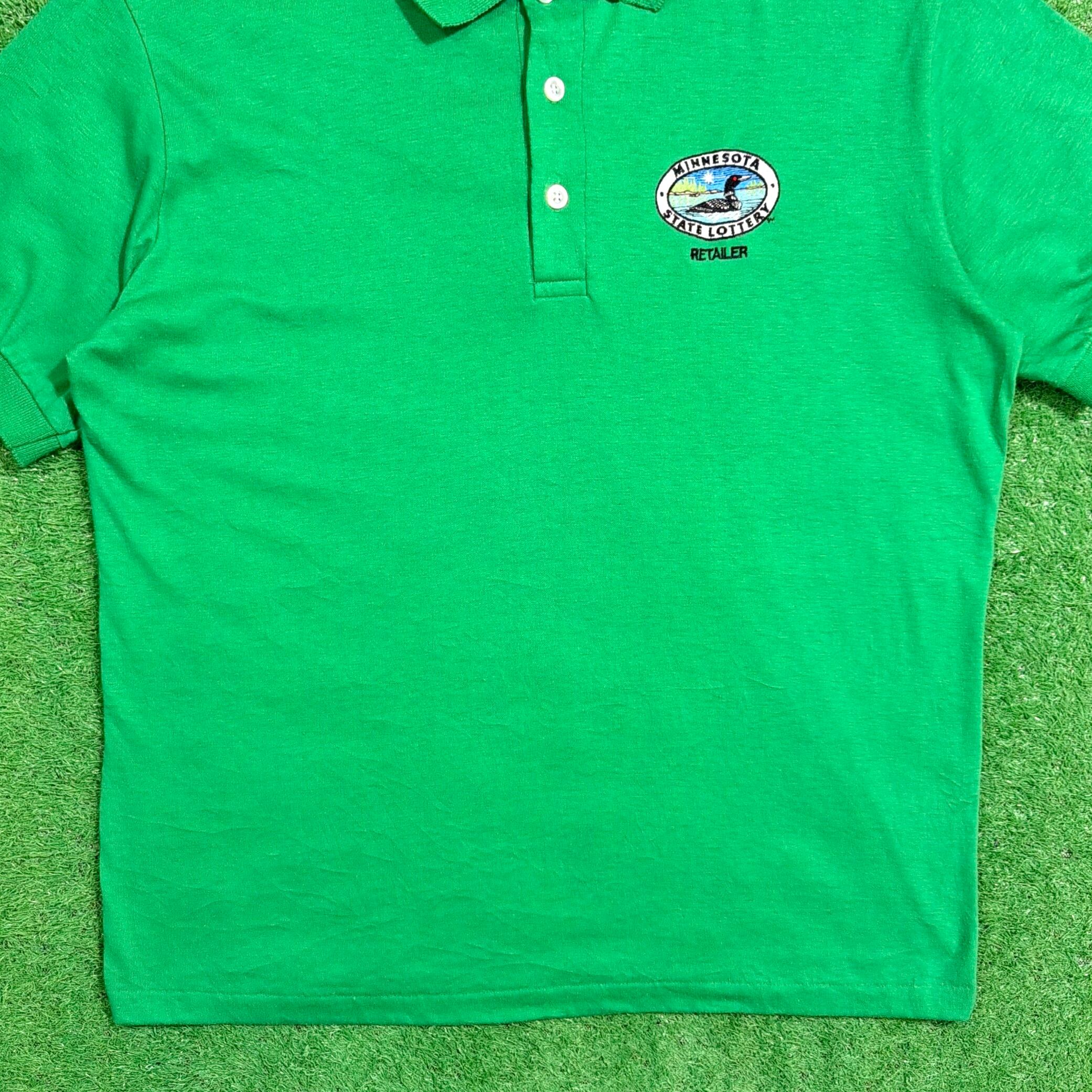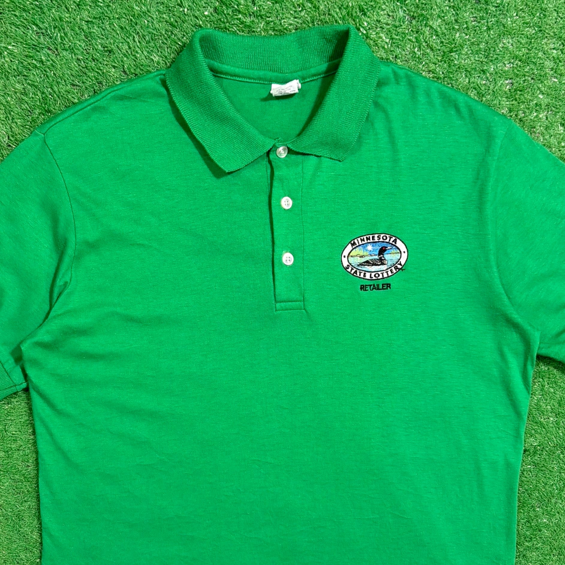 鮮やかなグリーンカラーに、胸元の刺繍デザインがアクセントになった1枚。アメリカ・ミネソタ州の「STATE LOTTERY(州の宝くじ)」のロゴが入った、ローカル感のあるアイテムです。