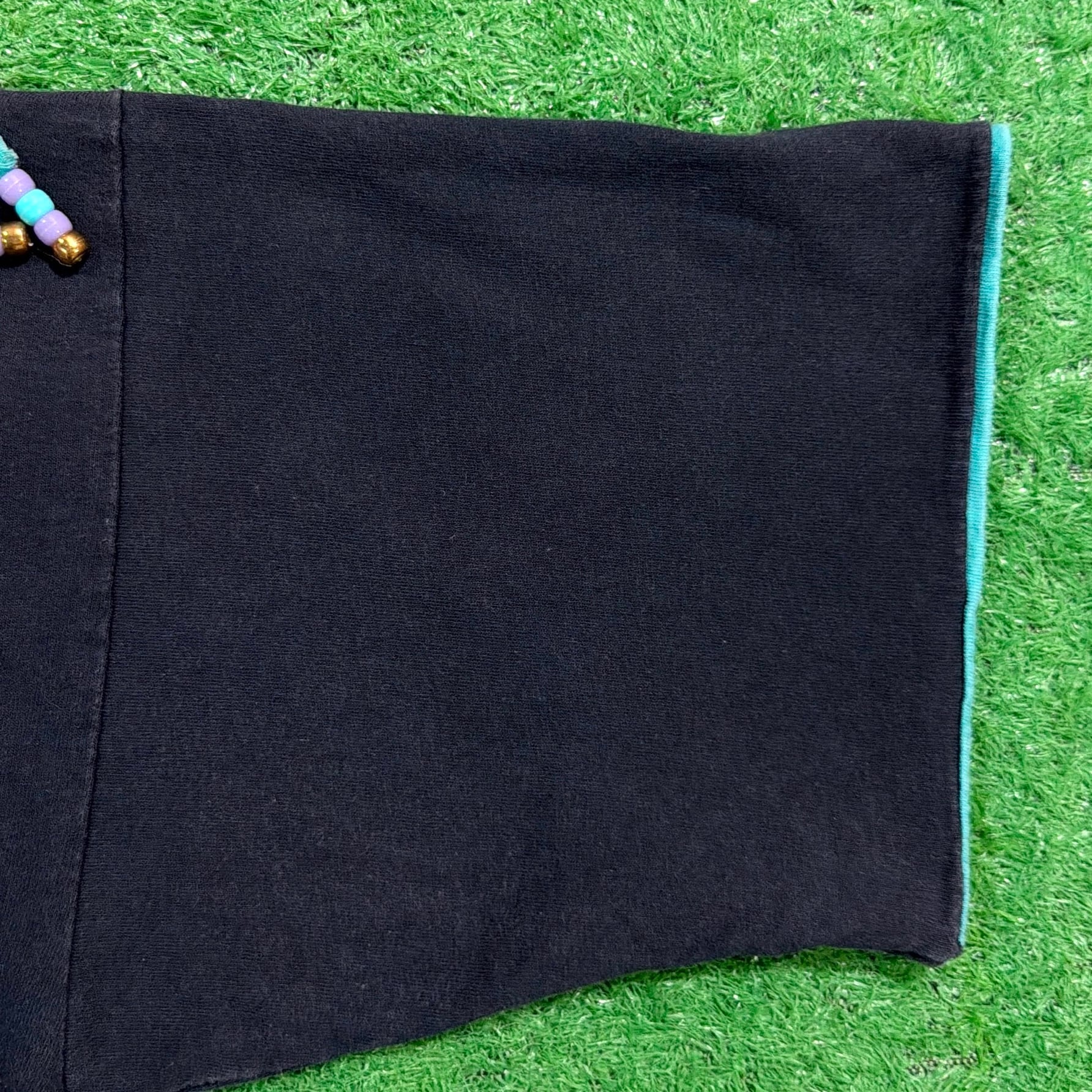 ブラックボディにターコイズ系の配色が映え、ウエスタンやネイティブテイストをしっかり感じられる仕上がり。古着らしい個性のあるデザインが魅力の1枚です。