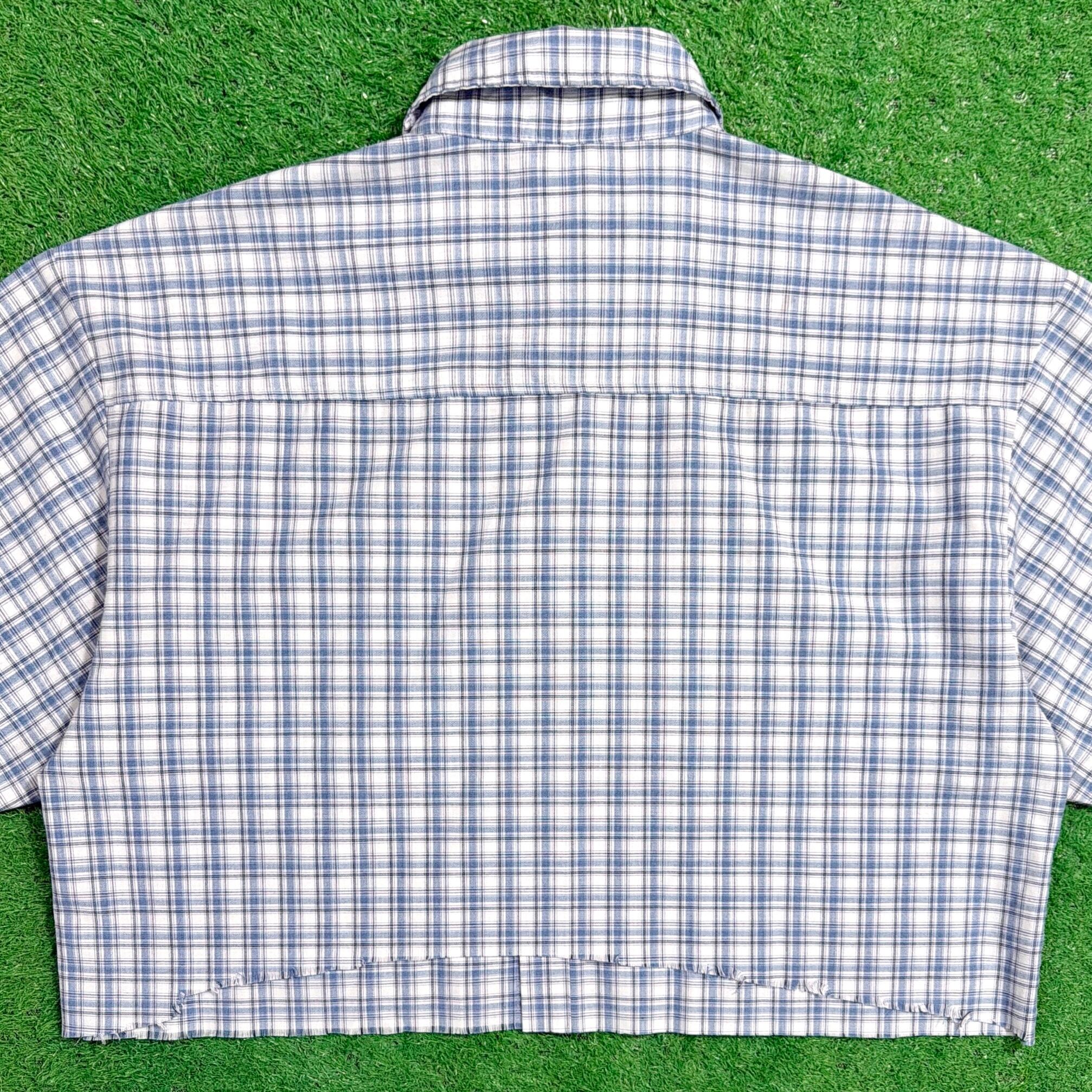 オーバーサイズの半袖シャツをカットオフして、ショート丈に仕上げたリメイクデザインが特徴的な一枚。ラフにカットされた裾の雰囲気も相まって、こなれた印象で着られるアイテムです。