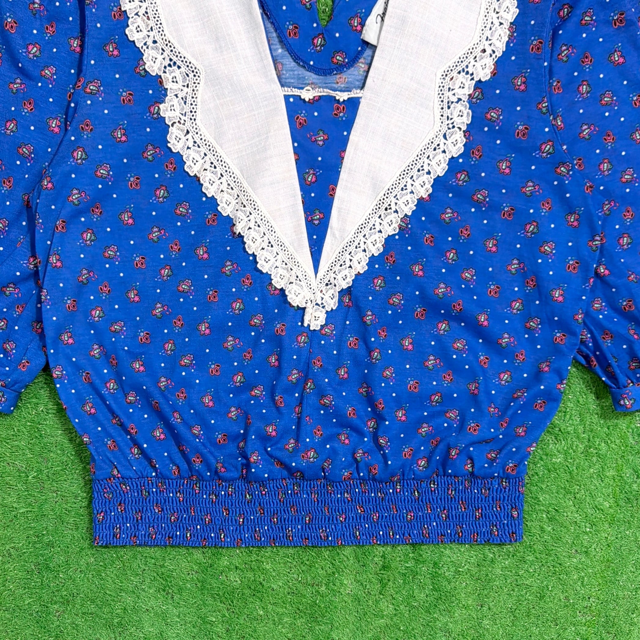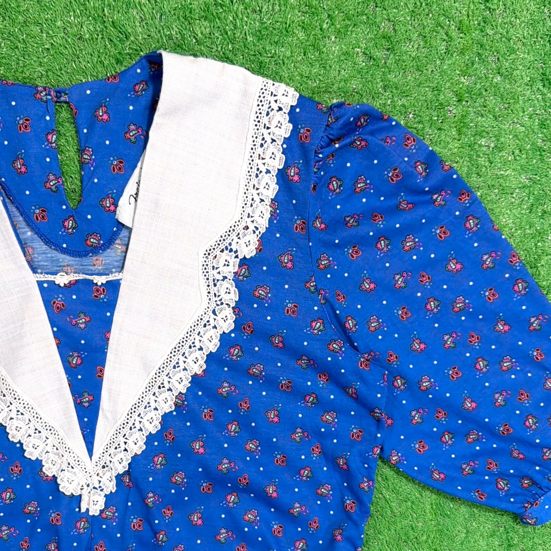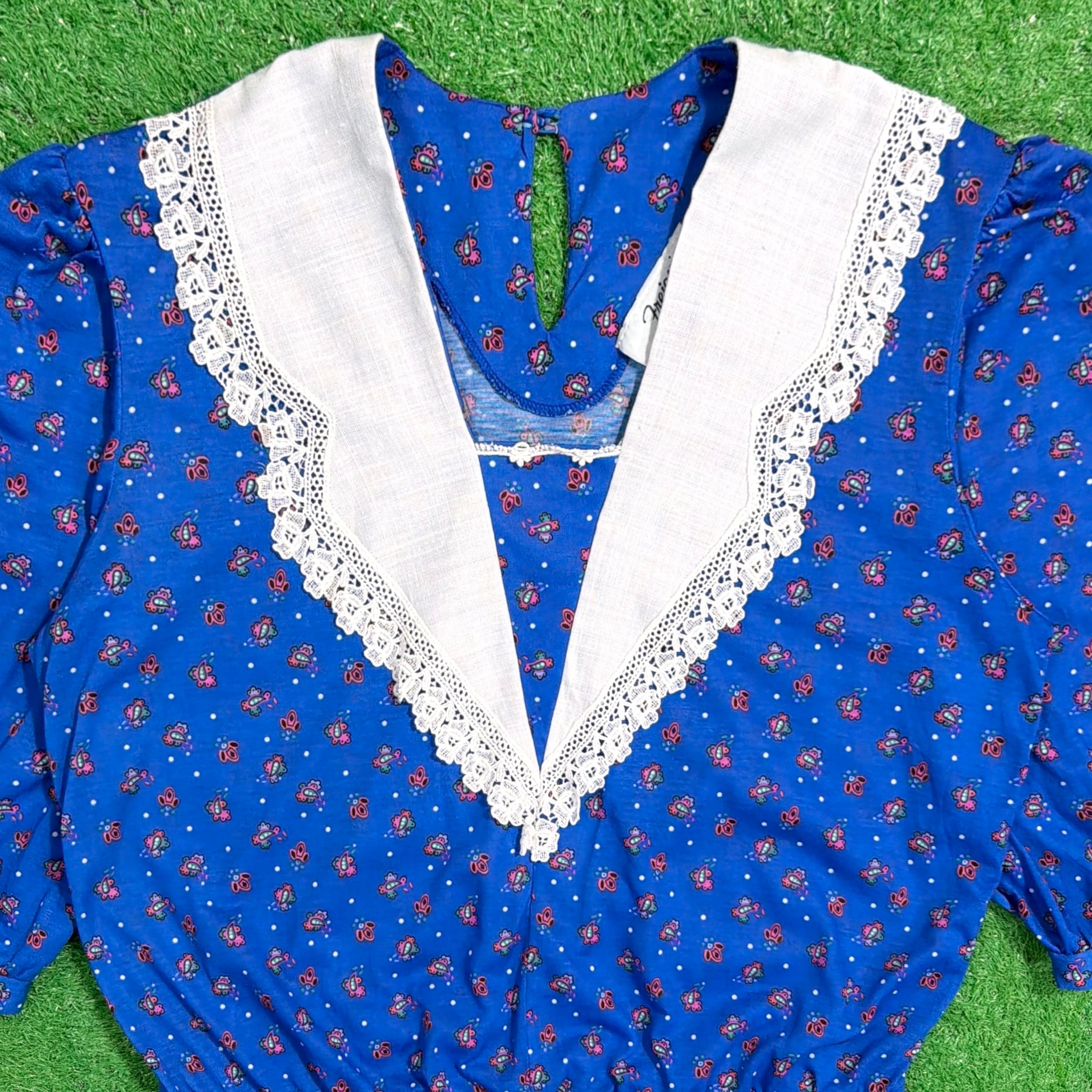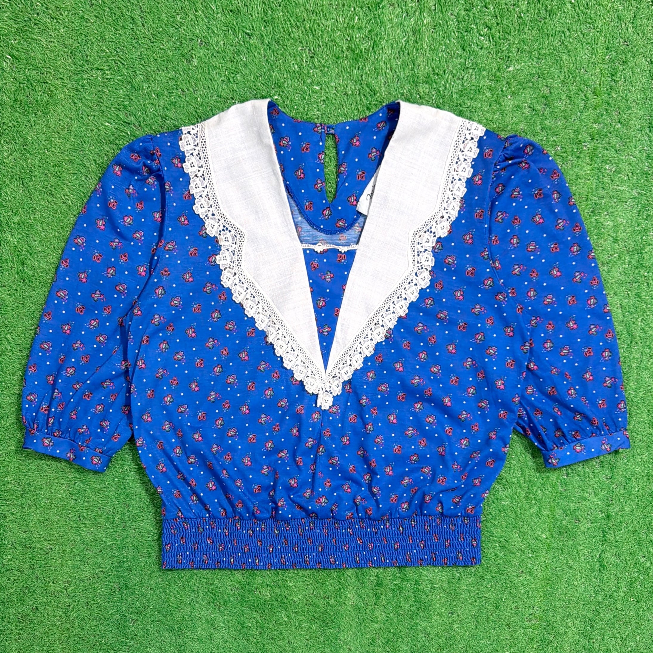 鮮やかなブルーベースに小花のような総柄が入り、ヴィンテージらしい華やかな雰囲気の一枚。大きめのホワイトカラーにレースがあしらわれたデザインが特徴的で、しっかり存在感のある仕上がりです。